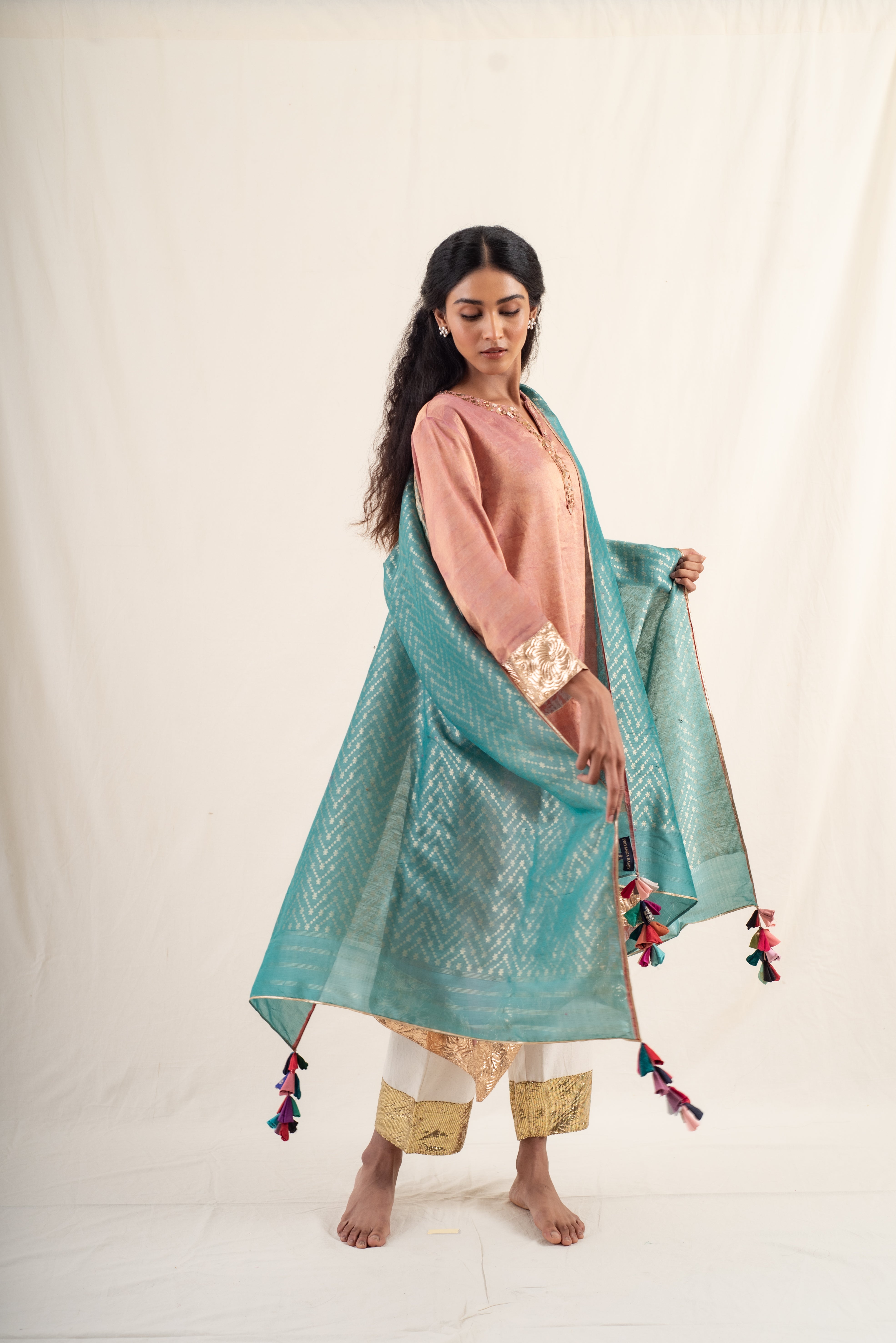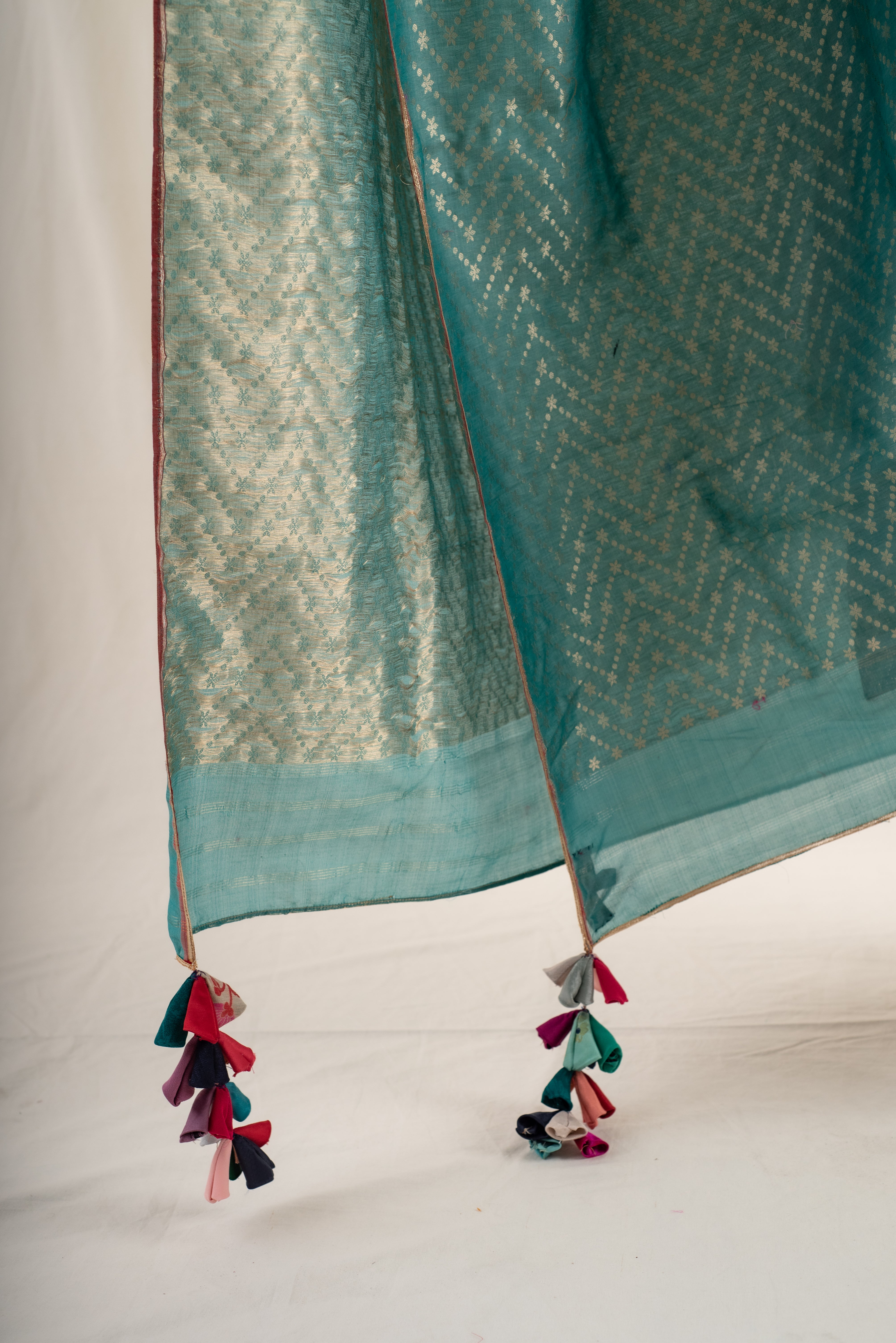 Teal green silk banarasi dupatta with woven geometric design all over with teal upcycled hand made tassels.