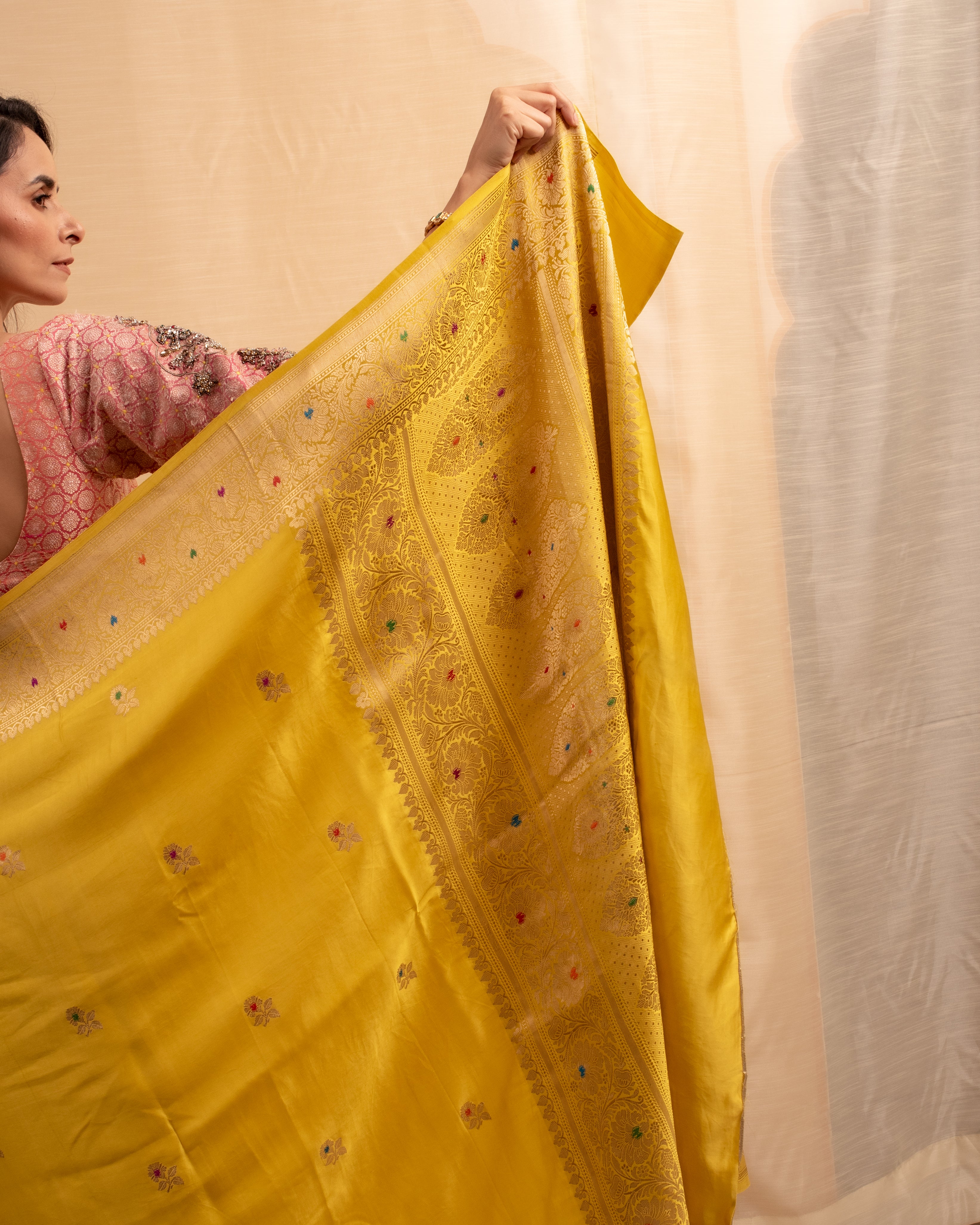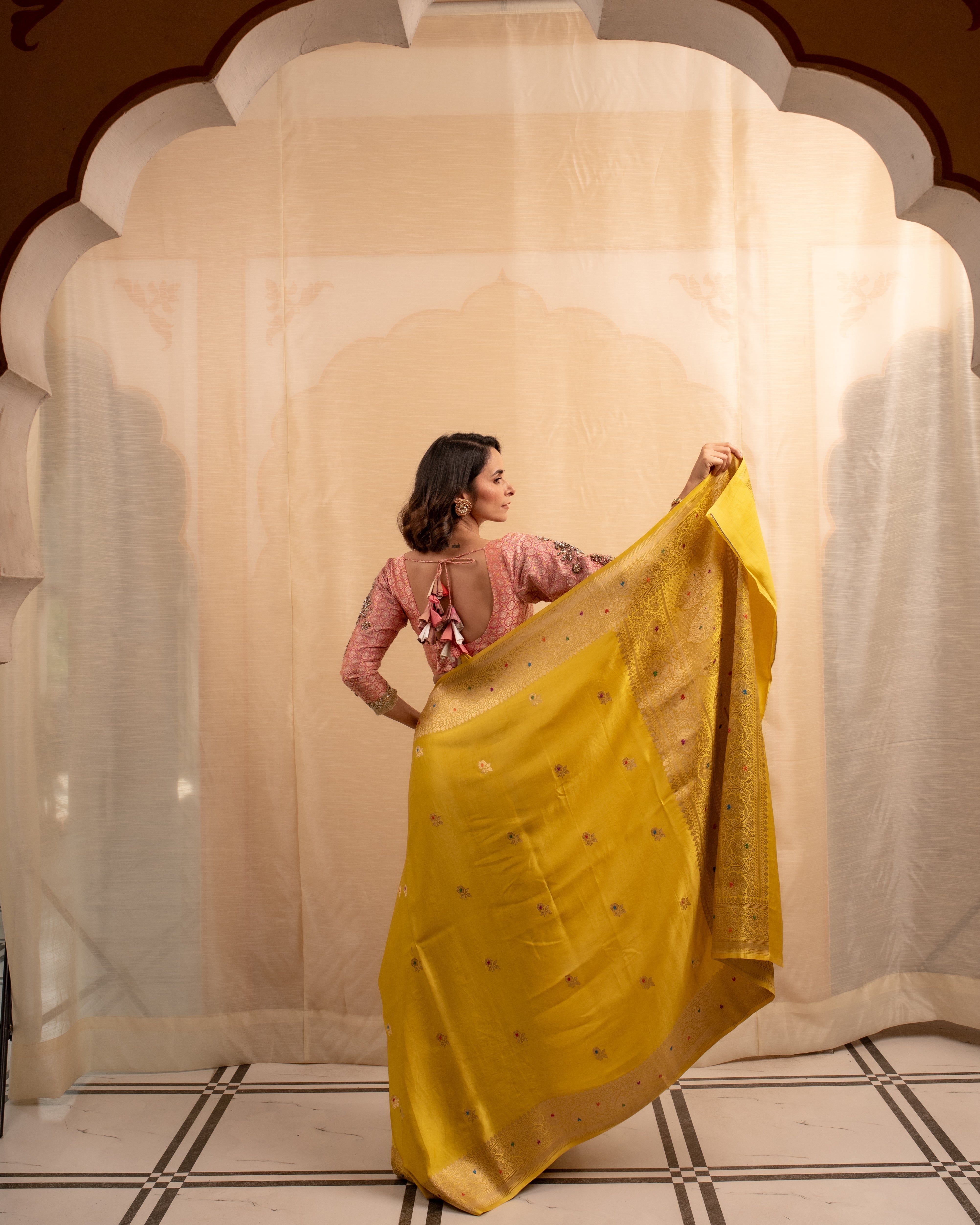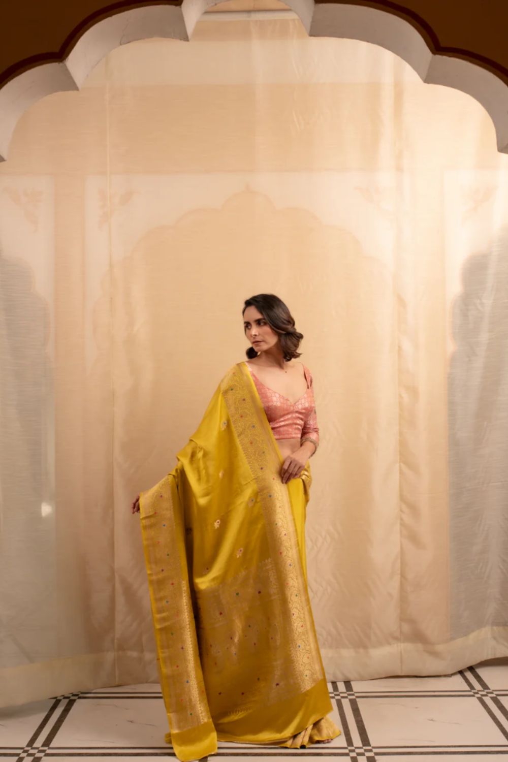 A Meenakari saree is not only a stunning addition to your closet that enhances beauty during festive occasions, but it also represents the rich cultural heritage through its intricate designs. With motifs that celebrate tradition and colors that shine with elegance, these Banarasi drapes are suitable for any season and ceremony. Whether worn for intimate rituals or grand soirées, a Meenakari saree offers a timeless elegance that elevates every moment, making it more radiant and uniquely you.