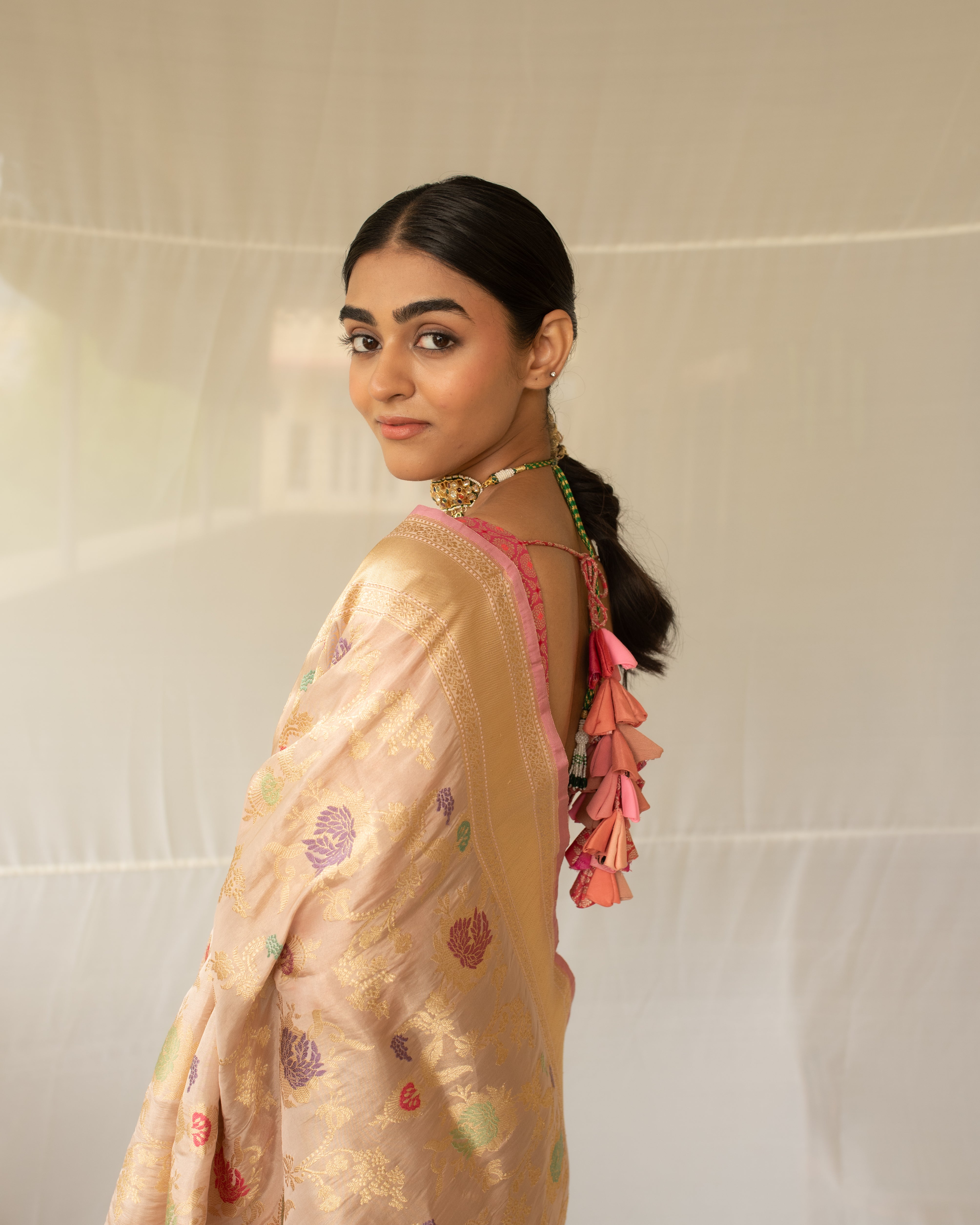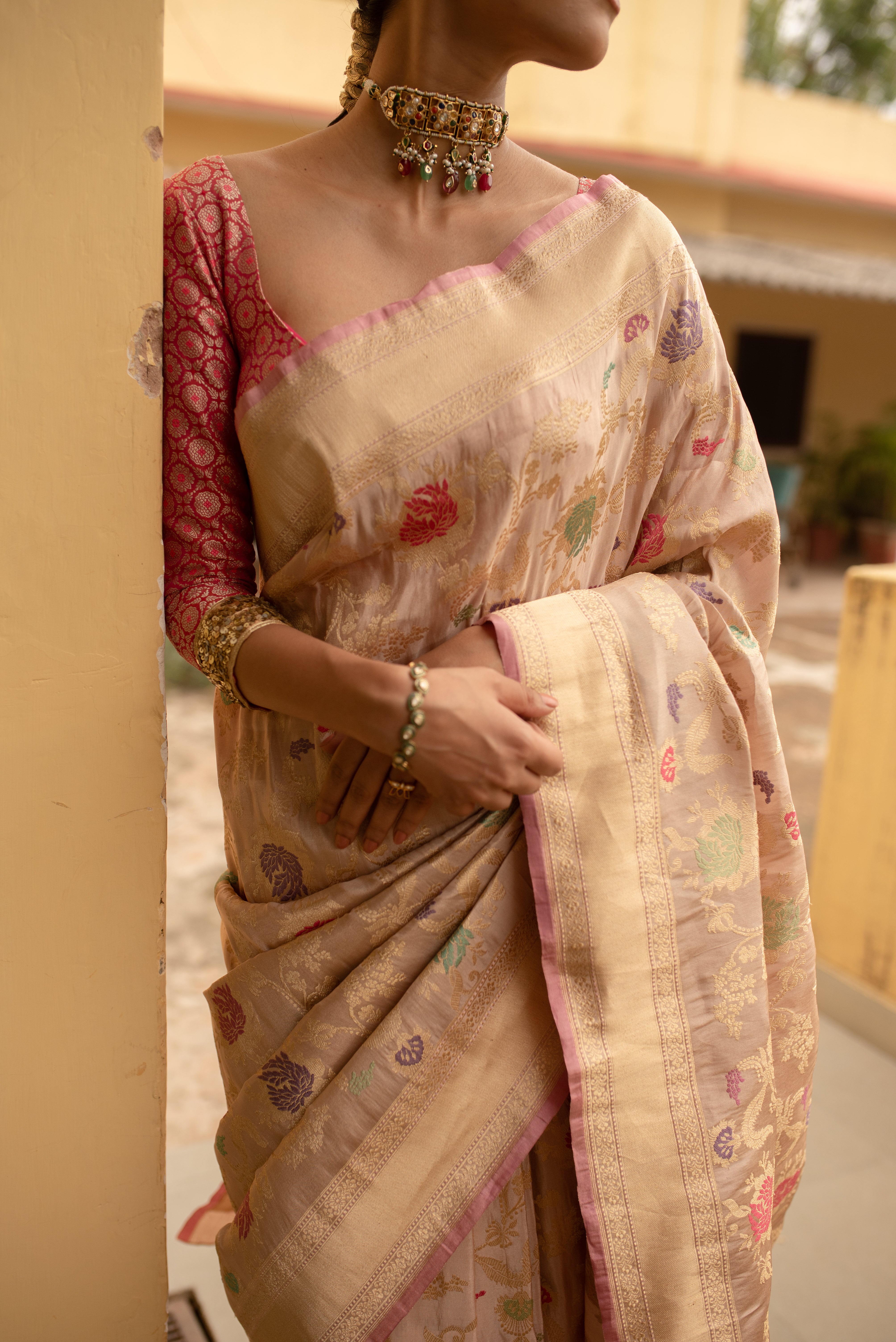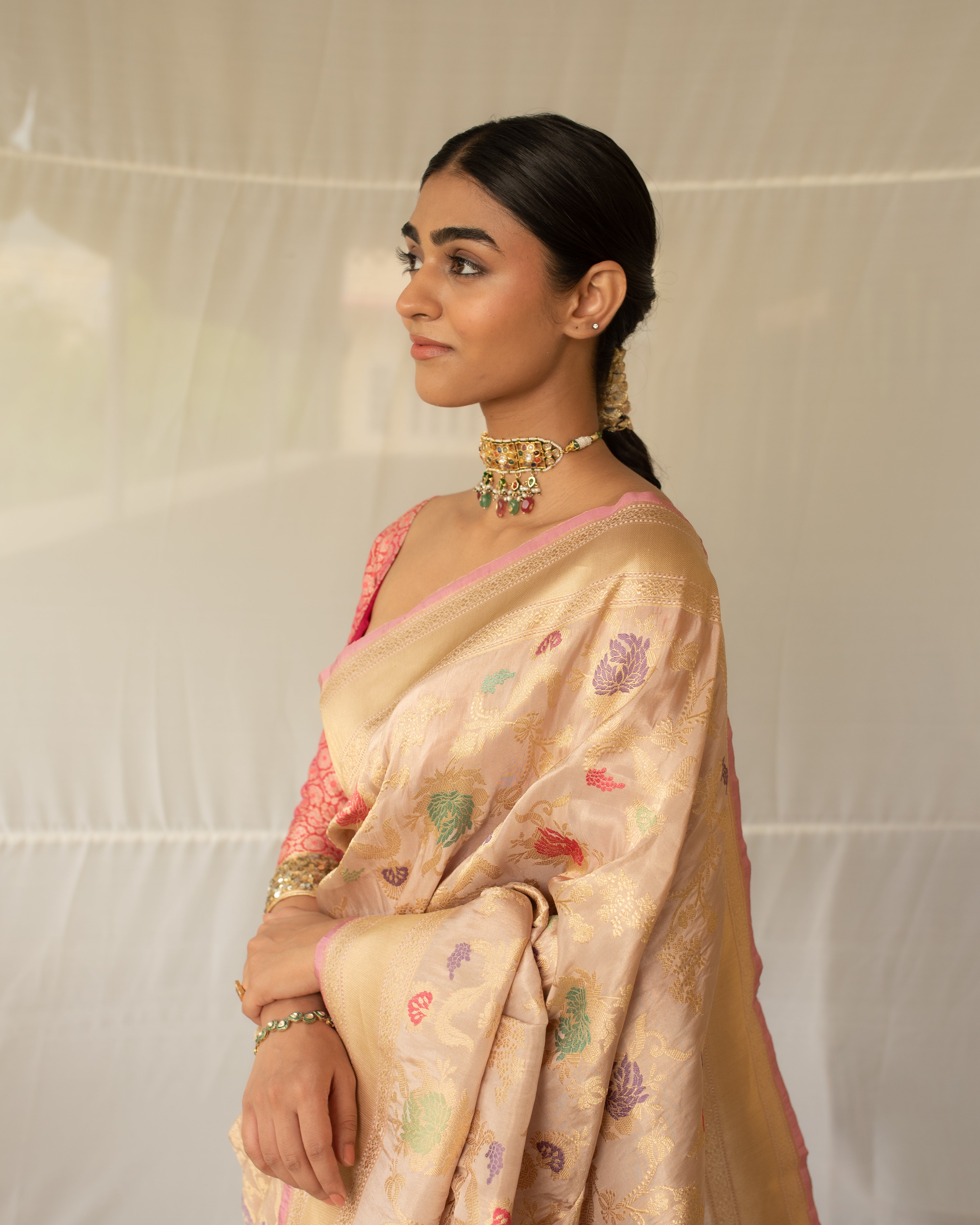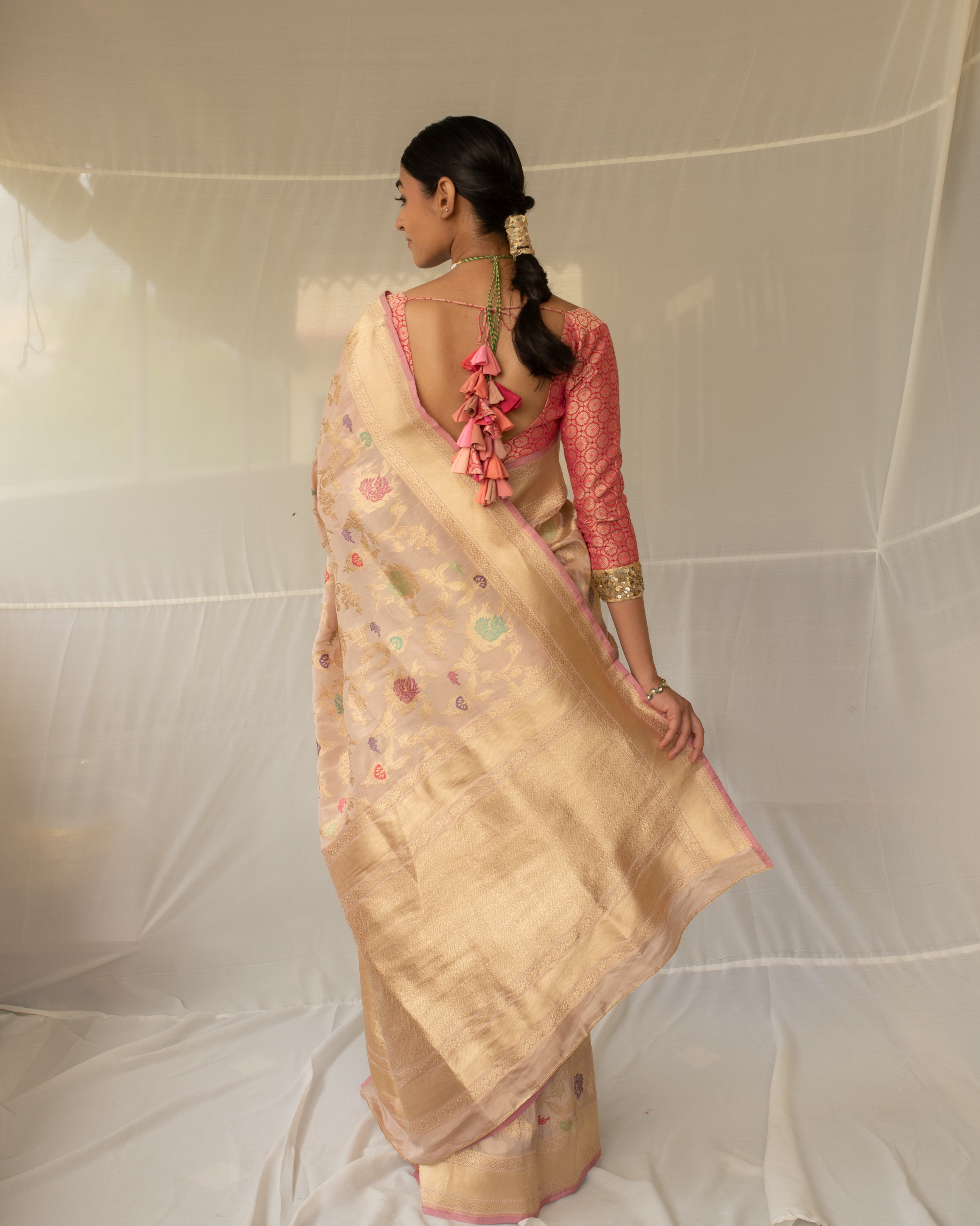 Soft as a dying dawn and full of tales spun in gold, Laad is a saree that holds the poetry of time. Made in the otherworldly beauty of beige silk organza, this Banarasi weave is a canvas of dainty gold and pink floral buttis, each glinting like dewdrops in early light. The textured gold border and palla bring quiet luxury, a tip of the hat to the grandeur of heritage without ostentation.The ethereal Laad, with its quiet grace, harks back to the whisper-soft Banarasi finesse. The fine beige silk organza Sari is woven with delicate gold and rose pink zari floral bootis, which shine subtly on the translucent Sari. A textured gold zari border and palla add the finishing touch to the saree, giving it understated festive charm, minus the excess. Ideal for morning weddings, small rituals, or occasions where grace is louder than grandeur. Wear it with the matching zari weave handmade blouse and/or contrast tones for cherished moments of your own! Laad is light and graceful and meant to move with you, from tradition to today.