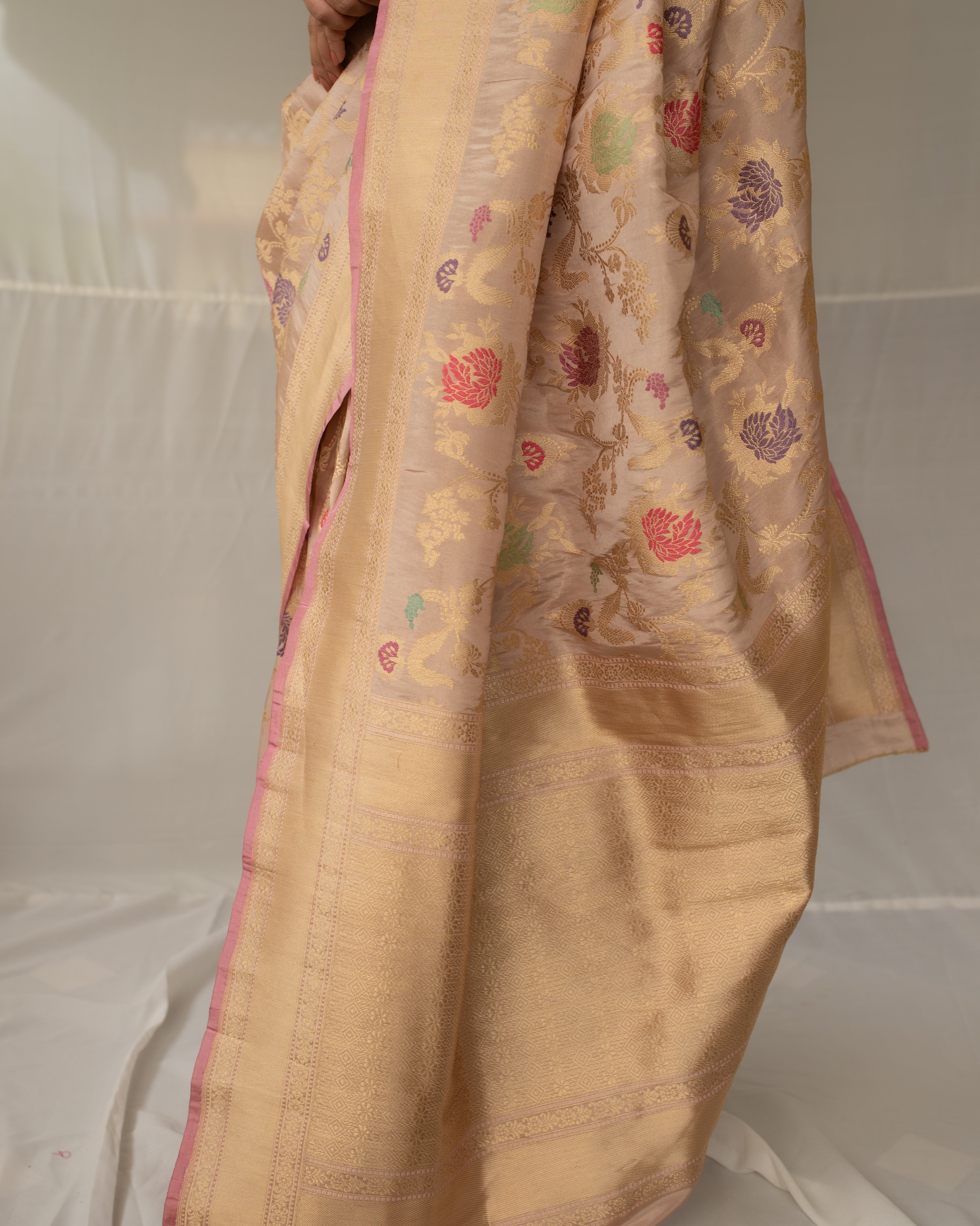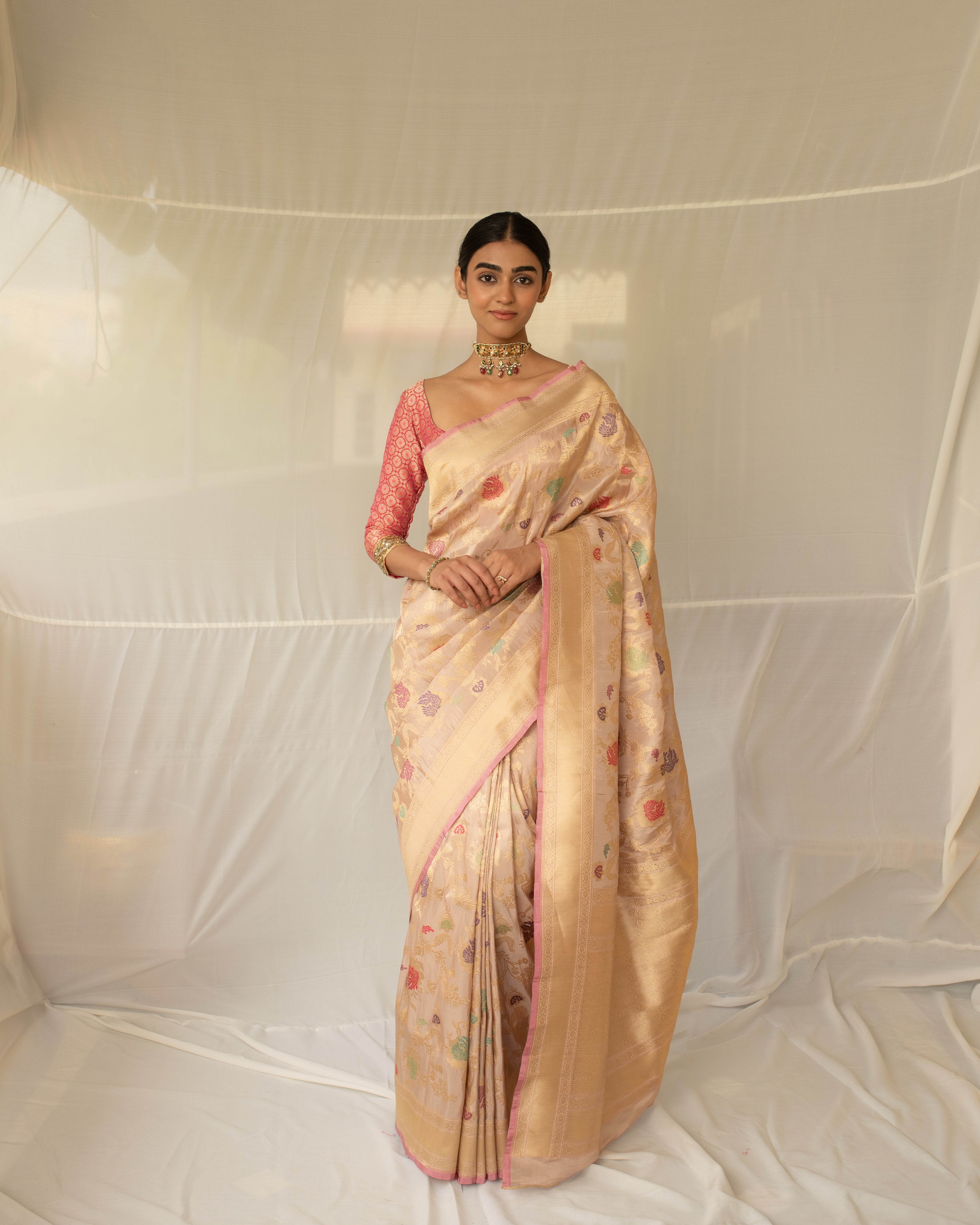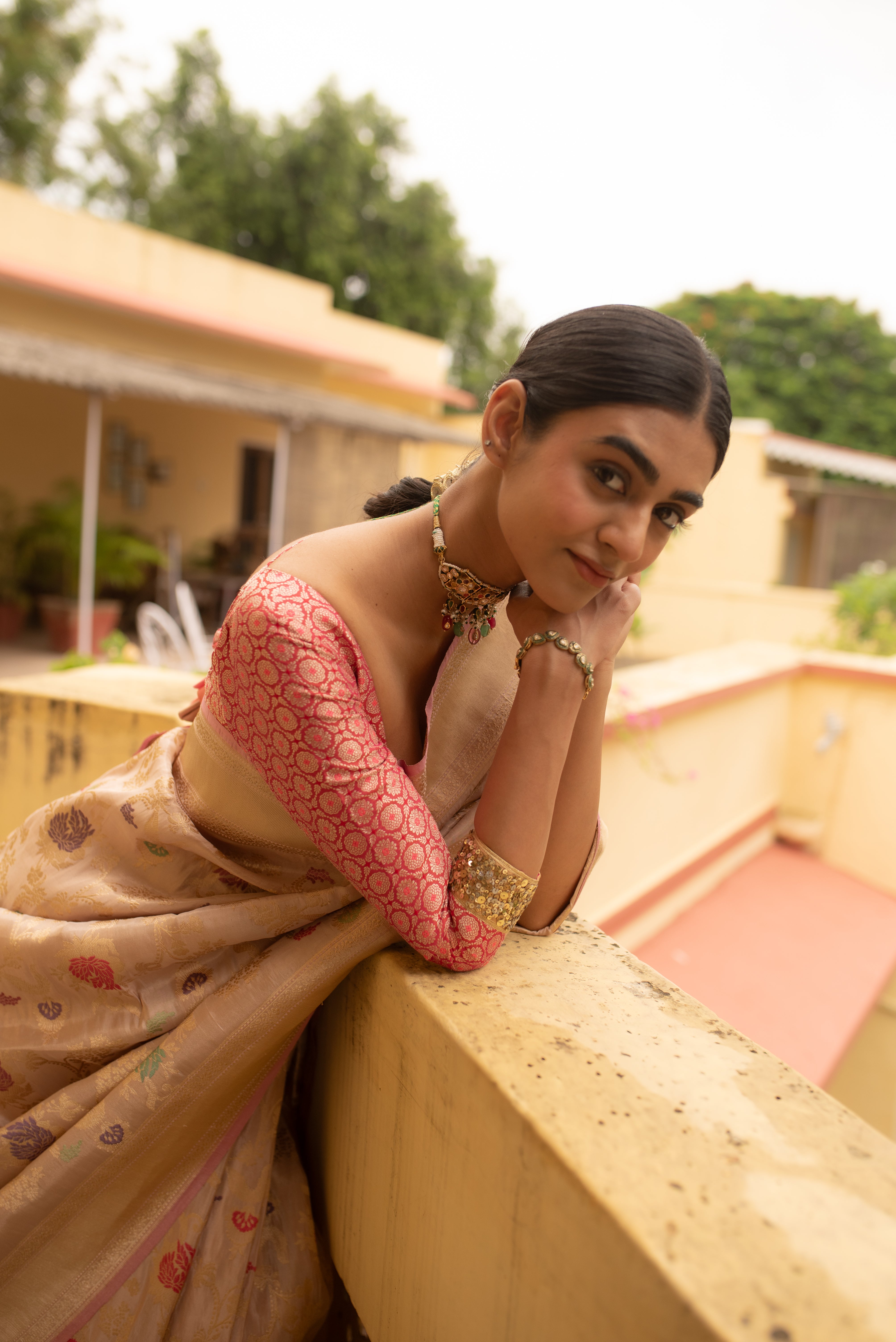 Soft as a dying dawn and full of tales spun in gold, Laad is a saree that holds the poetry of time. Made in the otherworldly beauty of beige silk organza, this Banarasi weave is a canvas of dainty gold and pink floral buttis, each glinting like dewdrops in early light. The textured gold border and palla bring quiet luxury, a tip of the hat to the grandeur of heritage without ostentation.The ethereal Laad, with its quiet grace, harks back to the whisper-soft Banarasi finesse. The fine beige silk organza Sari is woven with delicate gold and rose pink zari floral bootis, which shine subtly on the translucent Sari. A textured gold zari border and palla add the finishing touch to the saree, giving it understated festive charm, minus the excess. Ideal for morning weddings, small rituals, or occasions where grace is louder than grandeur. Wear it with the matching zari weave handmade blouse and/or contrast tones for cherished moments of your own! Laad is light and graceful and meant to move with you, from tradition to today.