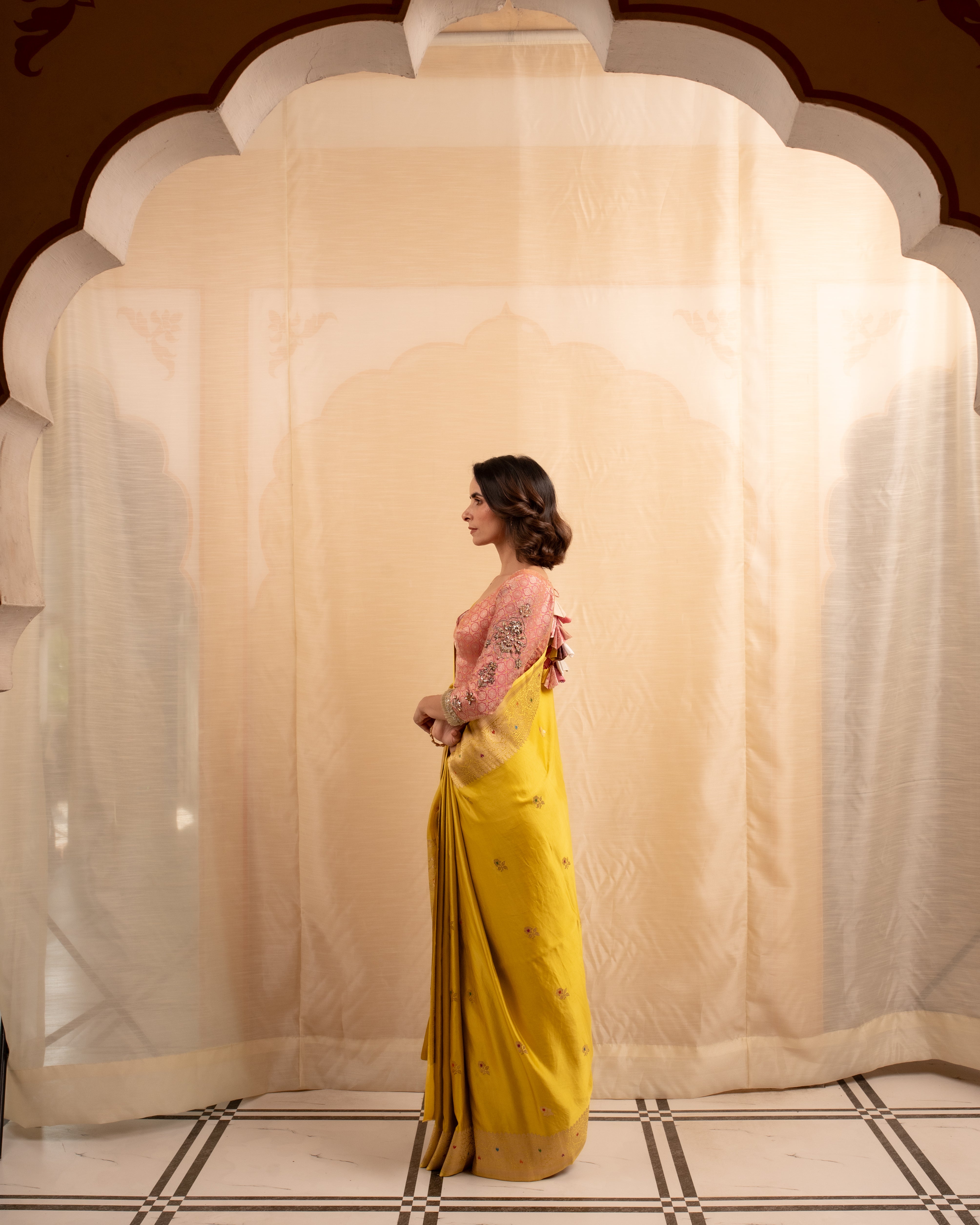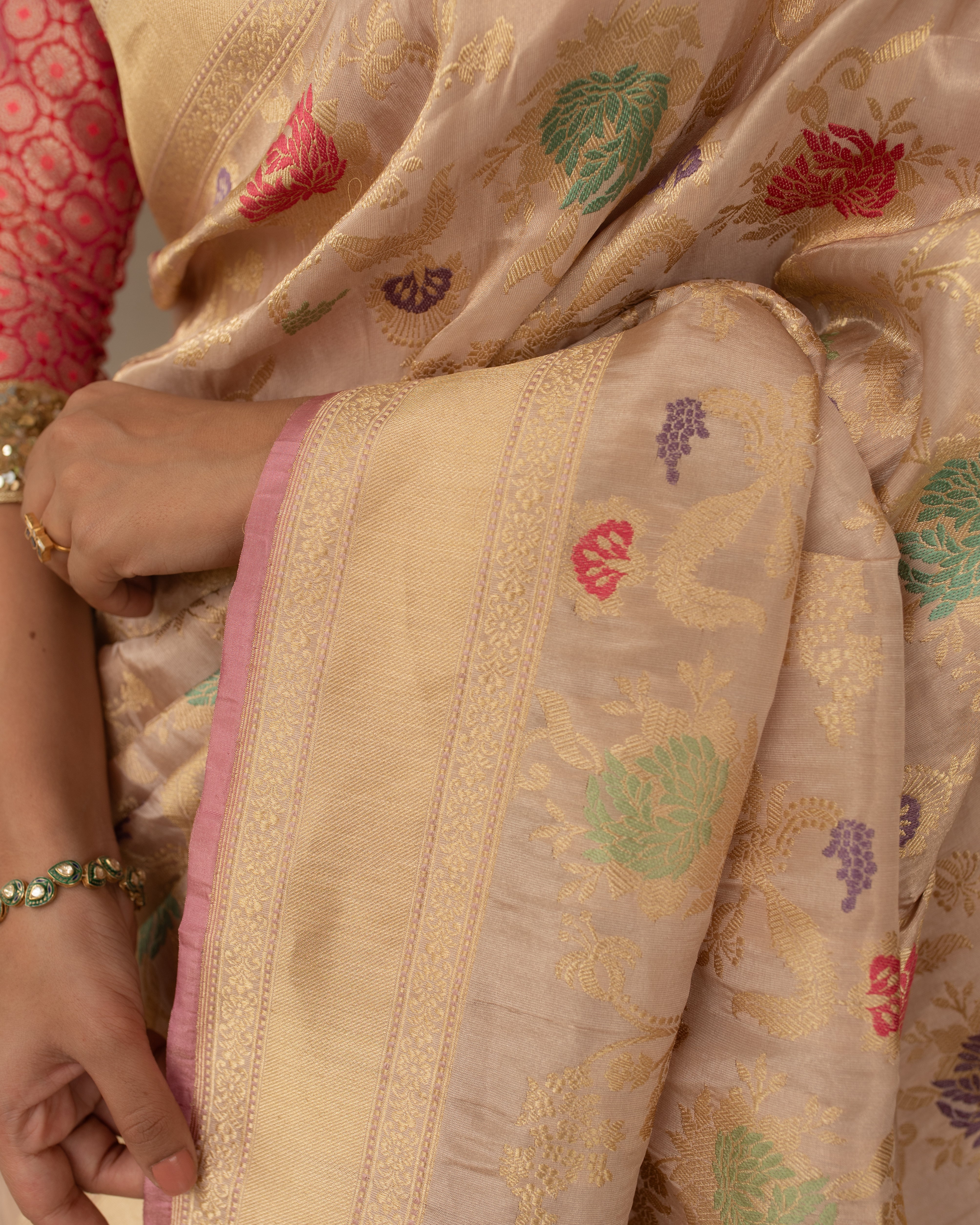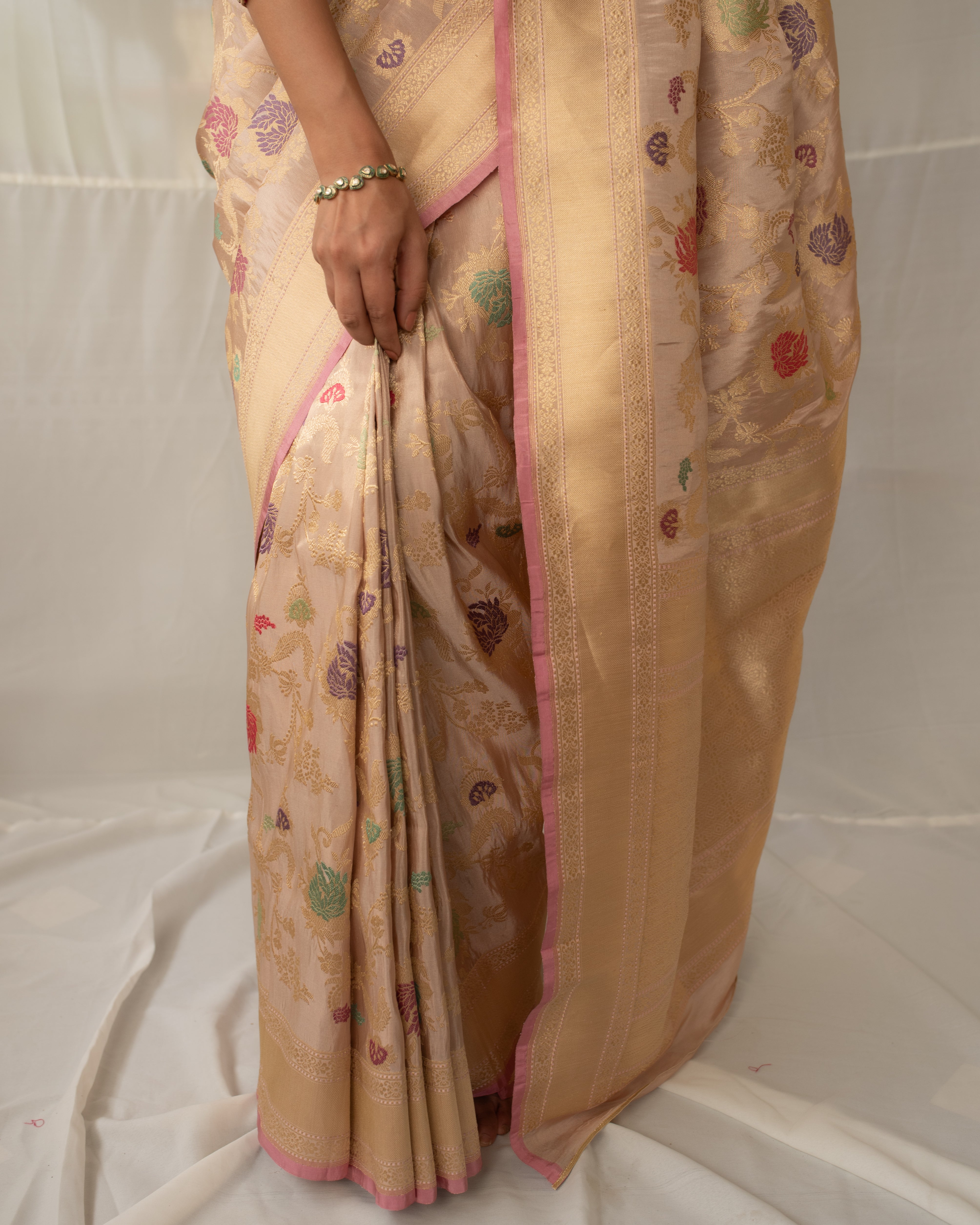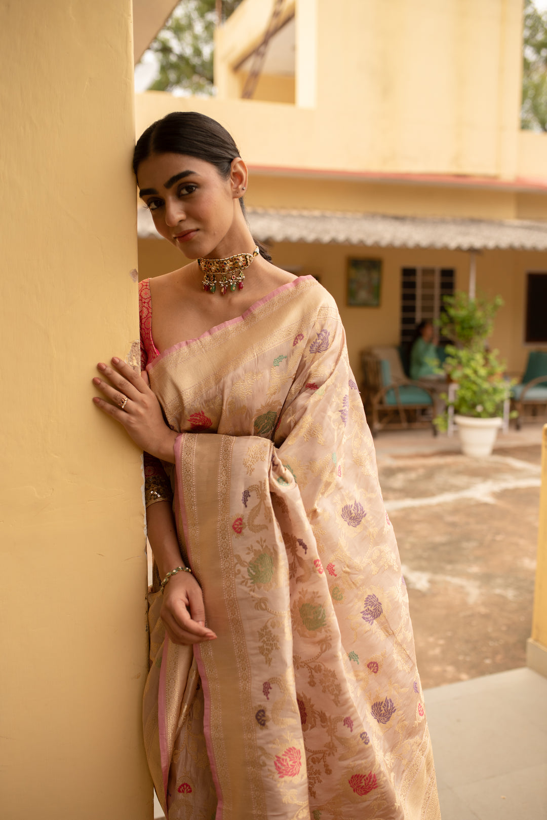 Soft as a dying dawn and full of tales spun in gold, Laad is a saree that holds the poetry of time. Made in the otherworldly beauty of beige silk organza, this Banarasi weave is a canvas of dainty gold and pink floral buttis, each glinting like dewdrops in early light. The textured gold border and palla bring quiet luxury, a tip of the hat to the grandeur of heritage without ostentation.The ethereal Laad, with its quiet grace, harks back to the whisper-soft Banarasi finesse. The fine beige silk organza Sari is woven with delicate gold and rose pink zari floral bootis, which shine subtly on the translucent Sari. A textured gold zari border and palla add the finishing touch to the saree, giving it understated festive charm, minus the excess. Ideal for morning weddings, small rituals, or occasions where grace is louder than grandeur. Wear it with the matching zari weave handmade blouse and/or contrast tones for cherished moments of your own! Laad is light and graceful and meant to move with you, from tradition to today.