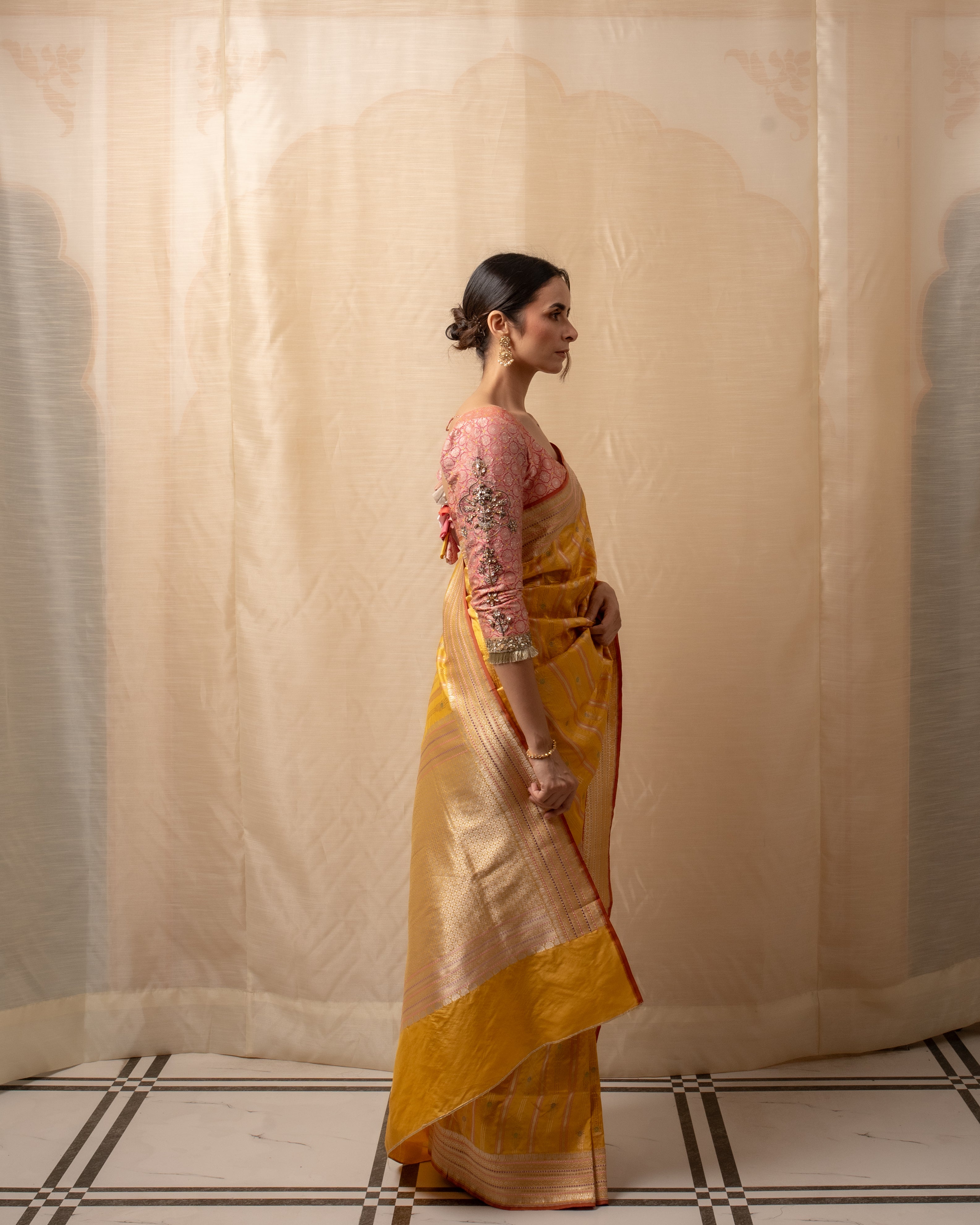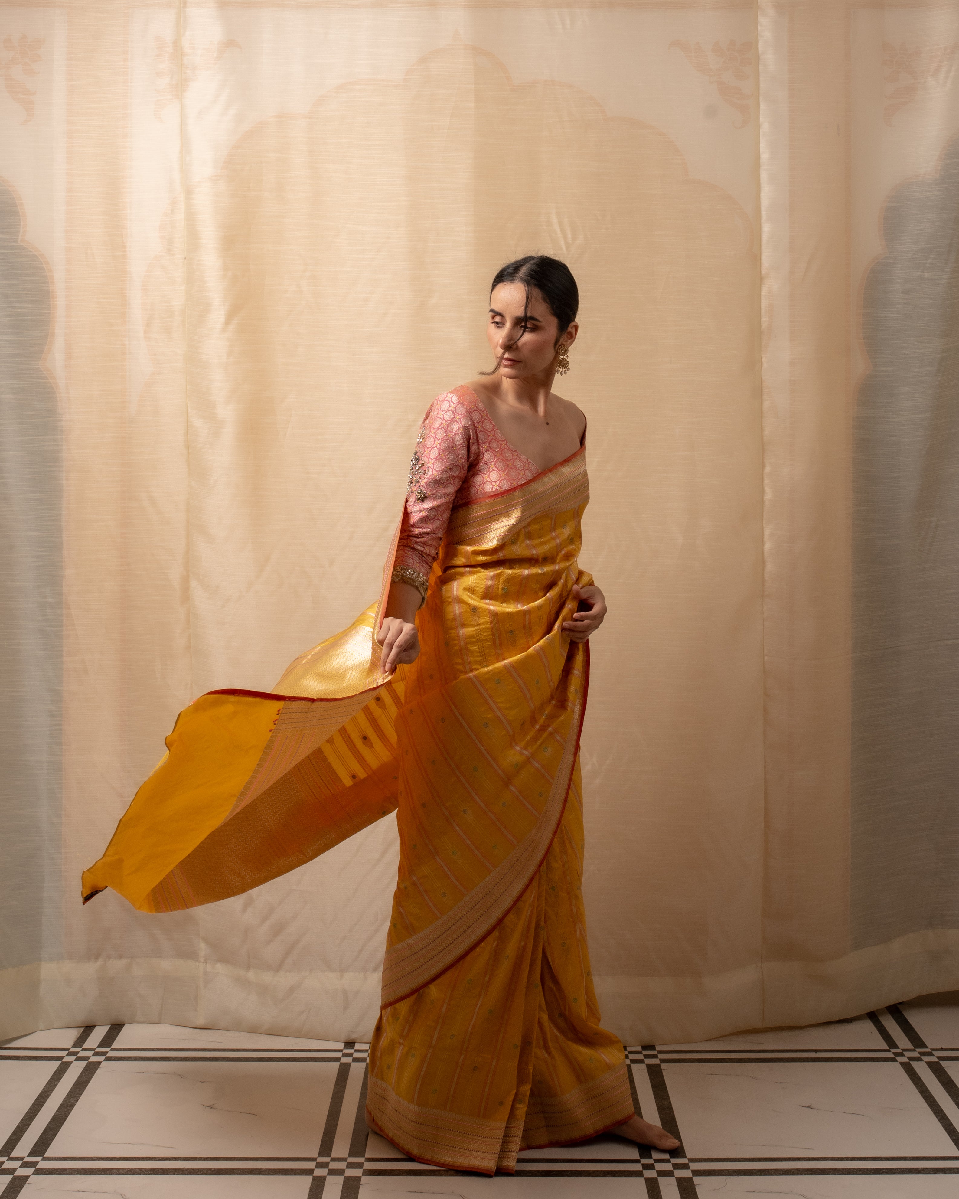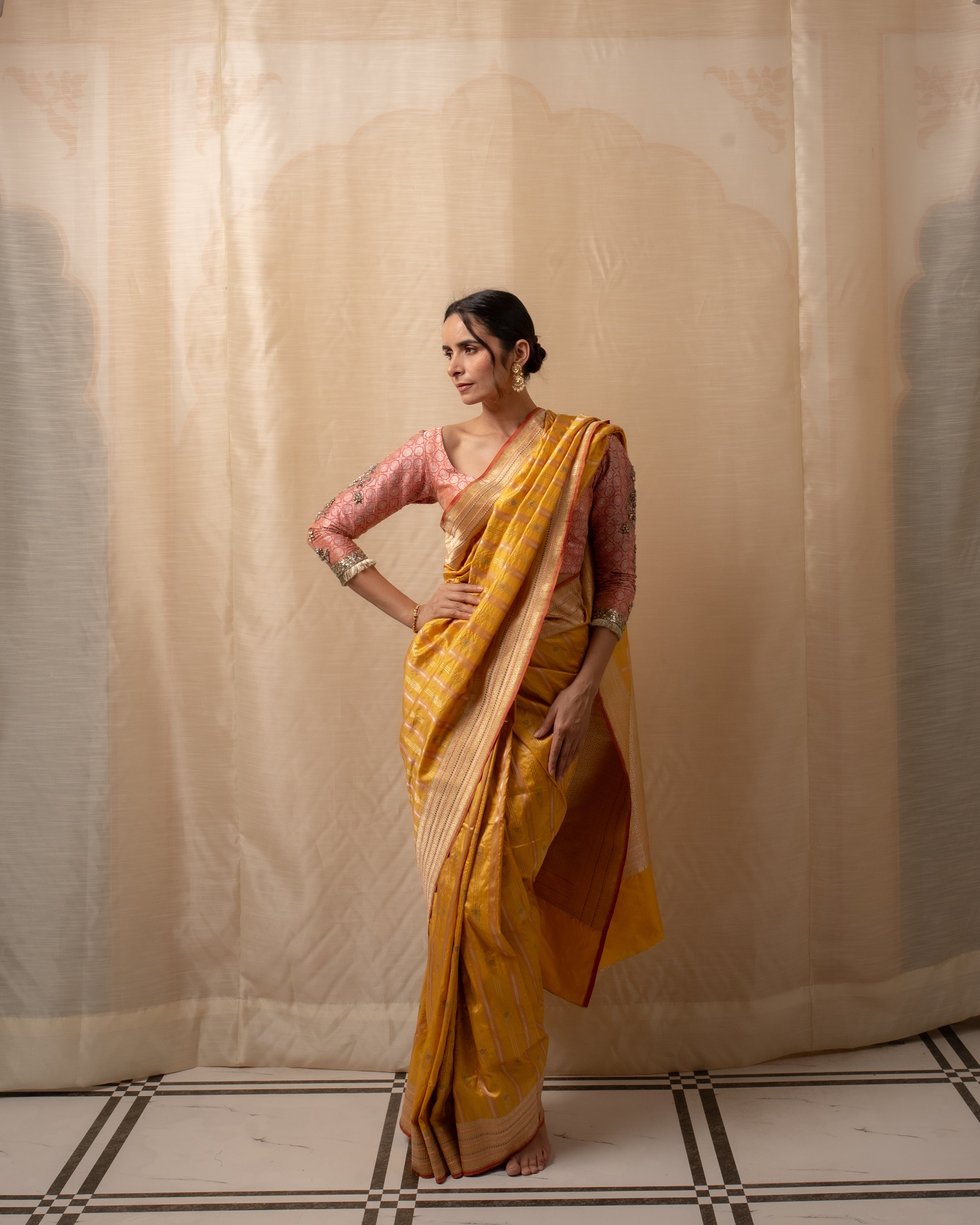 The ethereal Laad, with its quiet grace, harks back to the whisper-soft Banarasi finesse. The fine beige silk organza Sari is woven with delicate gold and rose pink zari floral bootis, which shine subtly on the translucent Sari. A textured gold zari border and palla add the finishing touch to the saree, giving it understated festive charm, minus the excess. Ideal for morning weddings, small rituals, or occasions where grace is louder than grandeur. Wear it with the matching zari weave handmade blouse and/or contrast tones for cherished moments of your own! Laad is light and graceful and meant to move with you, from tradition to today.