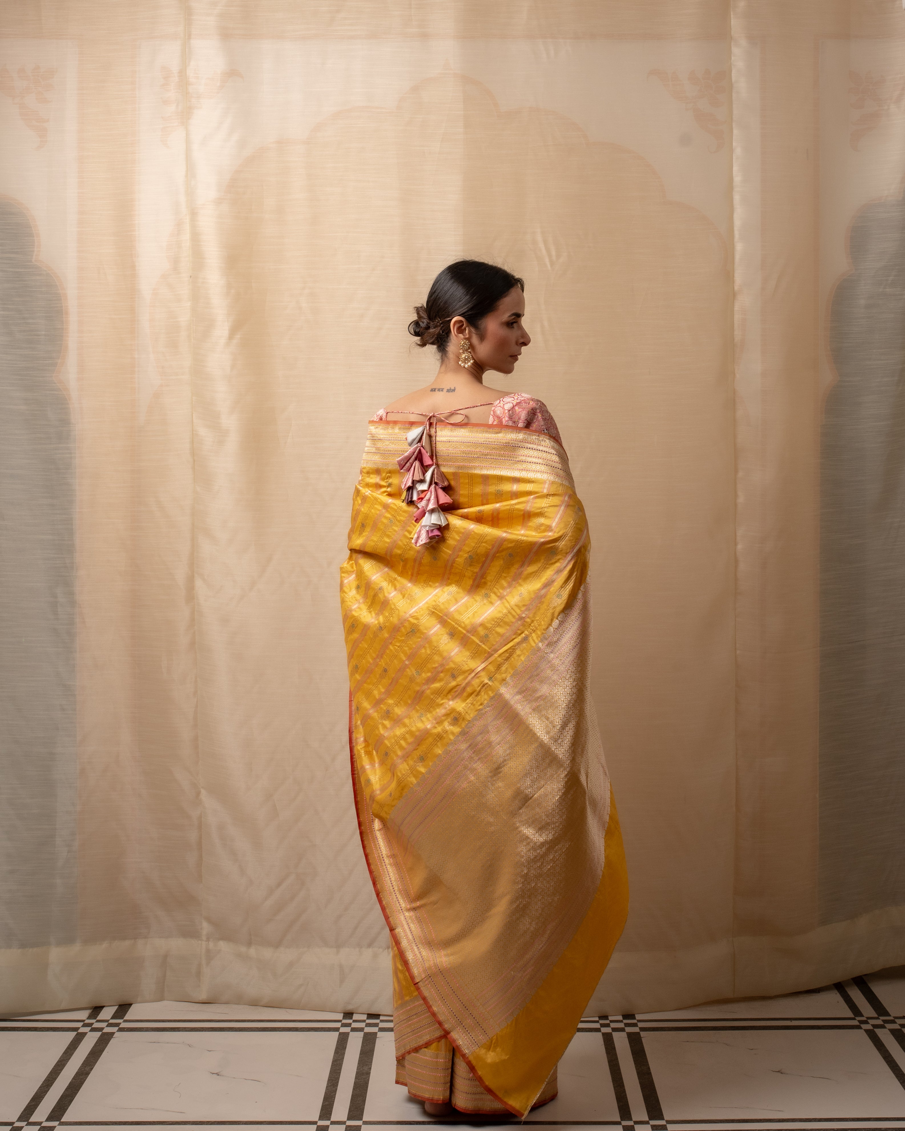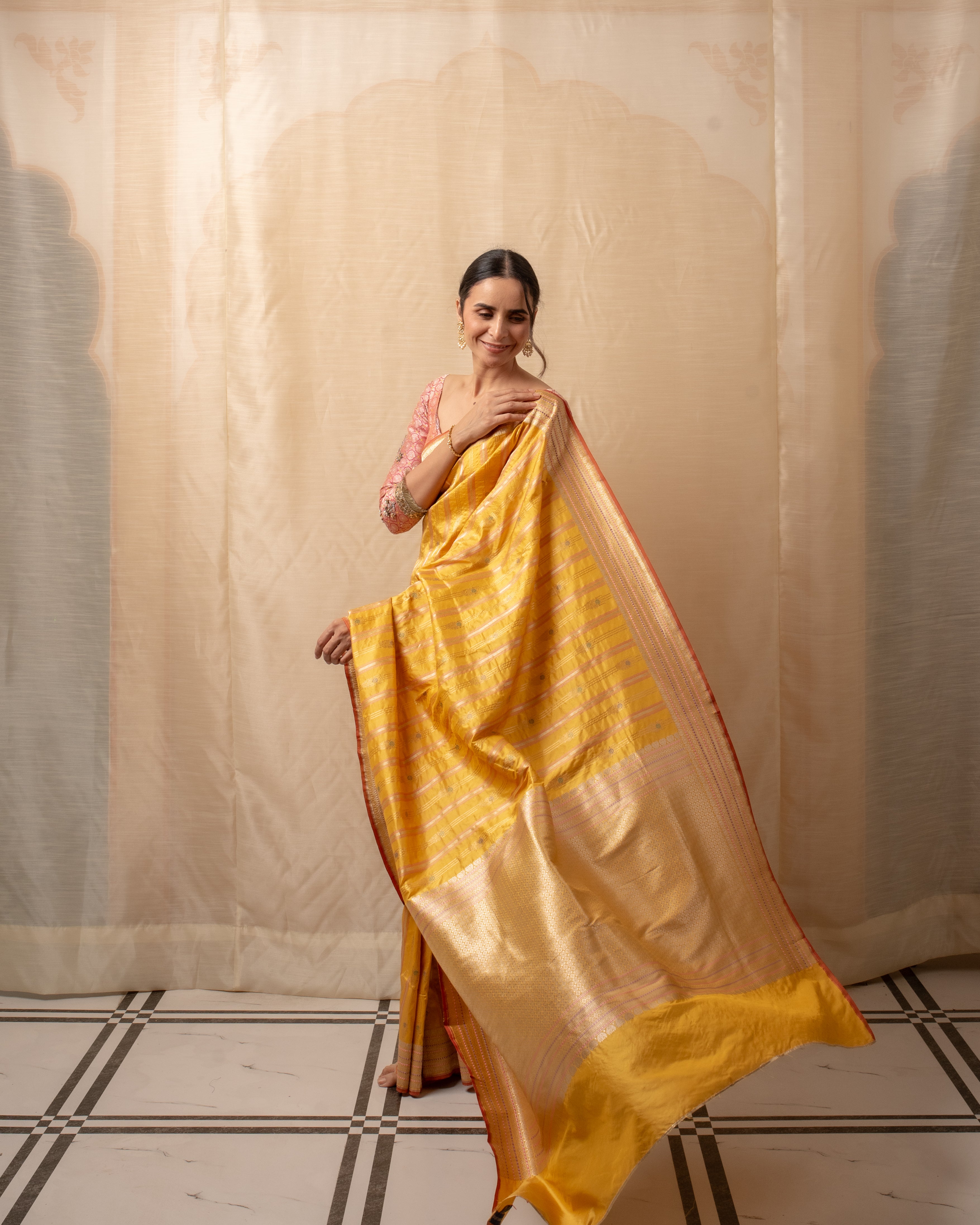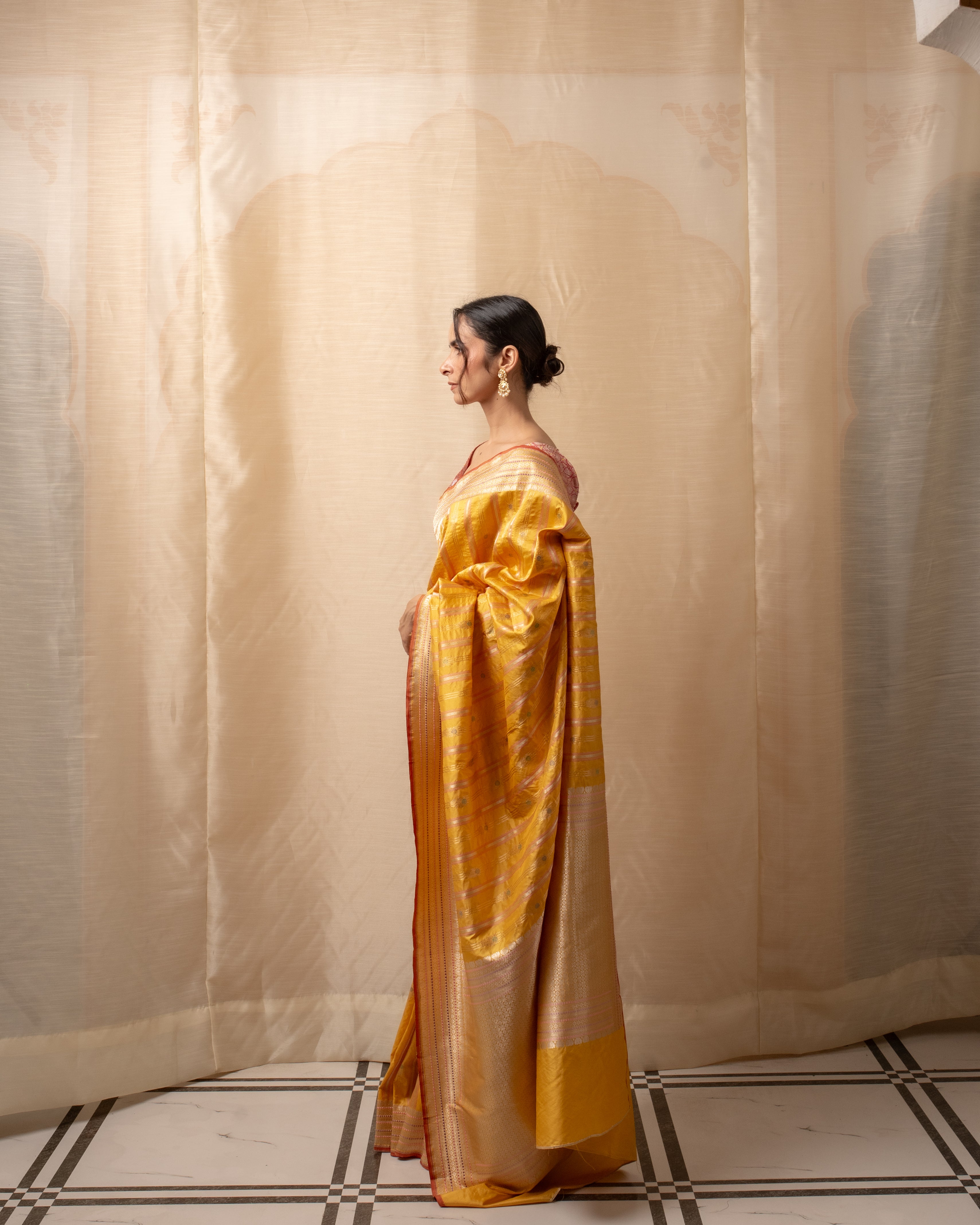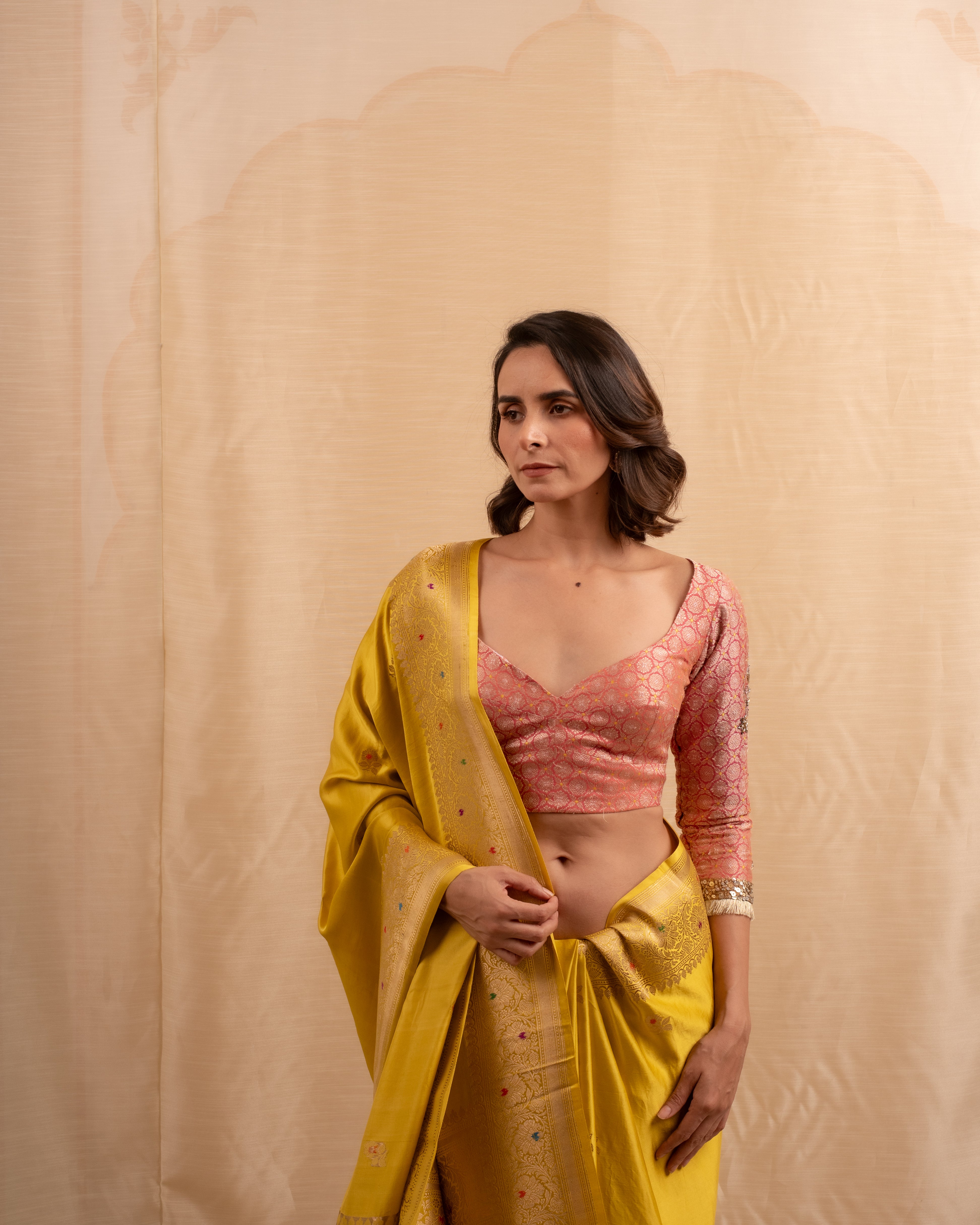The ethereal Laad, with its quiet grace, harks back to the whisper-soft Banarasi finesse. The fine beige silk organza Sari is woven with delicate gold and rose pink zari floral bootis, which shine subtly on the translucent Sari. A textured gold zari border and palla add the finishing touch to the saree, giving it understated festive charm, minus the excess. Ideal for morning weddings, small rituals, or occasions where grace is louder than grandeur. Wear it with the matching zari weave handmade blouse and/or contrast tones for cherished moments of your own! Laad is light and graceful and meant to move with you, from tradition to today.