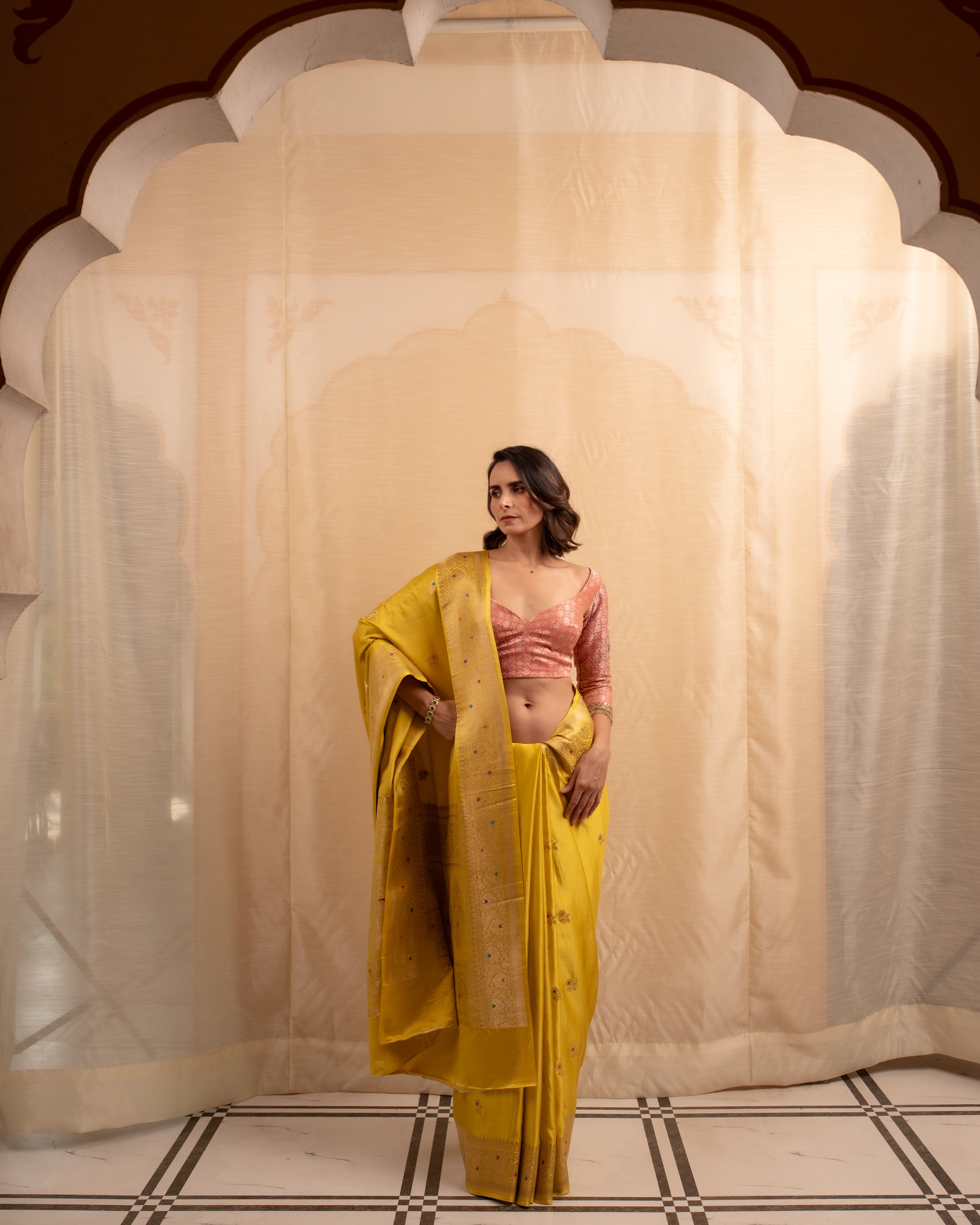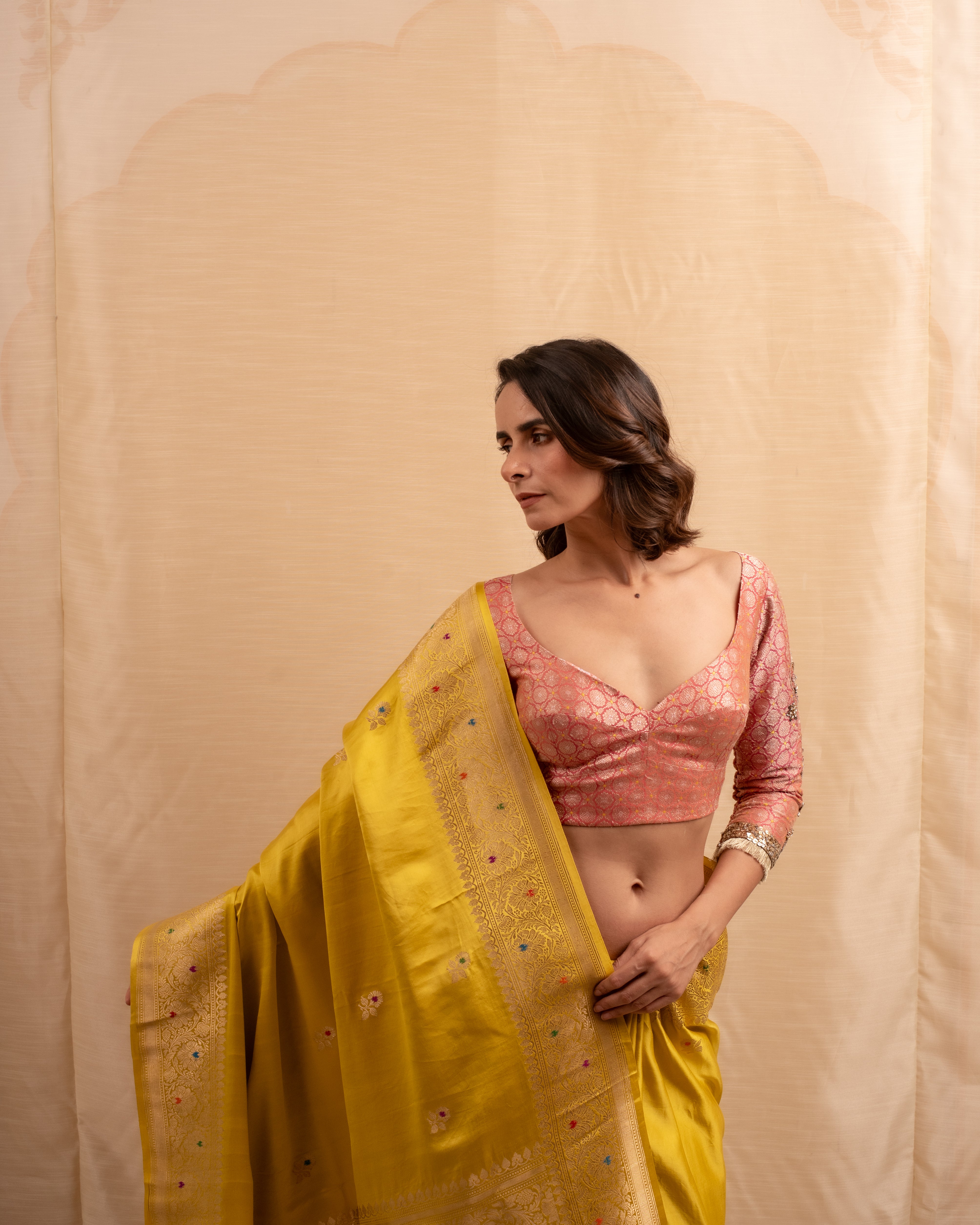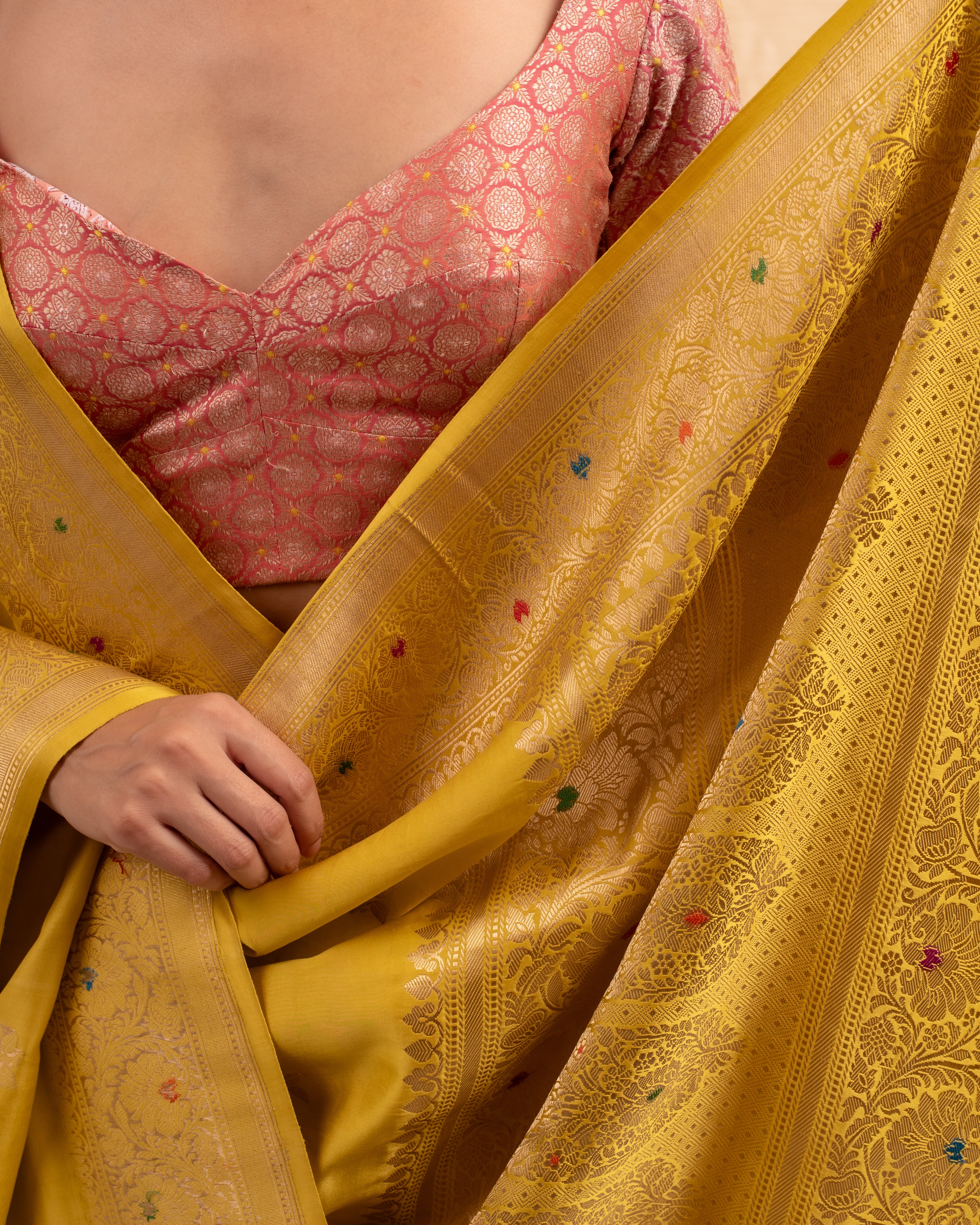 Every single saree from our collection is not only a fashion piece but also a lyrical ode to the varied and vibrant culture of Banaras. It is not unusual, as they are rich in colour and even richer in meenakari intricacy. The hordes of threads signify the use of the kadhwa technique, which is so laborious that you will not have anyone to cut the thread for you, and the complexity of each motif is one of the remarkable narratives that can last for generations.