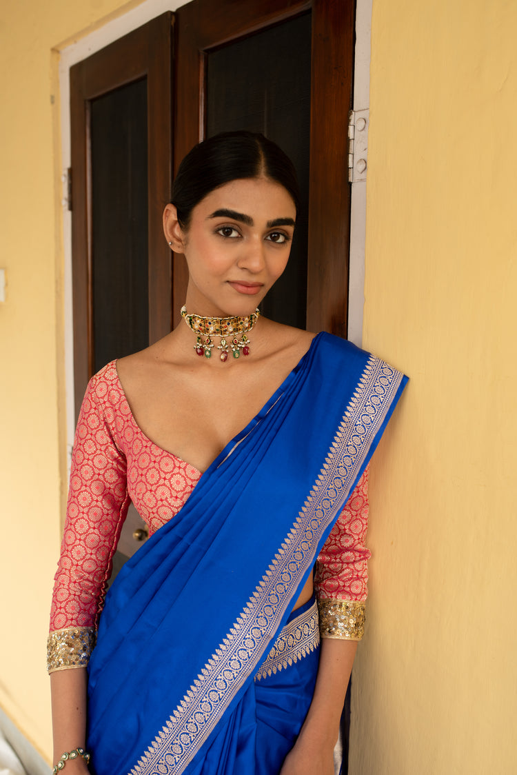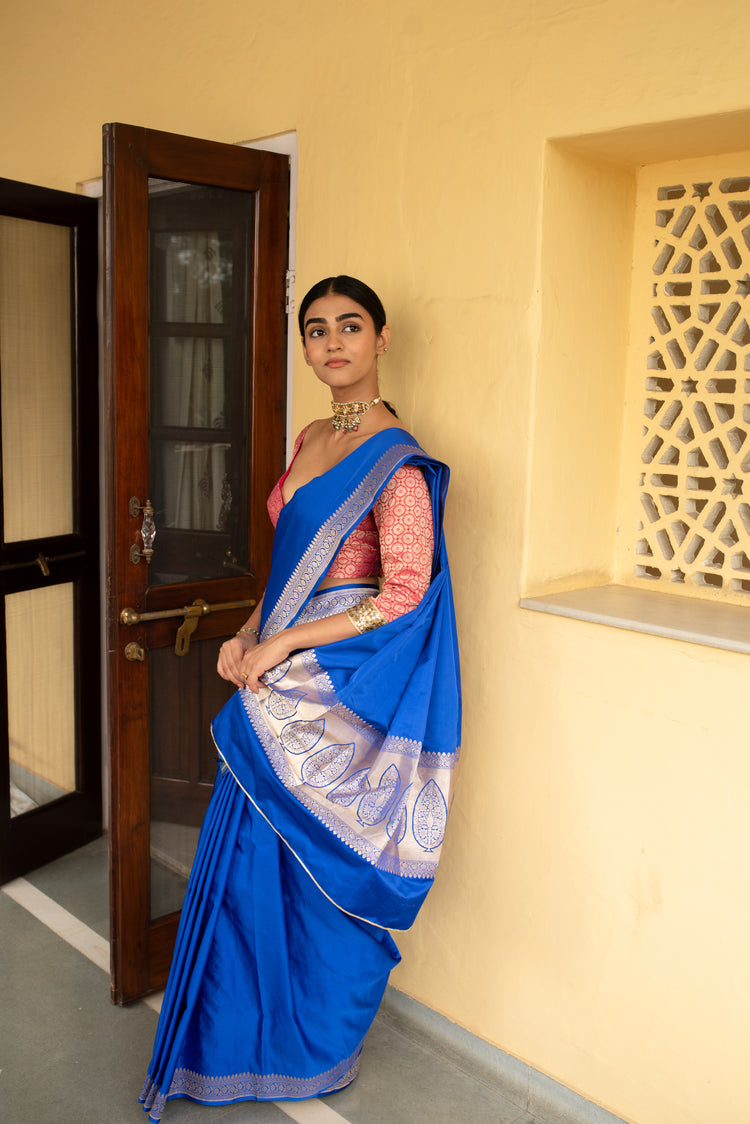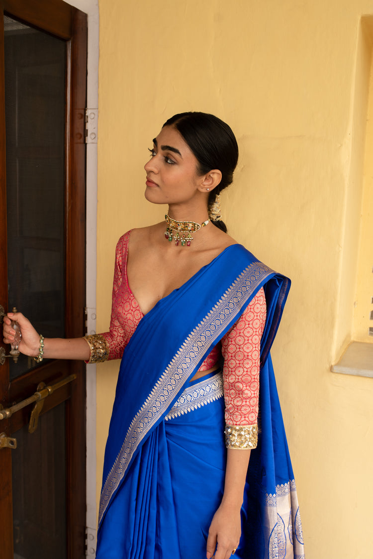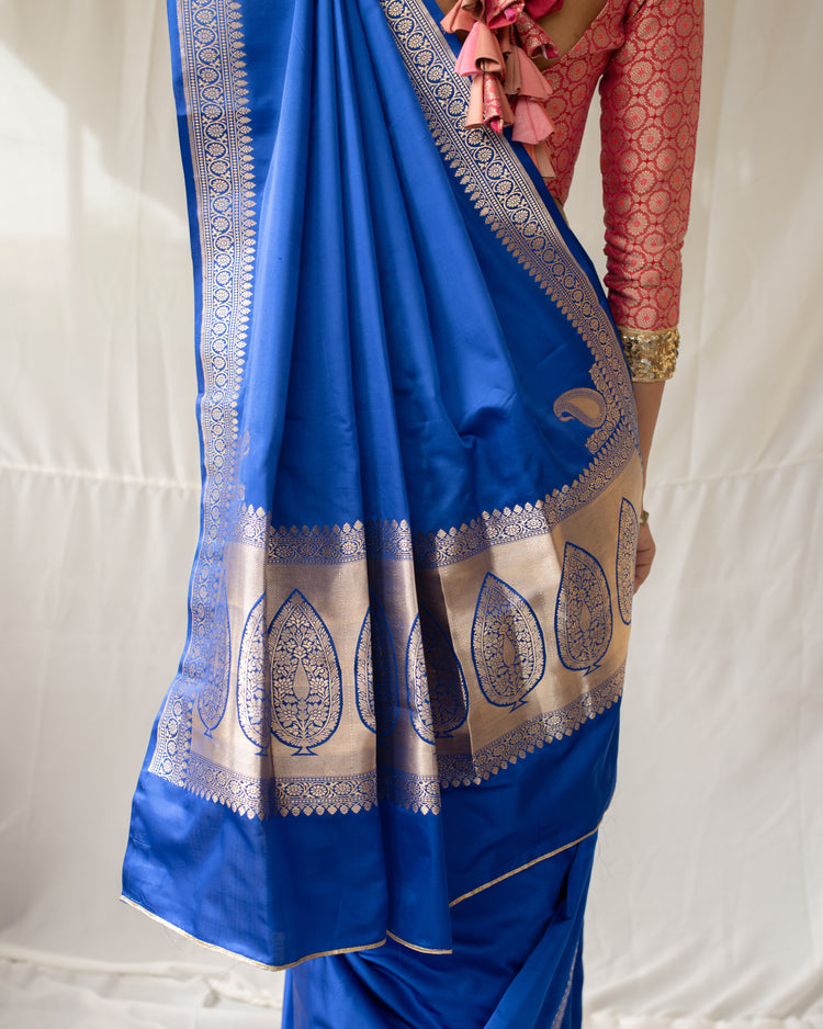 Blue Banarasi Silk Mashroo saree with a detailed paisley palla and border woven in vintage gold zari using the kadua technique. The saree is paired with Reva, a pink brocade blouse.