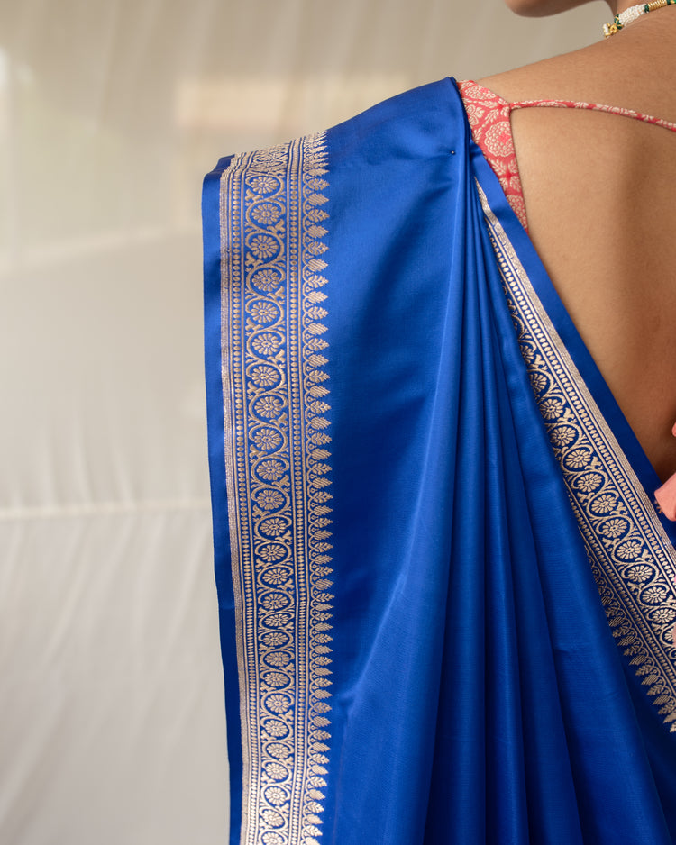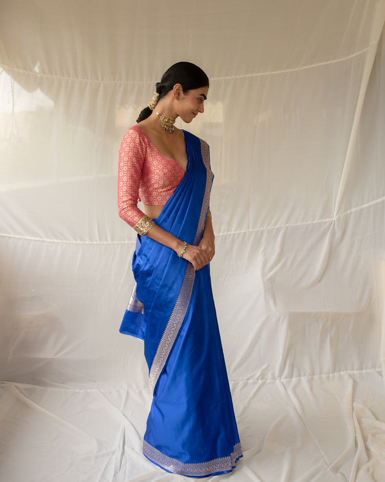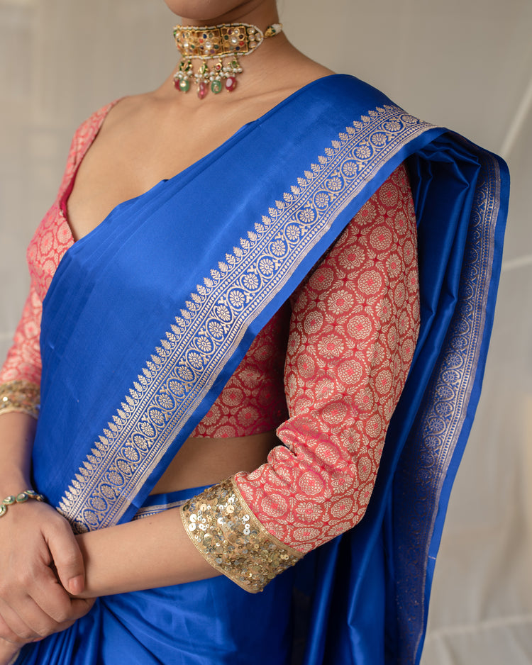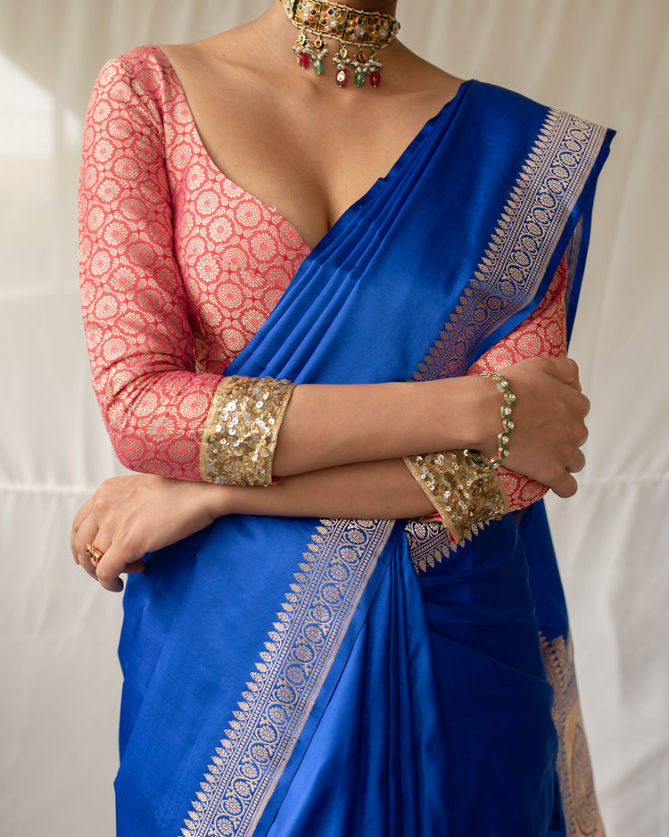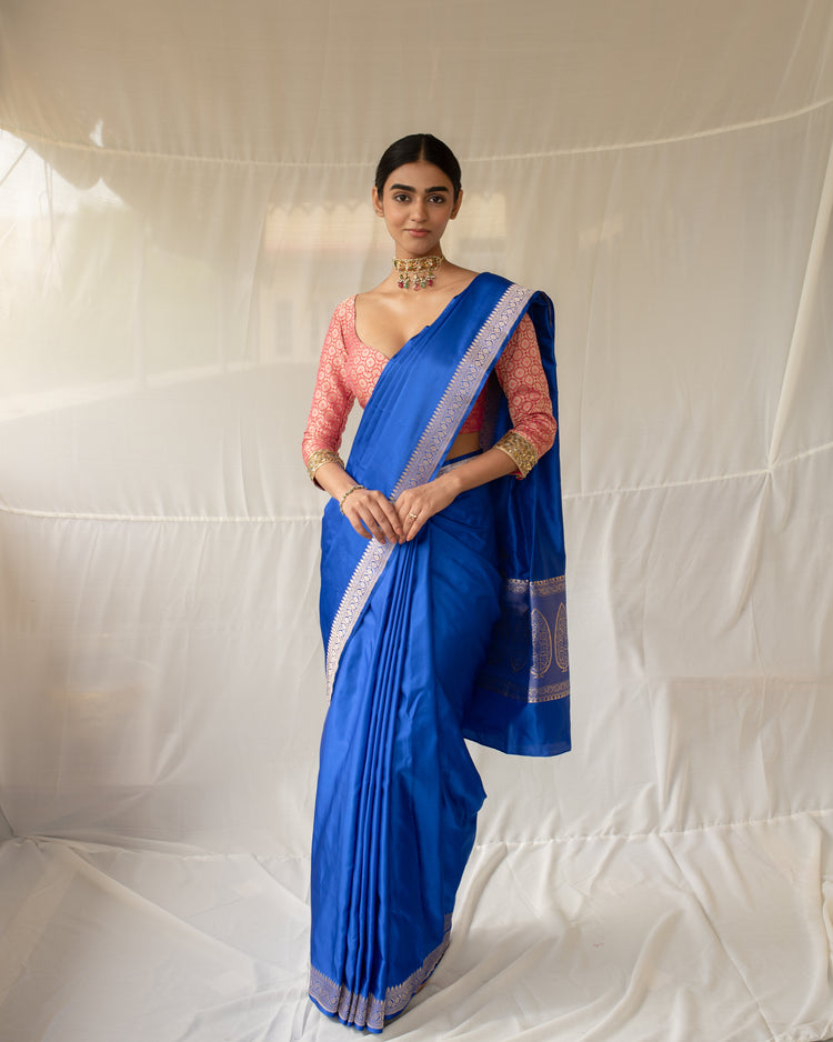 Blue Banarasi Silk Mashroo saree with a detailed paisley palla and border woven in vintage gold zari using the kadua technique. The saree is paired with Reva, a pink brocade blouse.