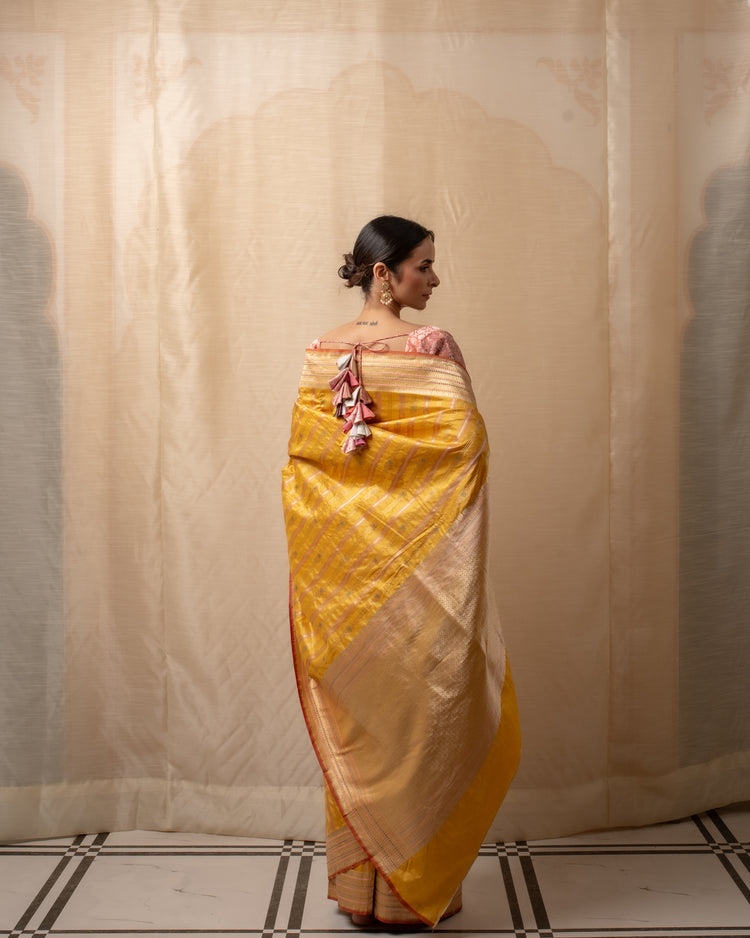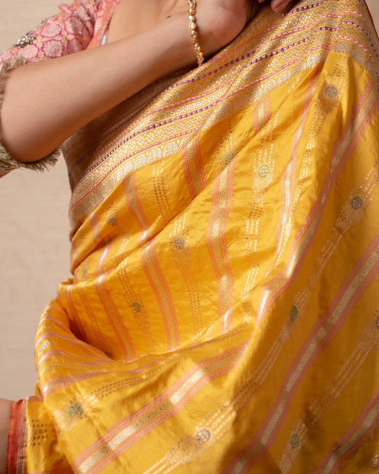 Yellow silk brocade banarasi saree with detailed vertical pattidaar jaal with meenakari and handcrafted border and palla in kadua