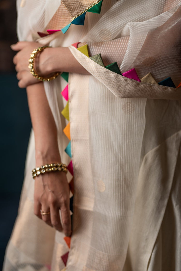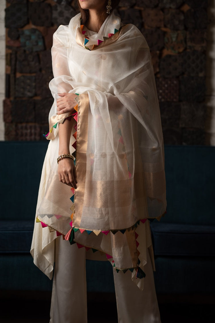 Kvana- Ivory Silk Maheshwari Upcycled Patchwork Dupatta