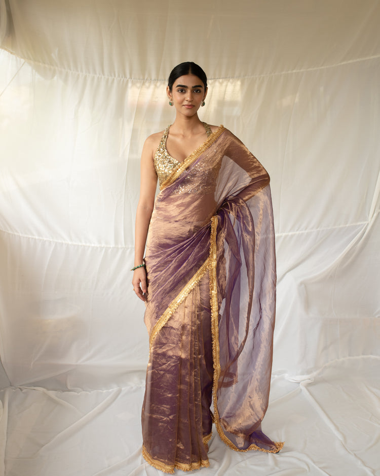 Purple gold silk tissue chanderi Saree finished with kiran.