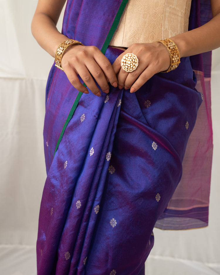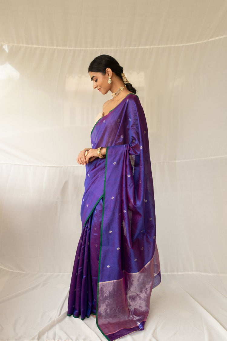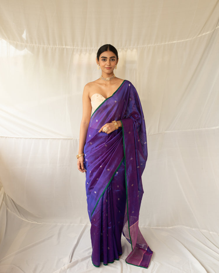 Purple silk chanderi saree with gold handwoven butis all over with gold palla.