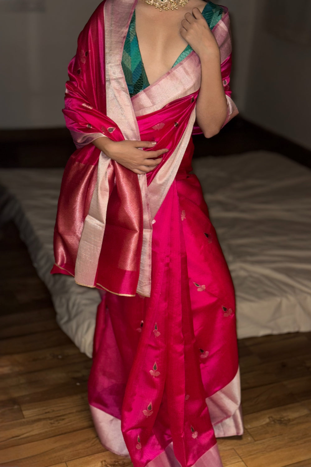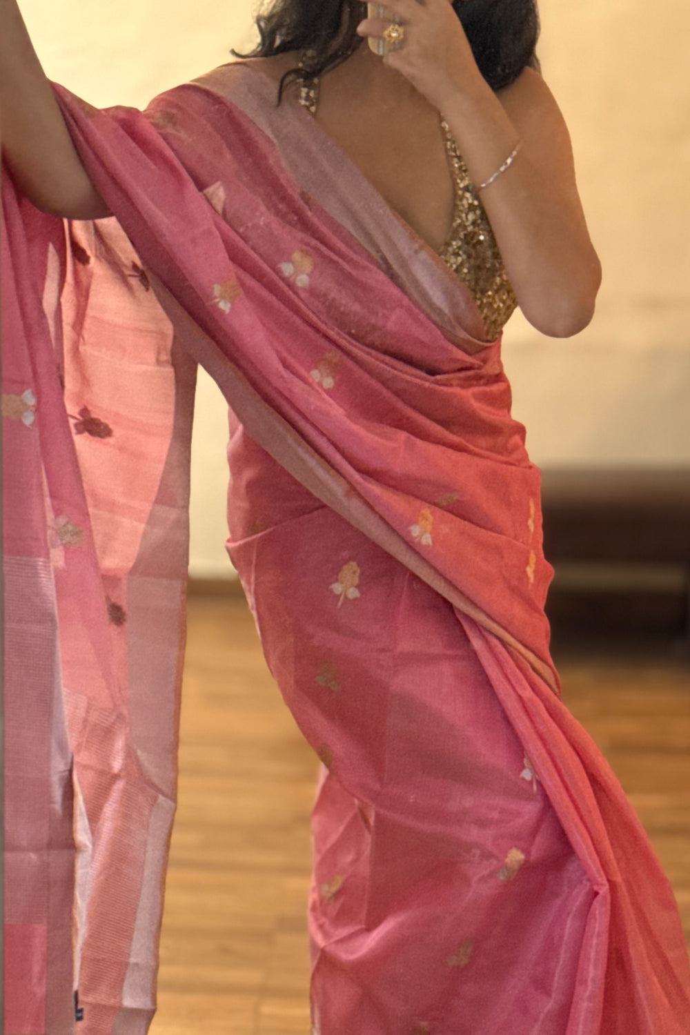 Rati - Coral Pink Silk Tissue Chanderi Saree