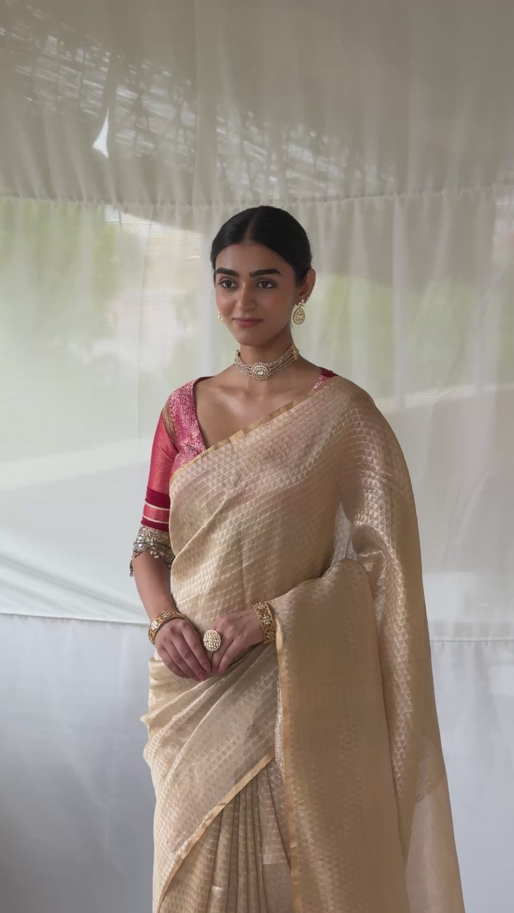 Blush silk chanderi saree with all over geometric pattern in vintage gold.