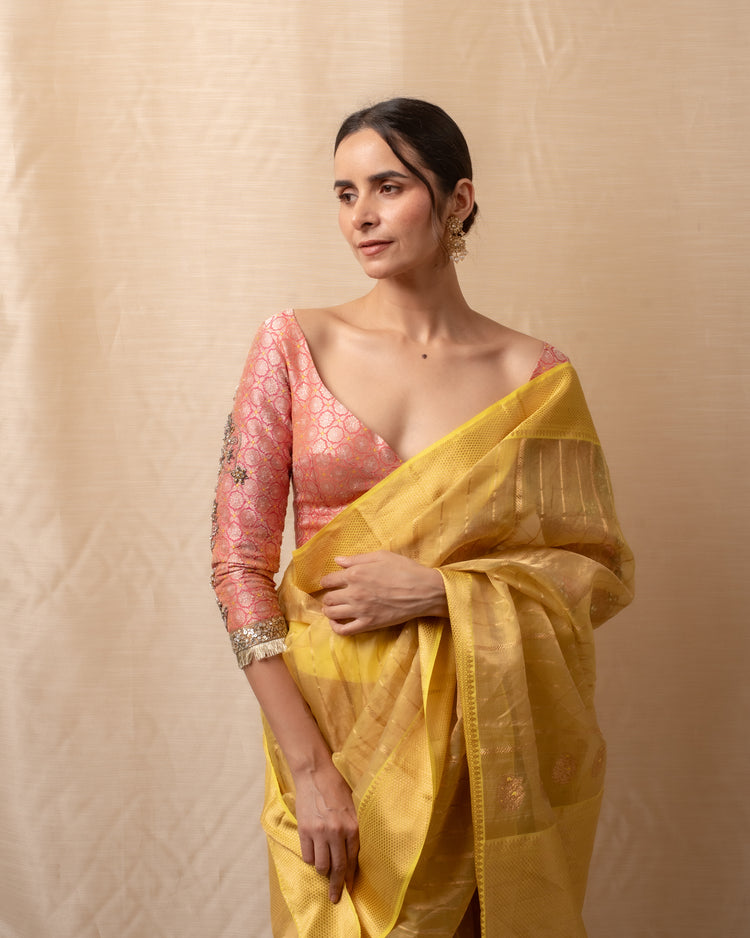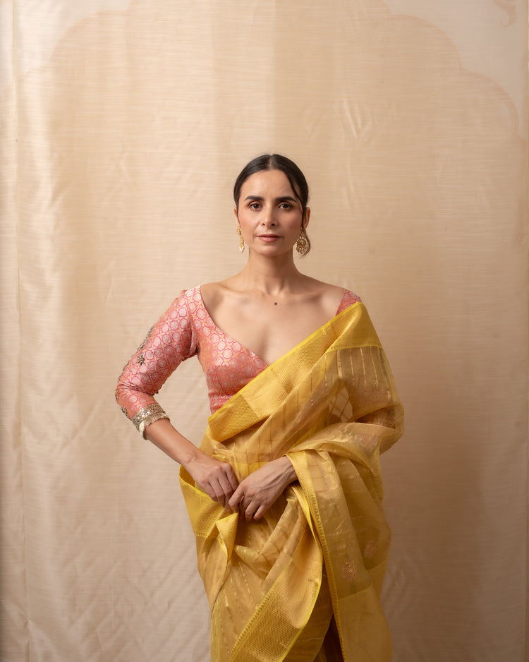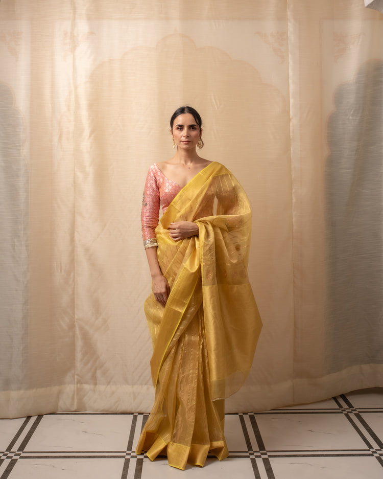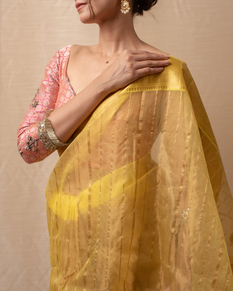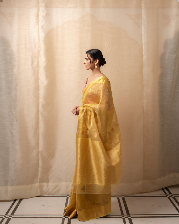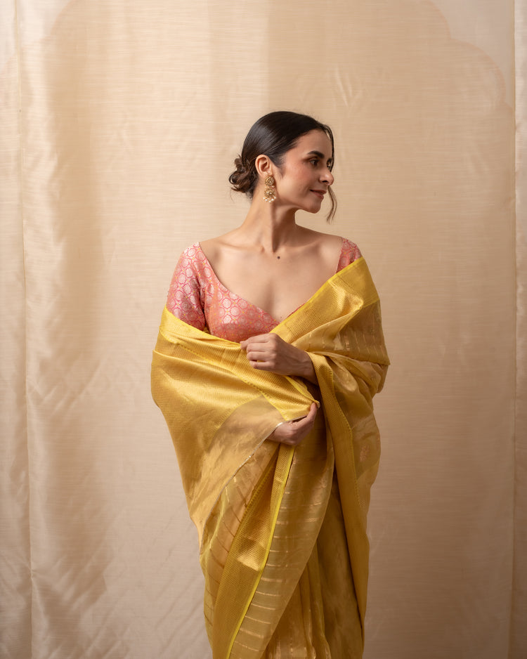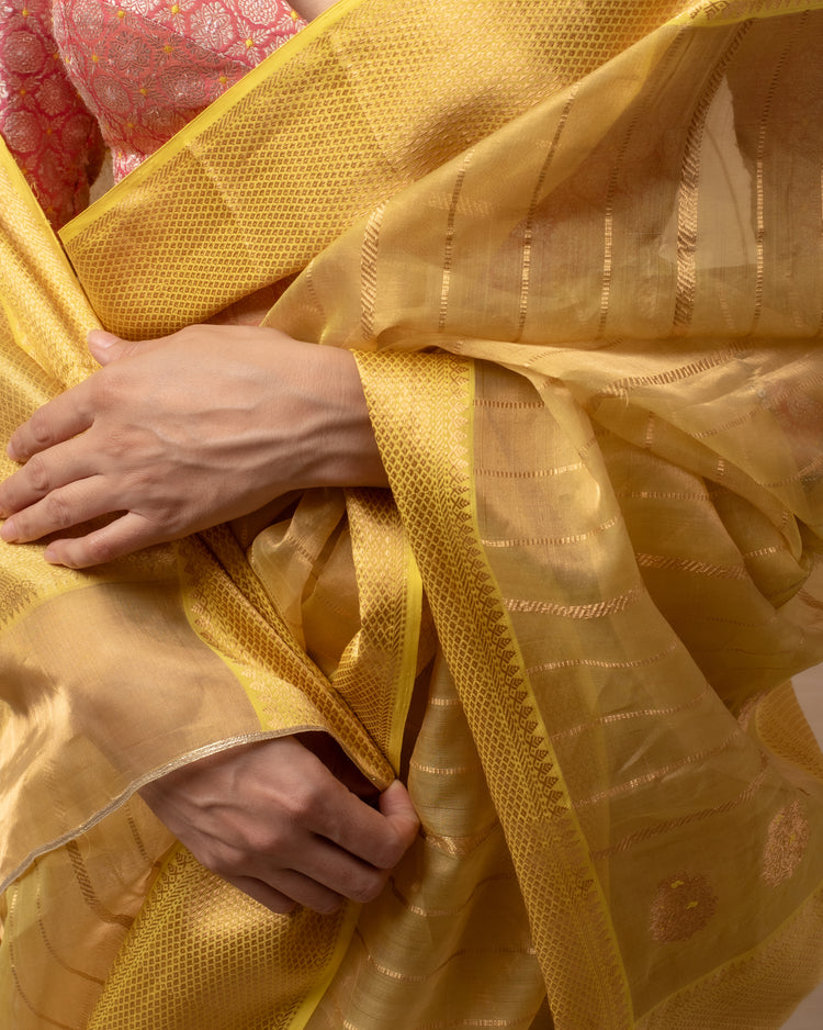 Yellow-gold silk chanderi striped saree with geometric border and palla