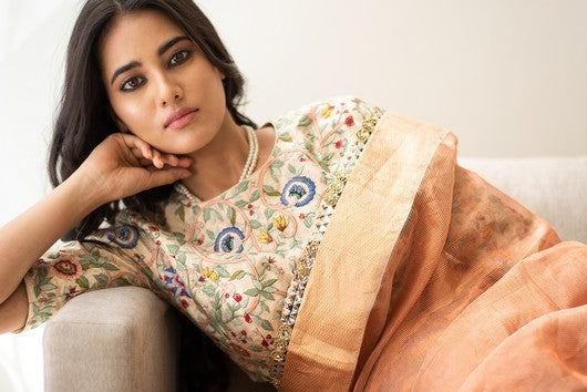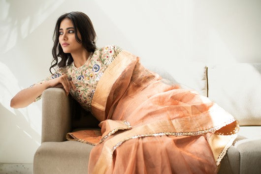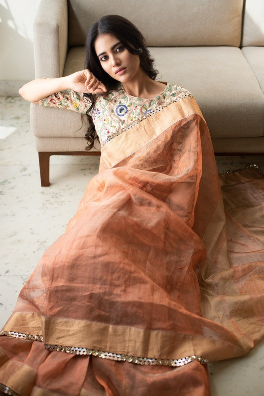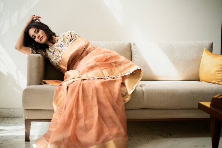Maheshwari copper tissue sari with intricate zardozi border and kashida hand embroidered blouse.