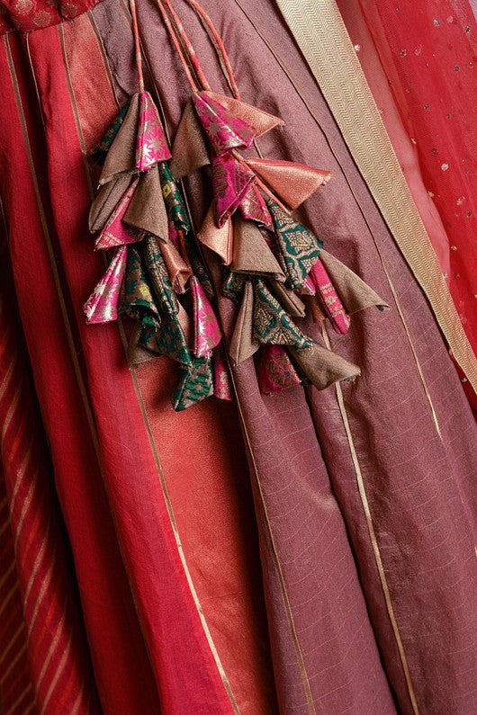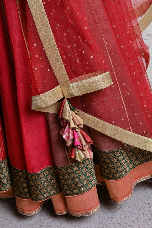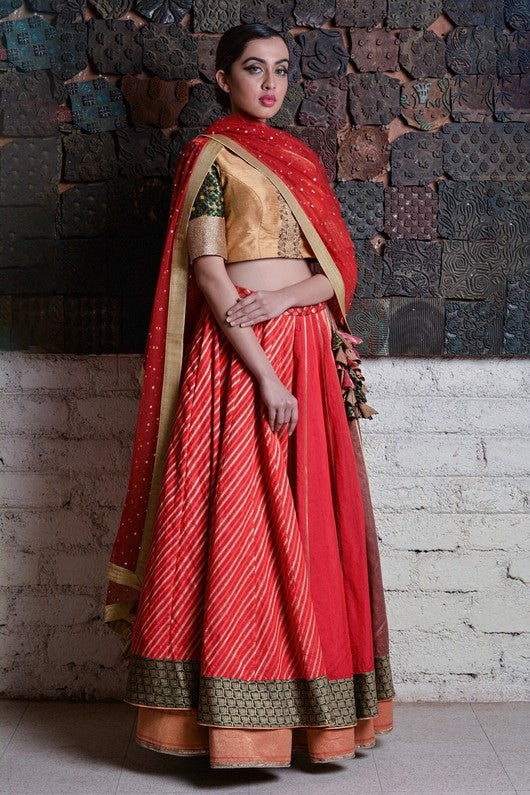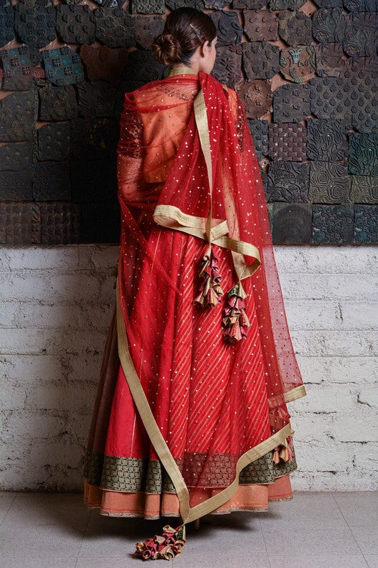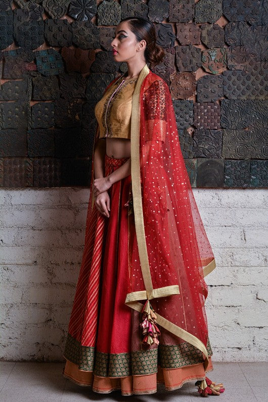 Silk chanderi layered lehenga paired with zardozi embroidered blouse and tulle dupatta with makaish bindu