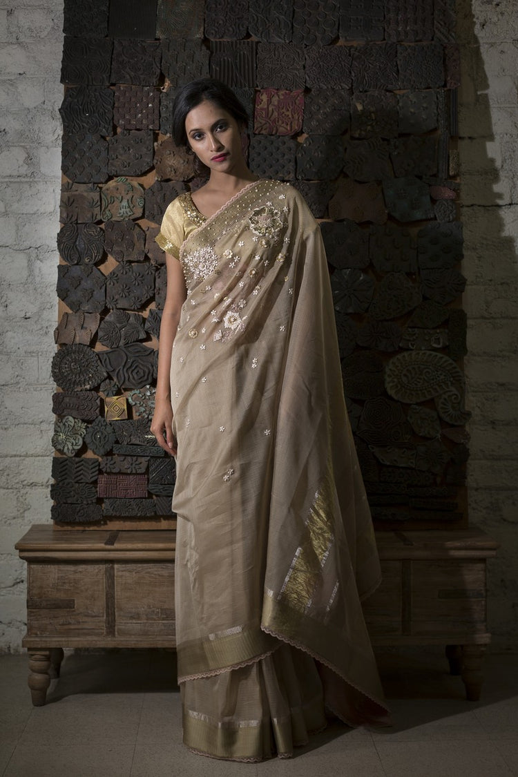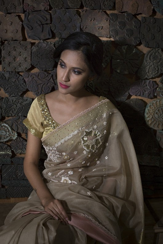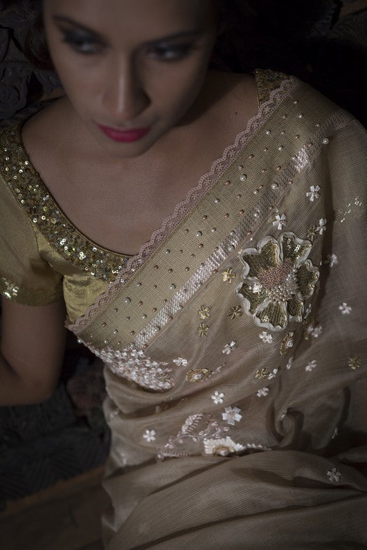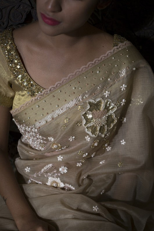 Maheshwari sari enhanced enhanced with handmade ribbon embroidered flowers and pearls