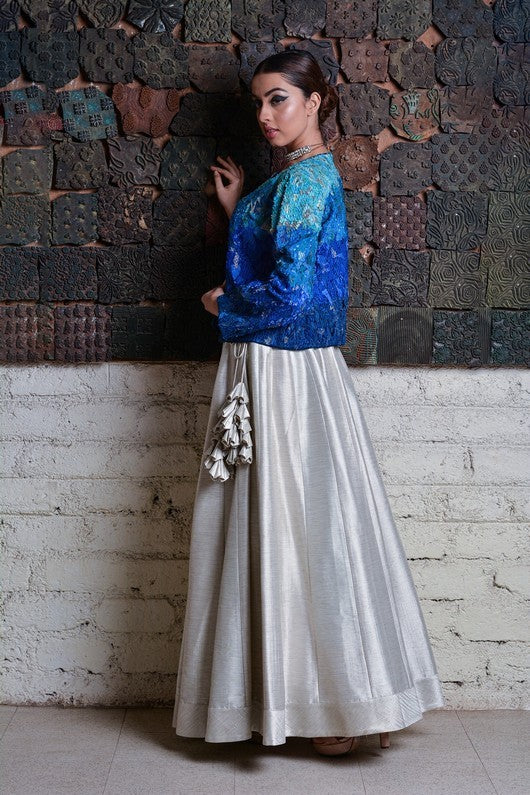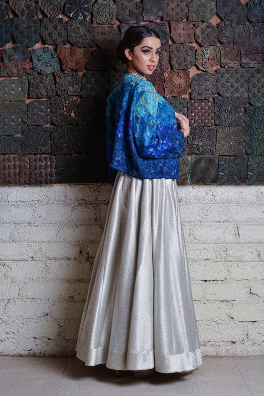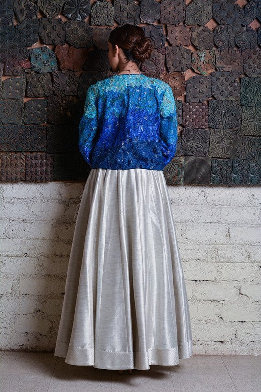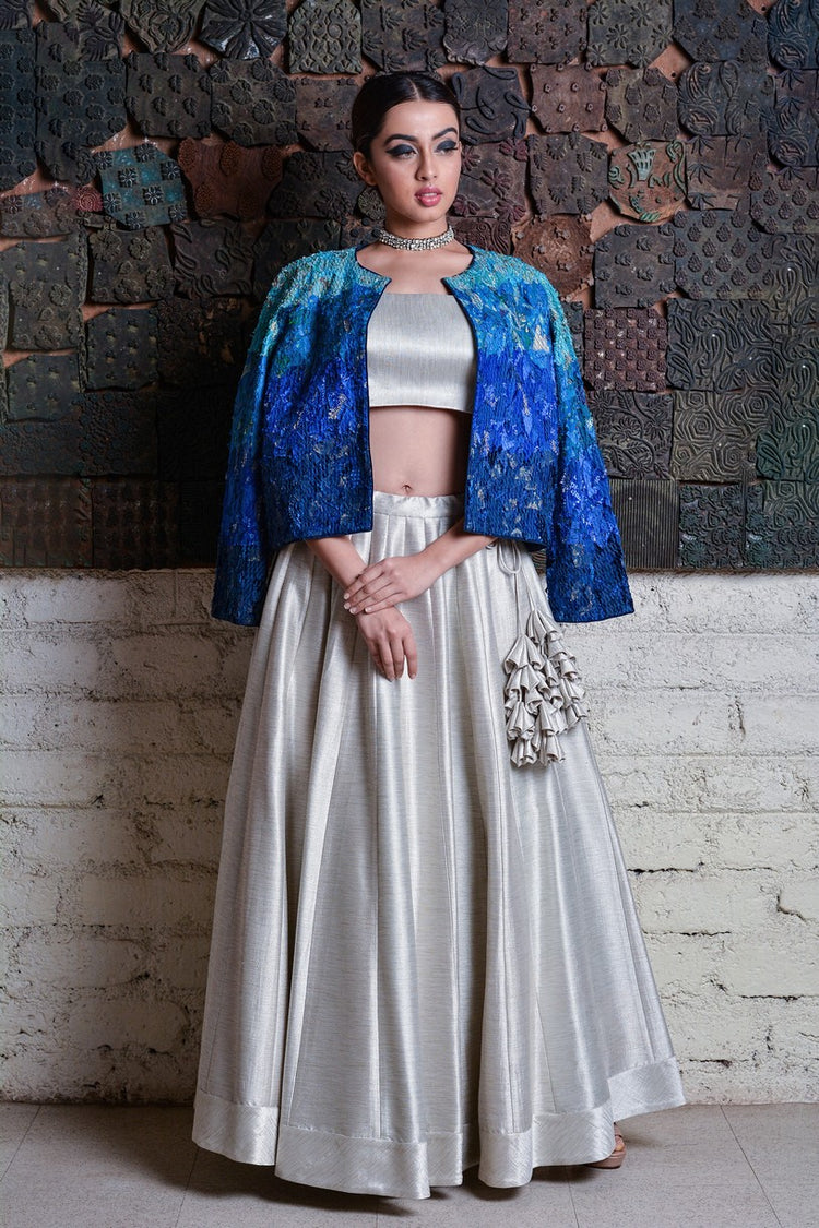 Upcycle patchwork ombre' jacket paired with silver tissue brocade lehenga