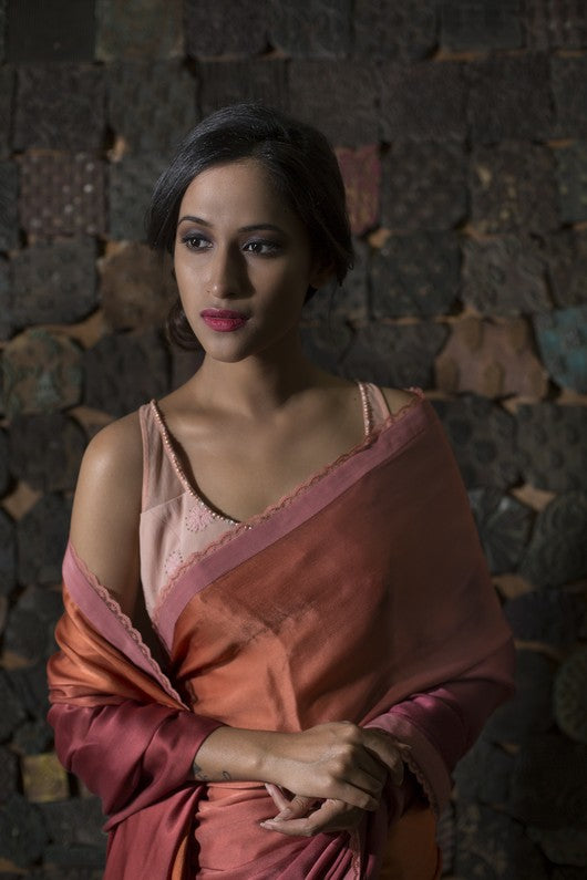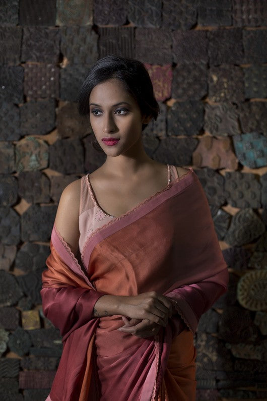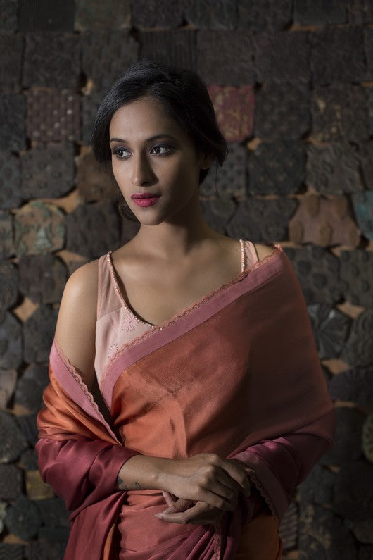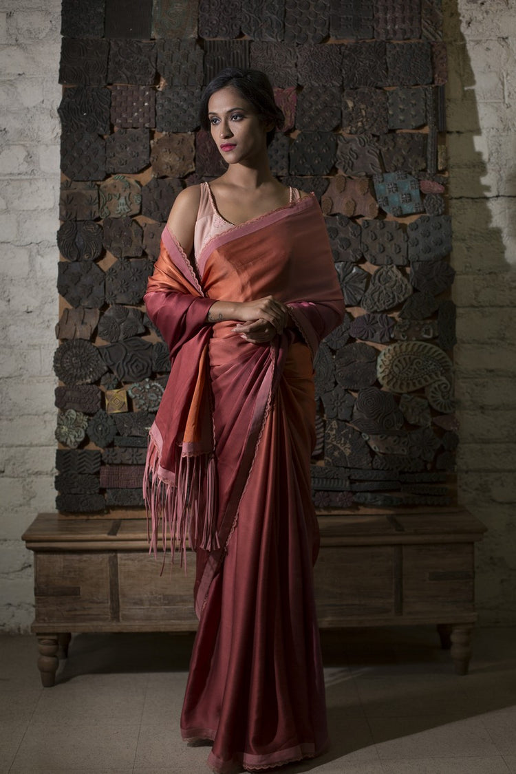 Ombre shaded silk sari in shades of corals with fringes and lace