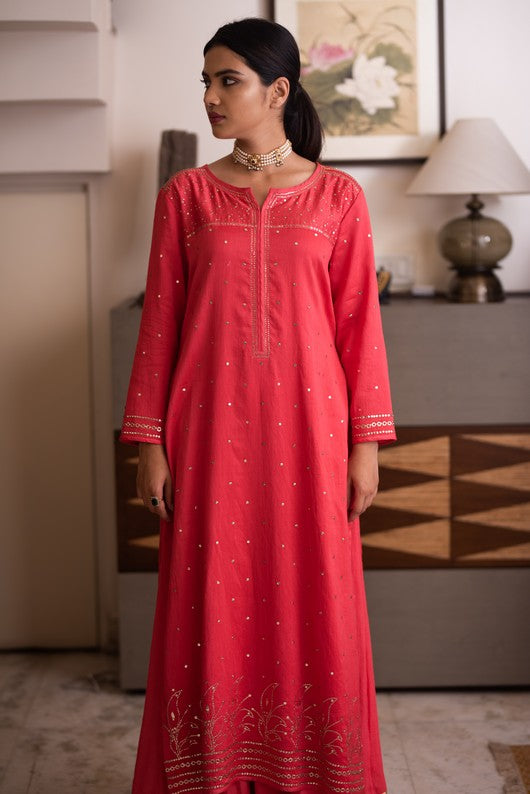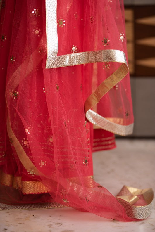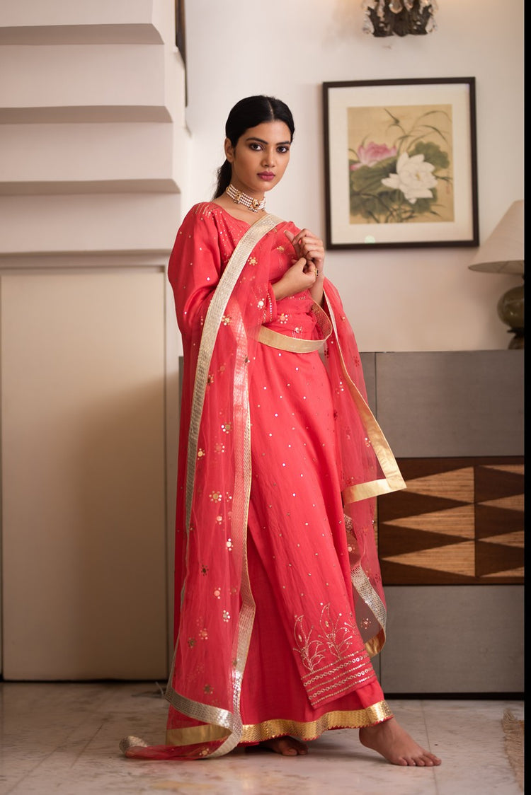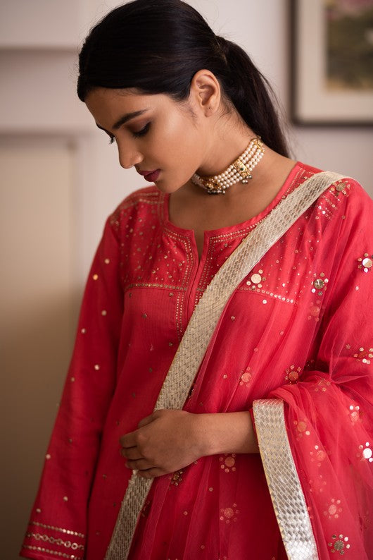 Chanderi kurta with makaish embroidary and sharara paired with tulle dupatta with makaish and gota