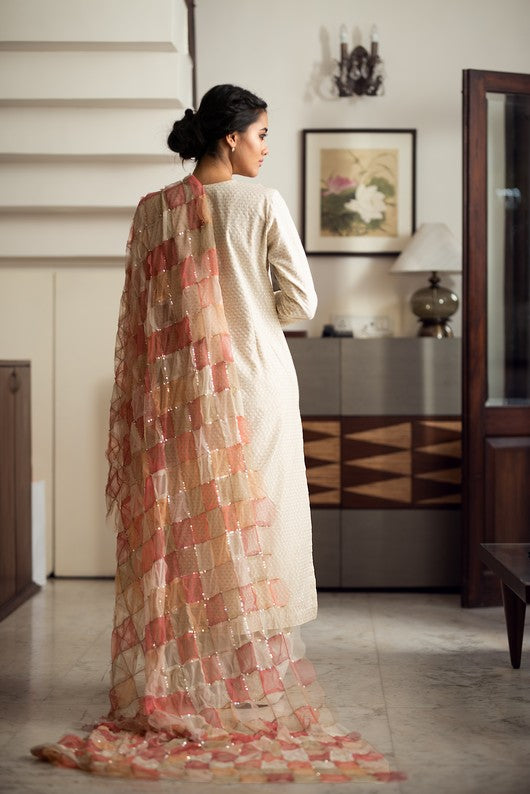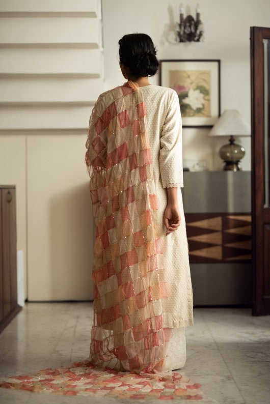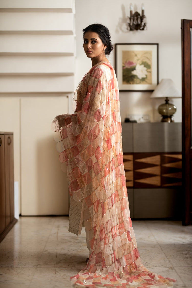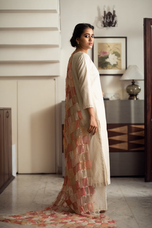 Upcycled patchwork 3D dupatta with sequins and swarovski paired with chanderi brocade kurta and pallazo