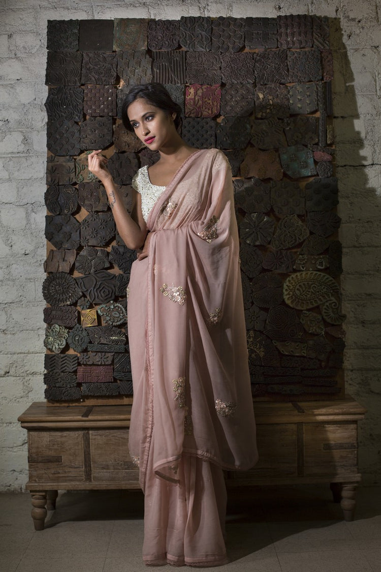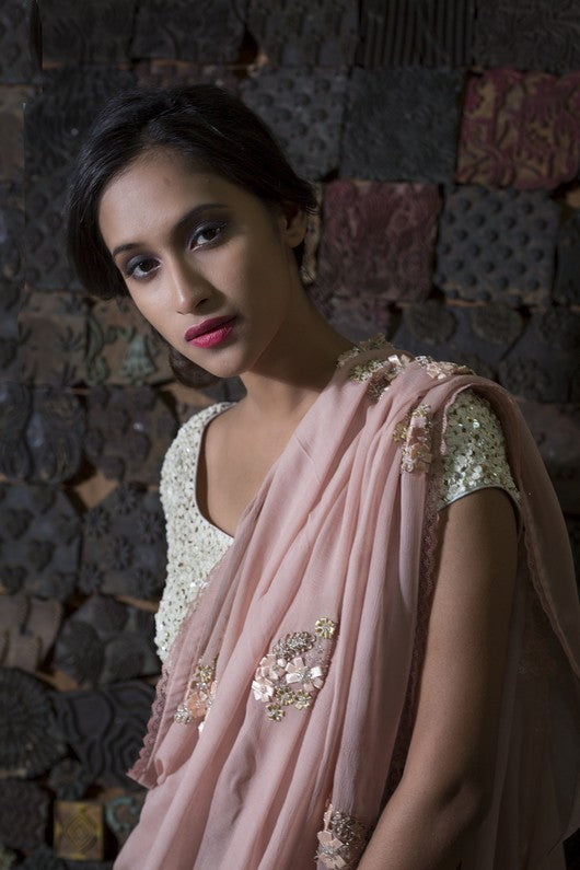 Silk chiffon sari with butas of flowers of ribbons, sequins, crystals and pearls
