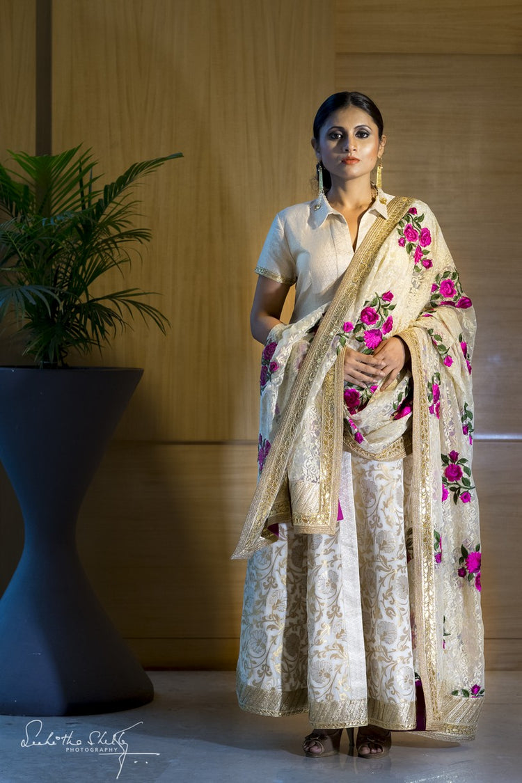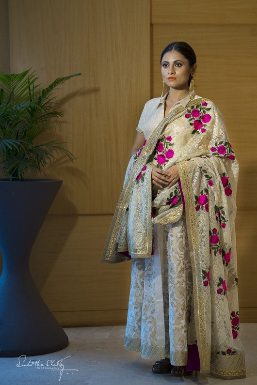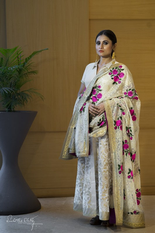 Lace dupatta with embroidered floral butas paired with silk brocade anarkali
