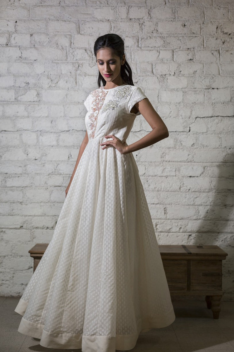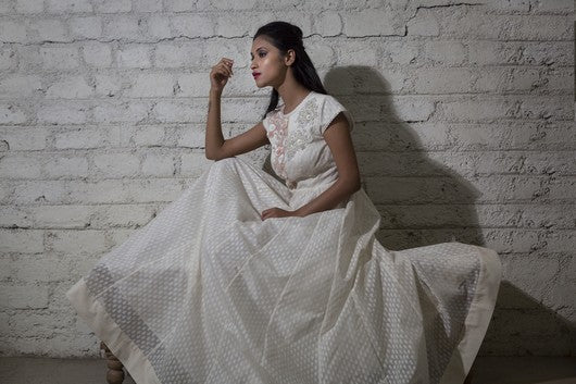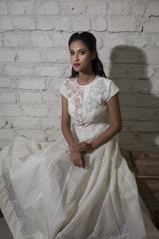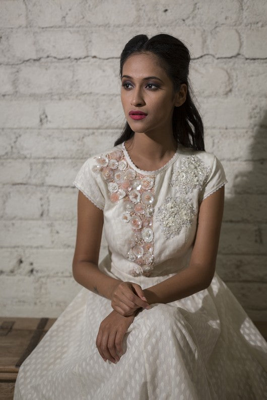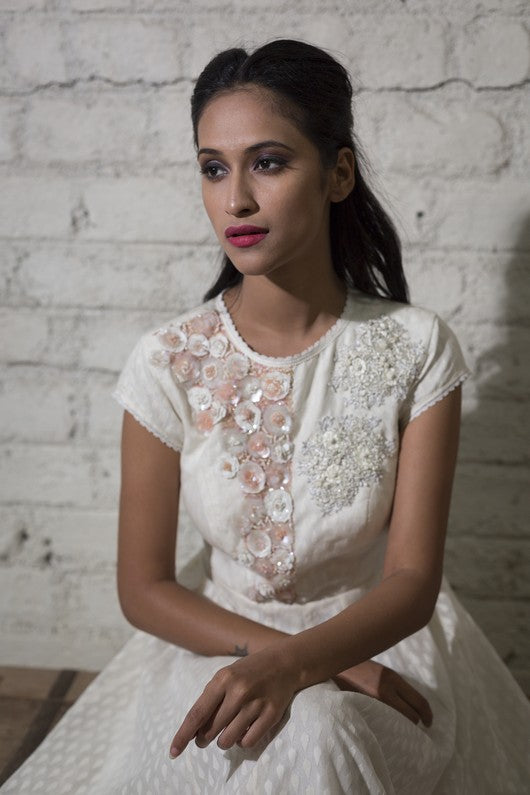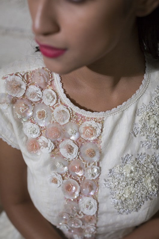 Chanderi cotton brocade outfit with flowers of ribbons,sequins and pearls