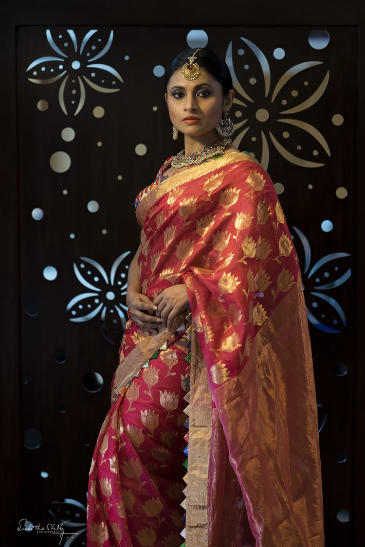 Chanderi silk sari with lotuses all over edged with brocade handcrafted trim