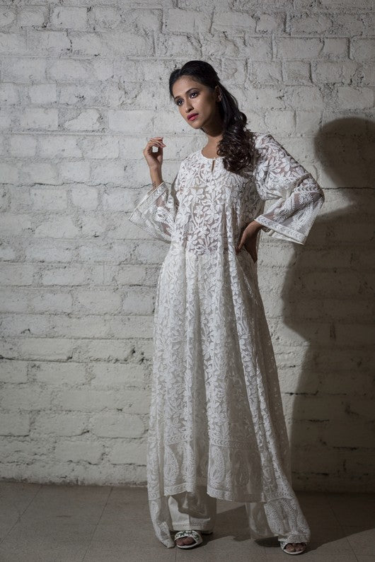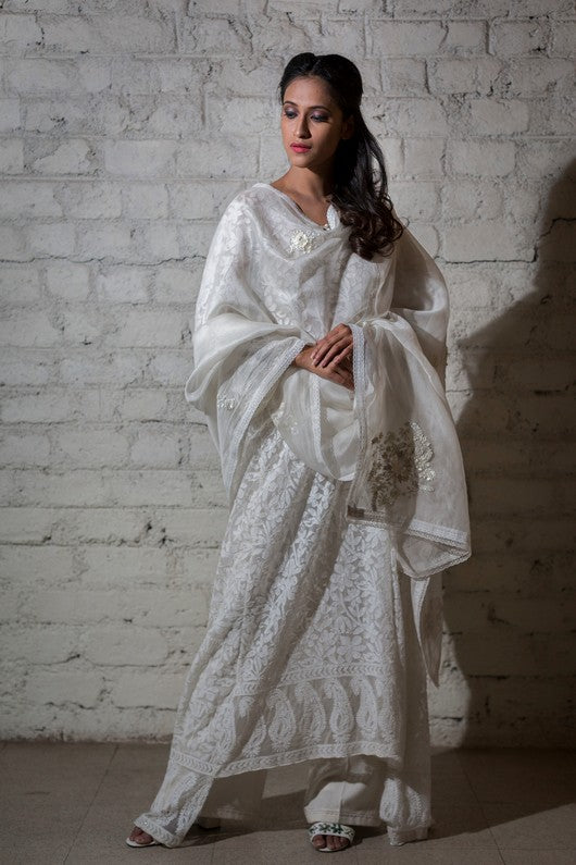 Tulle chikankari asymmetric kurta paired with pallazo and chanderi dupatta embroidered with floral butas