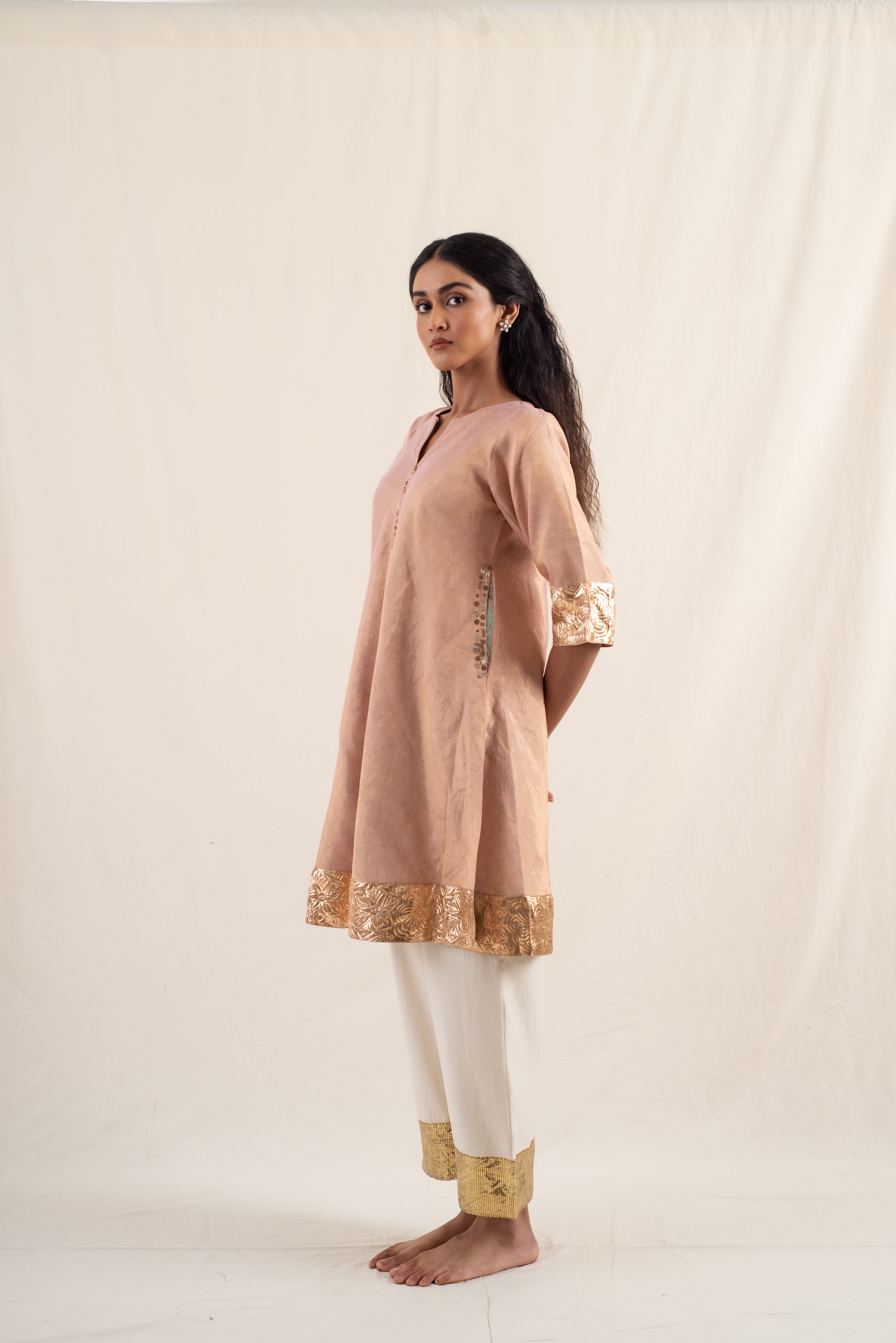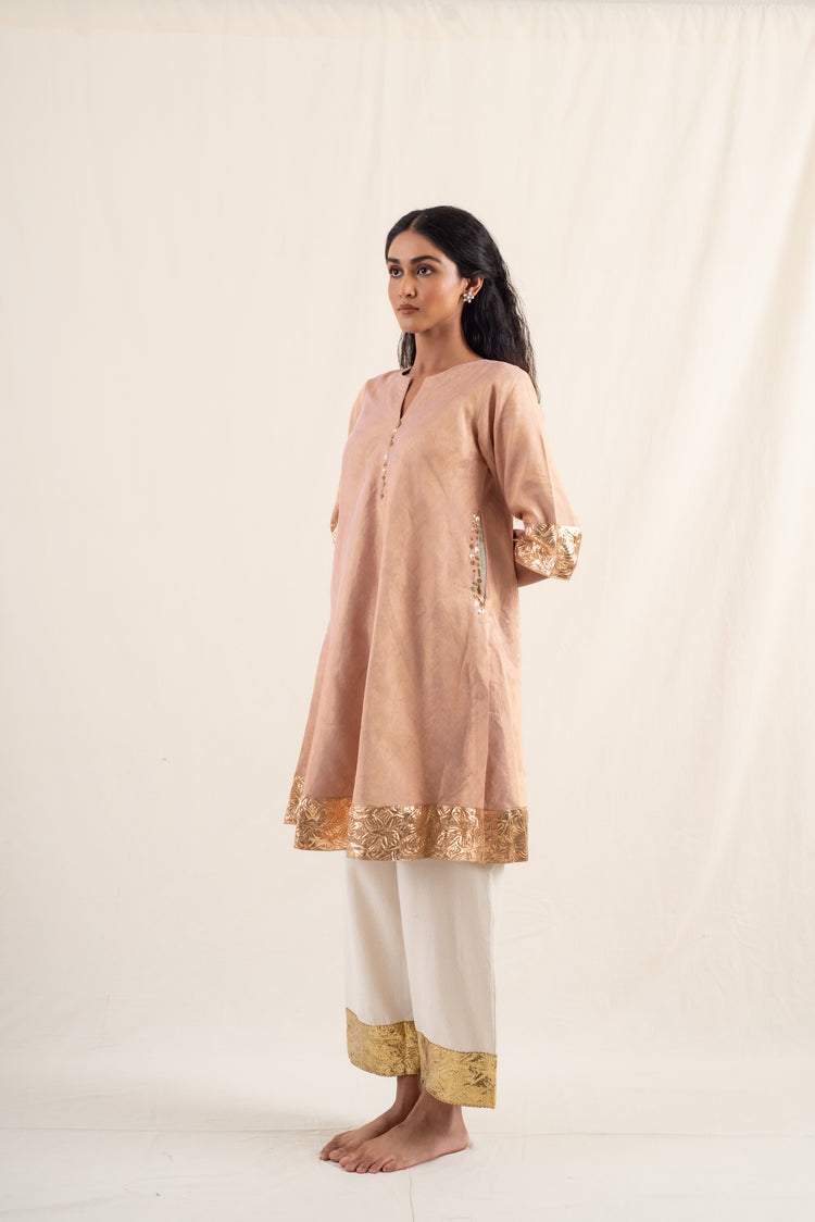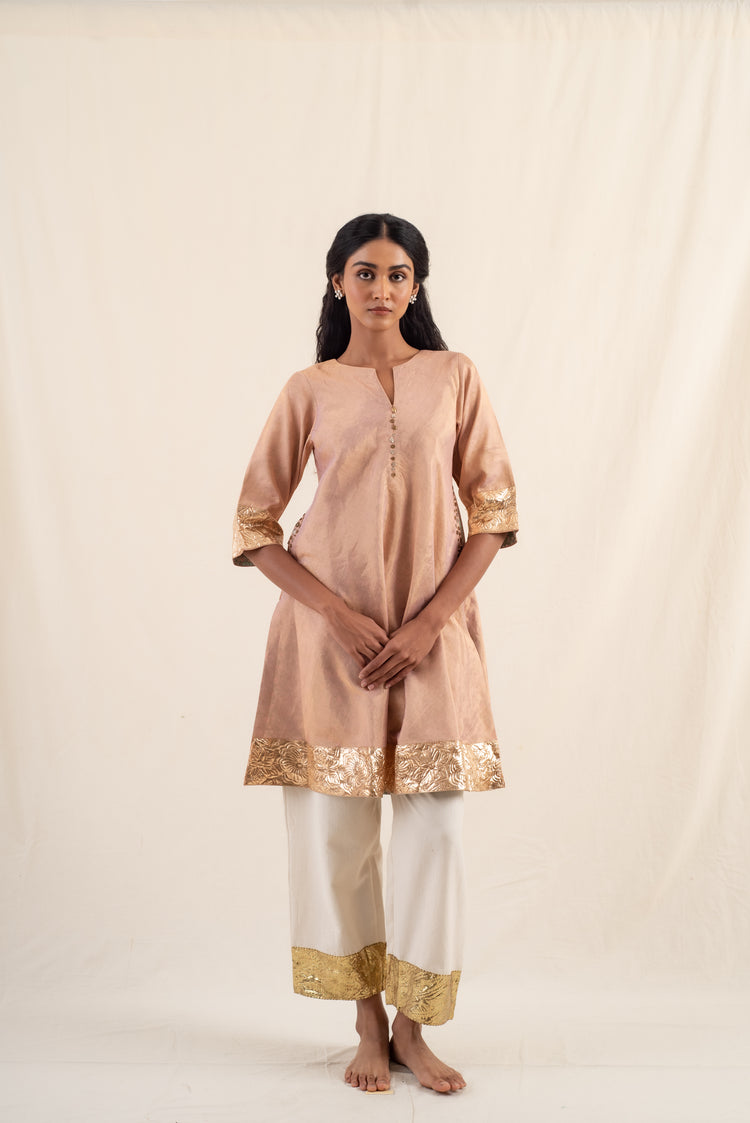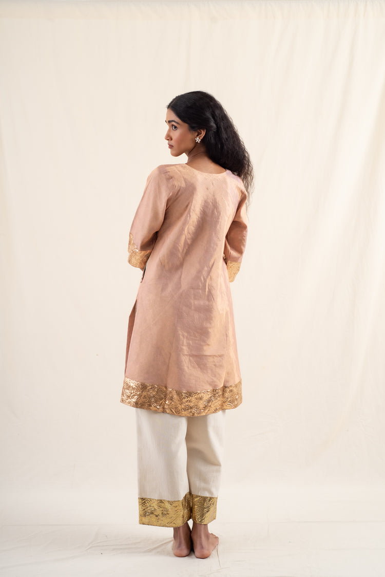 Peach silk chanderi tissue kurta with gold lampi finishing and metal work embroidered details paired with organic cotton wide leg pants with lampi finishing.