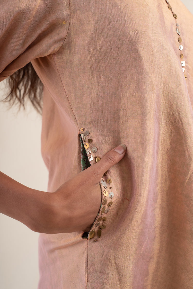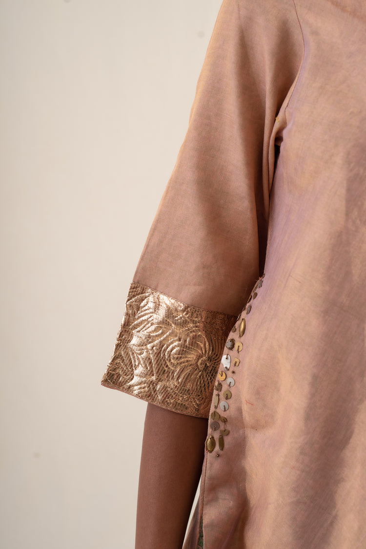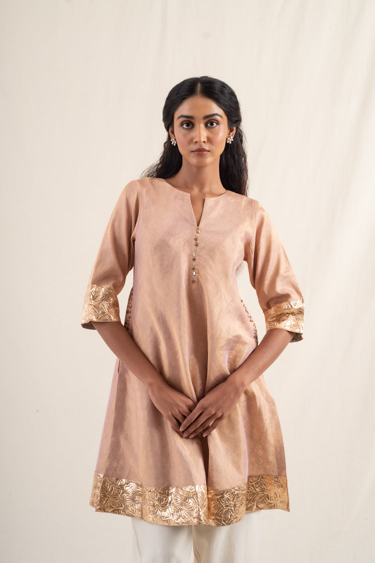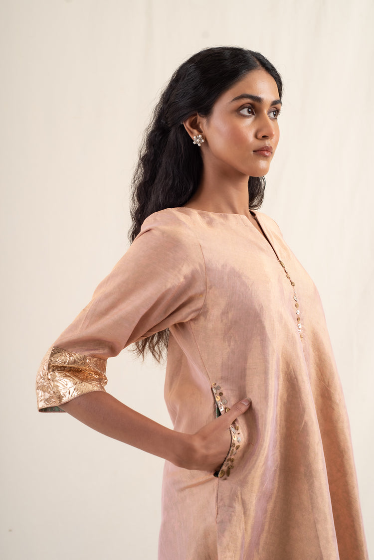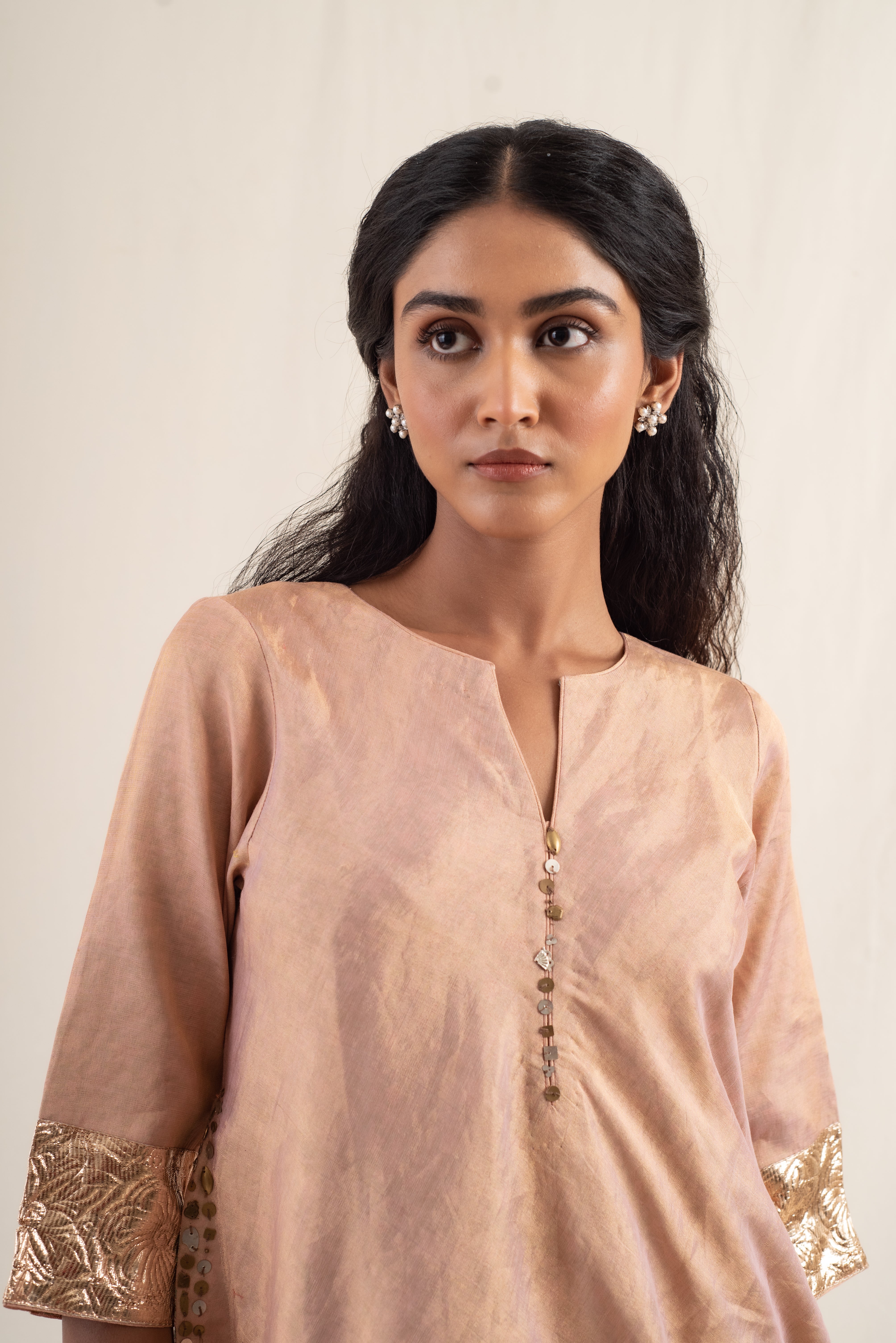 Peach silk chanderi tissue kurta with gold lampi finishing and metal work embroidered details paired with organic cotton wide leg pants with lampi finishing.