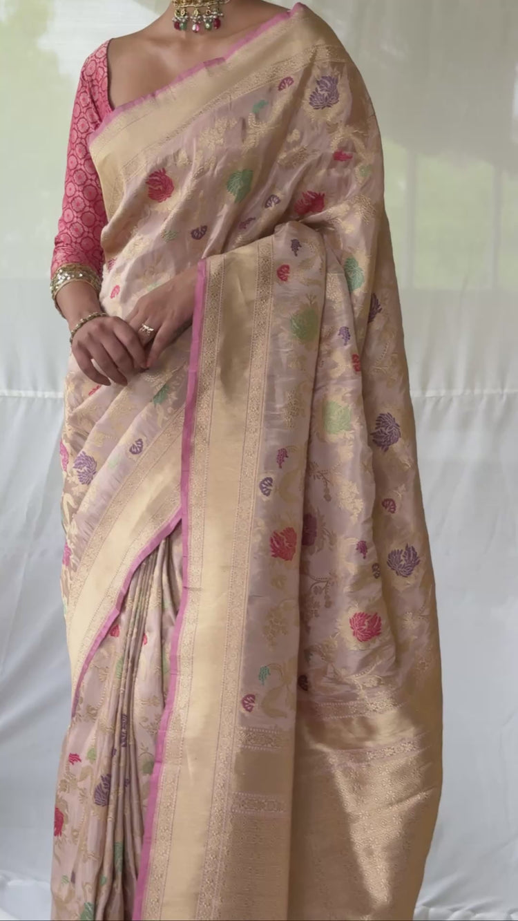 Blush Banarasi Silk tissue saree with floral (phool) jaal woven with kadua and meenakari technique with gold border and palla. The saree is paired with Reva, a pink brocade blouse.