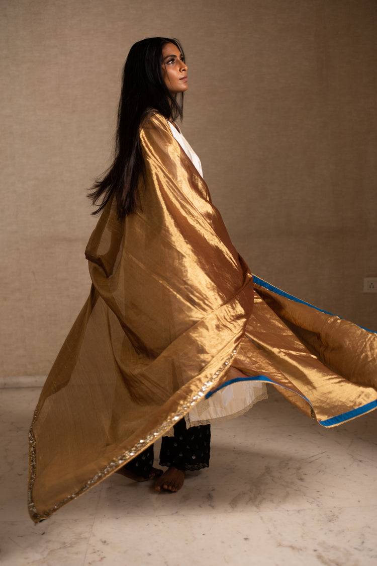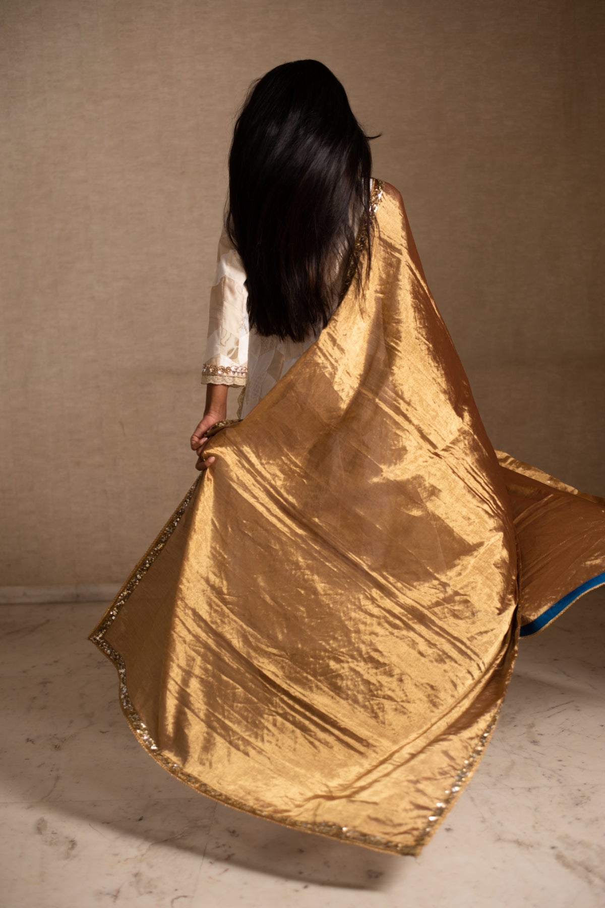 Gold silk tissue chanderi dupatta bordered with hand embroidered sequins