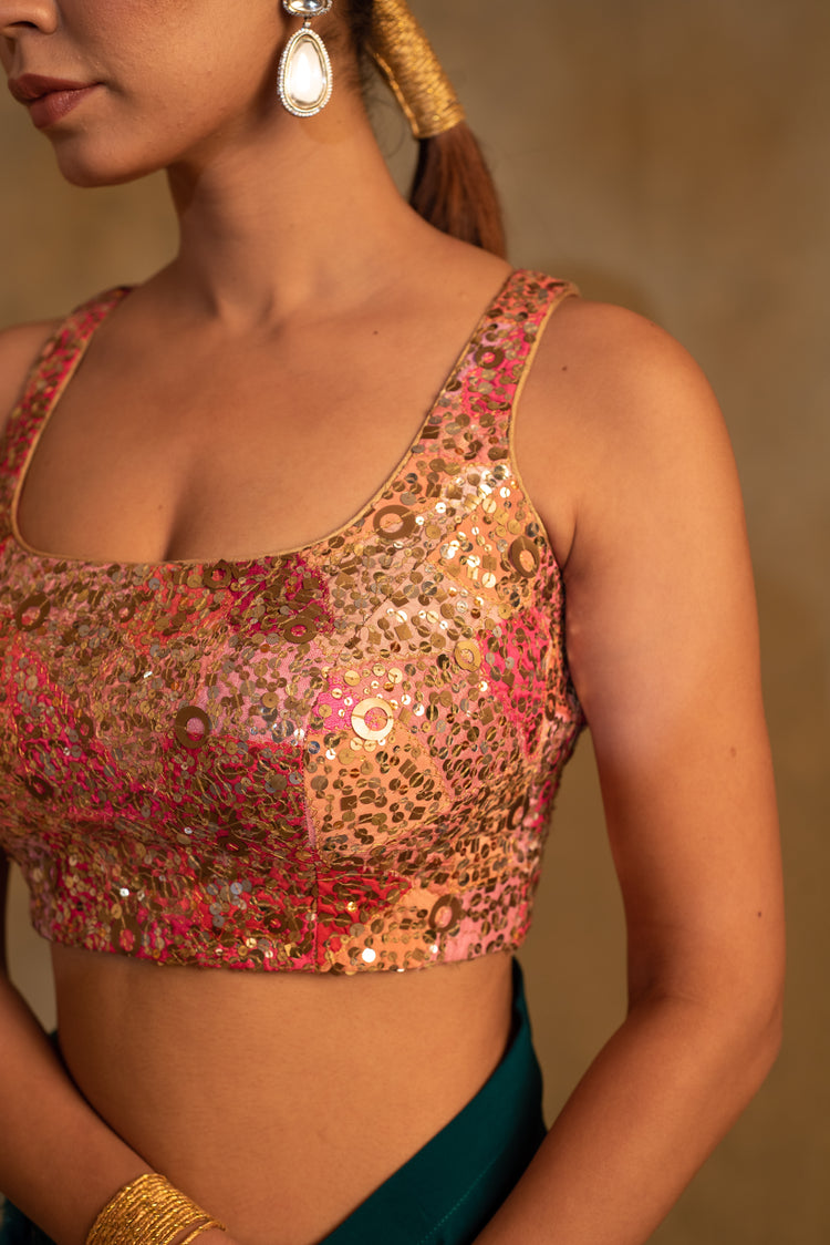 Upcycled blouse made with remnants of silk and brocade in variegated shades with hand embroidered sequin clusters all over. The blouse is made with zero waste philosophy.