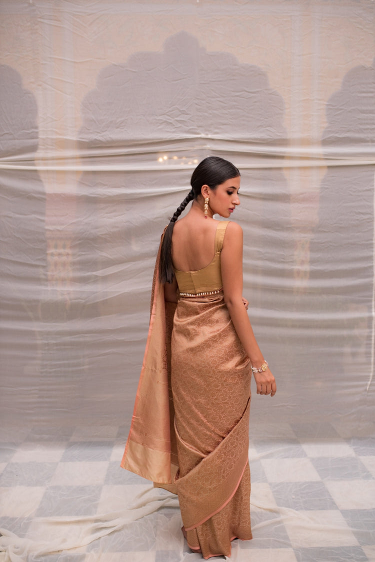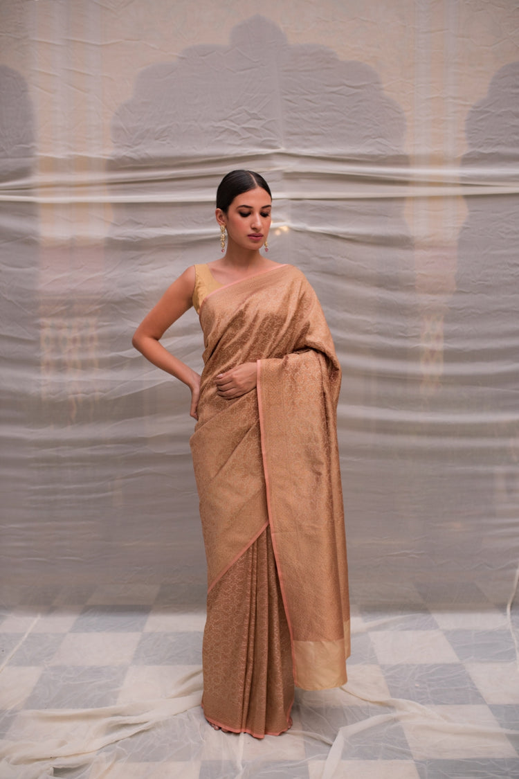 Pink silk brocade banarasi saree with all over floral jaal in vintage gold with meenakari.