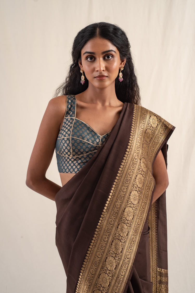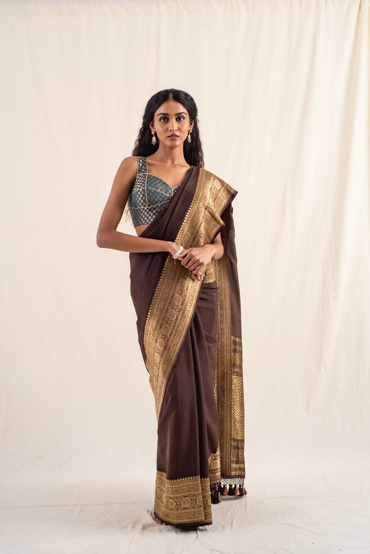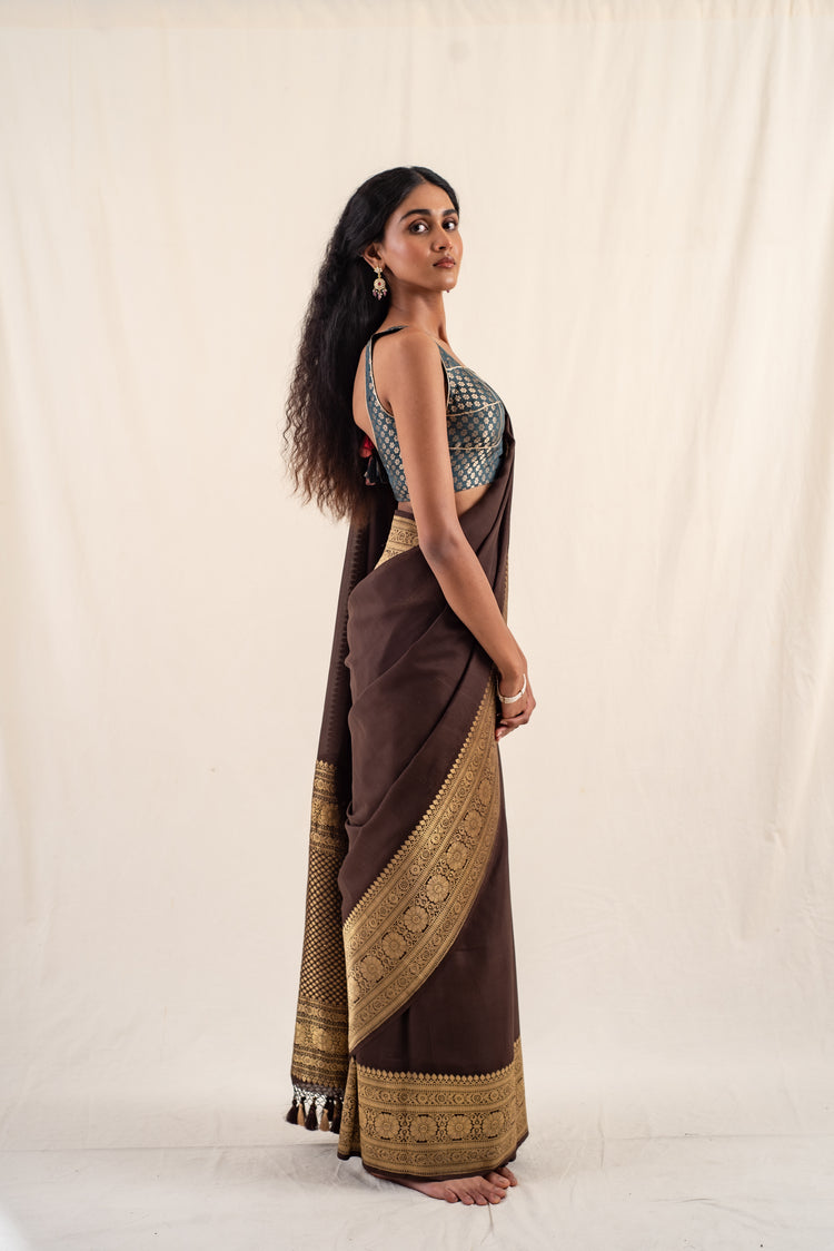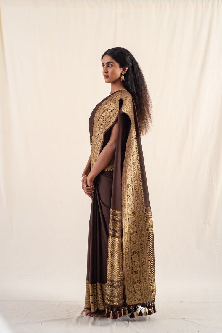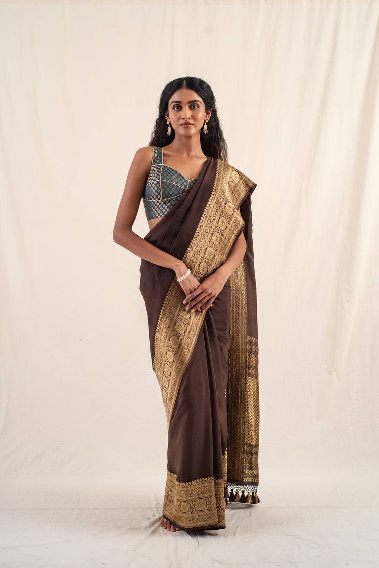 Chocolate brown silk georgette banarasi saree featuring gold floral border and palla