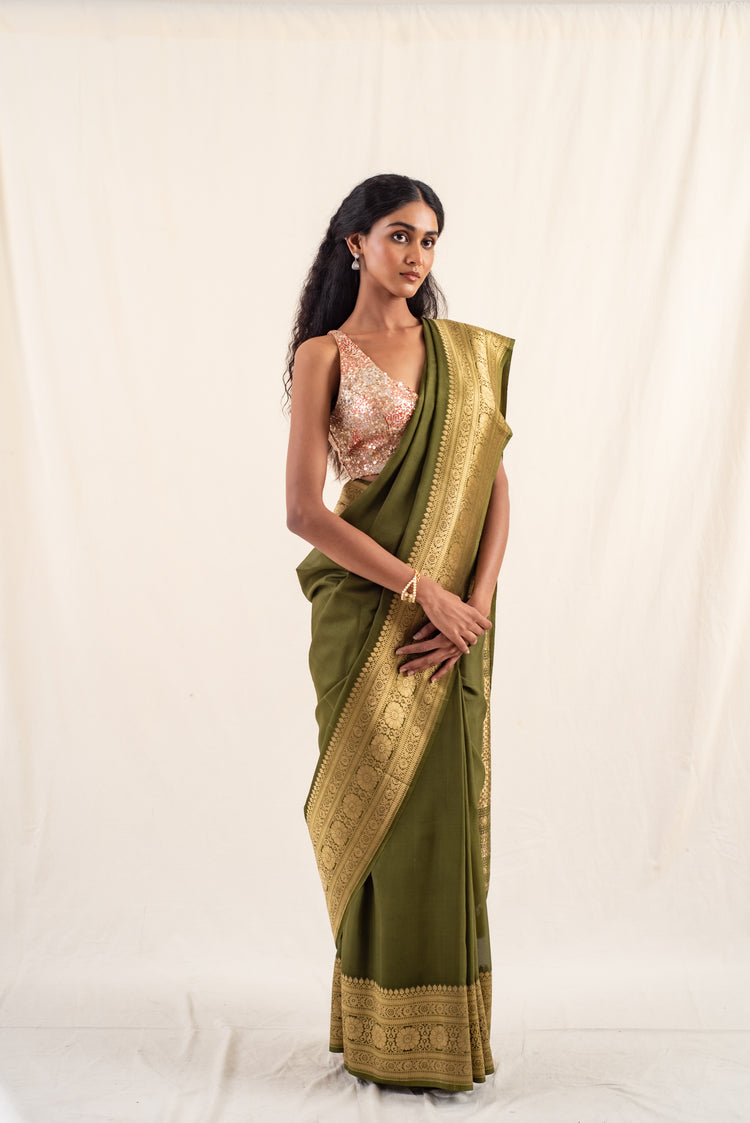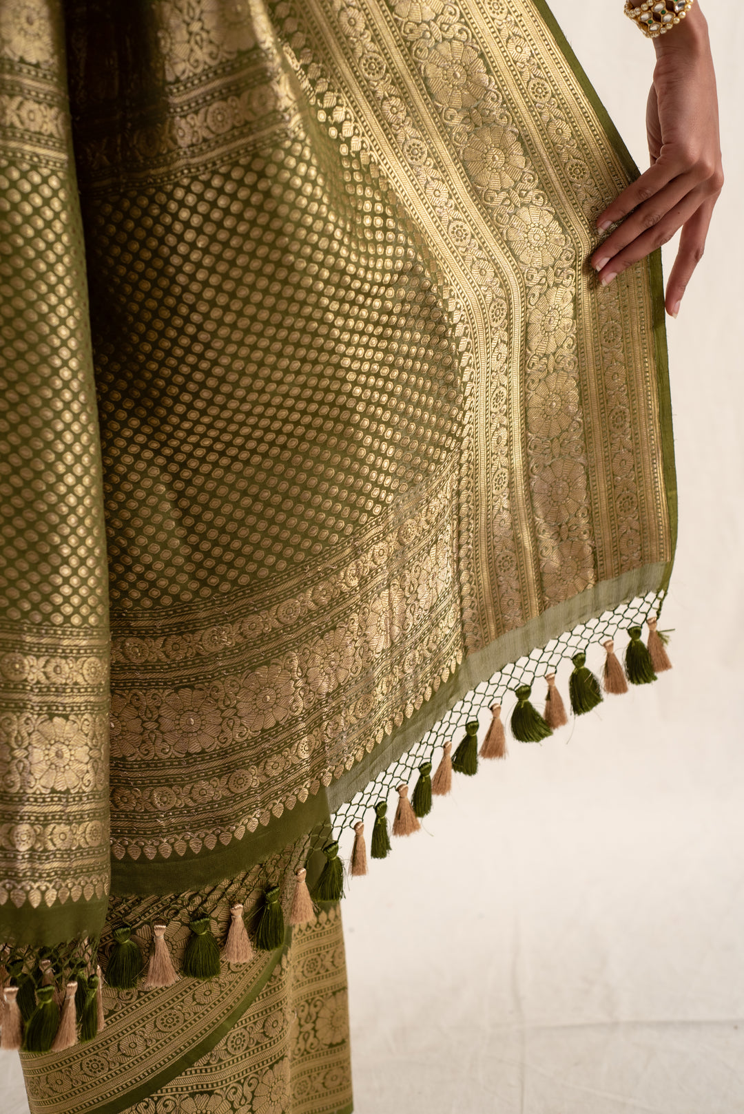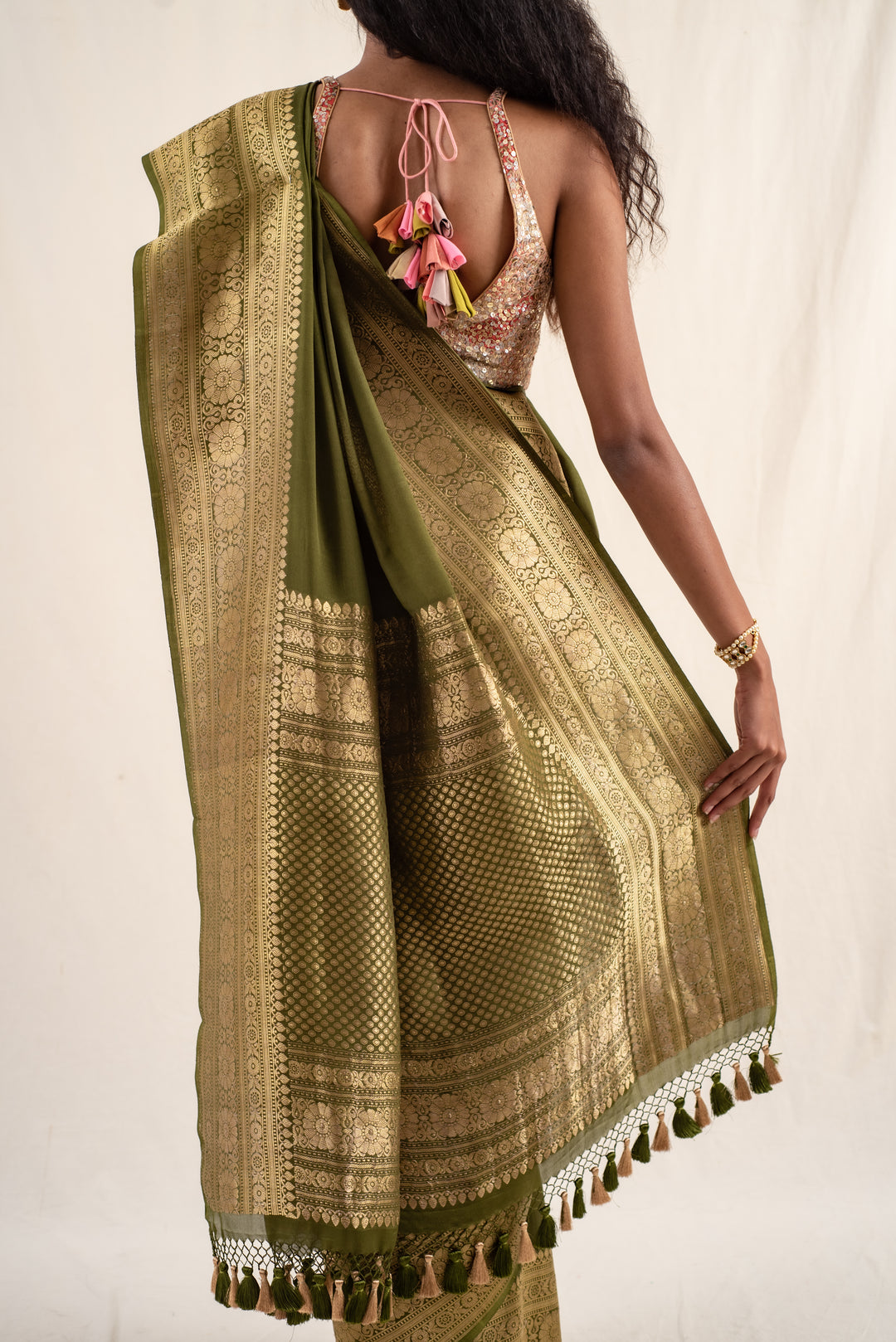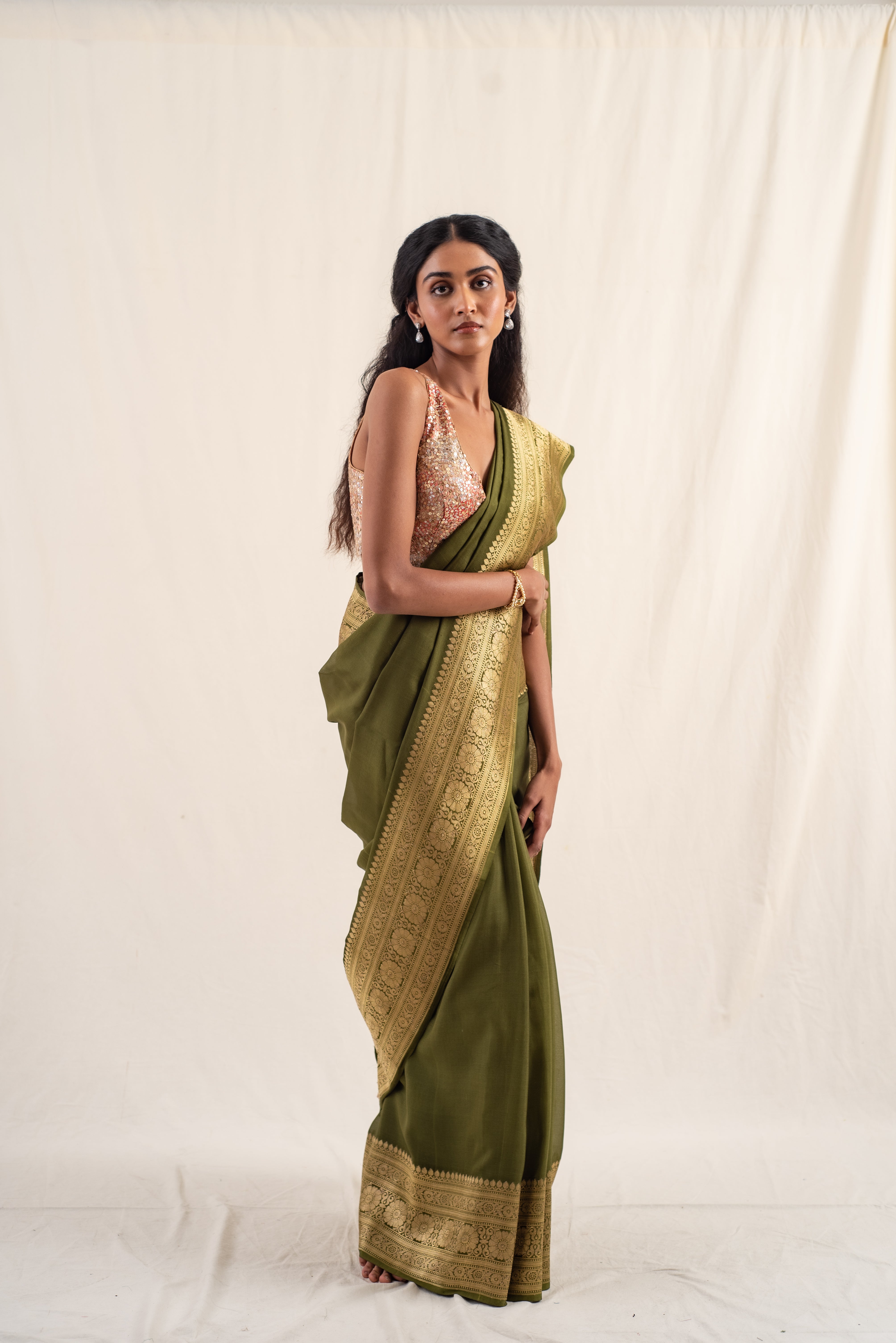 Mehendi green silk georgette banarasi saree featuring gold floral border and palla