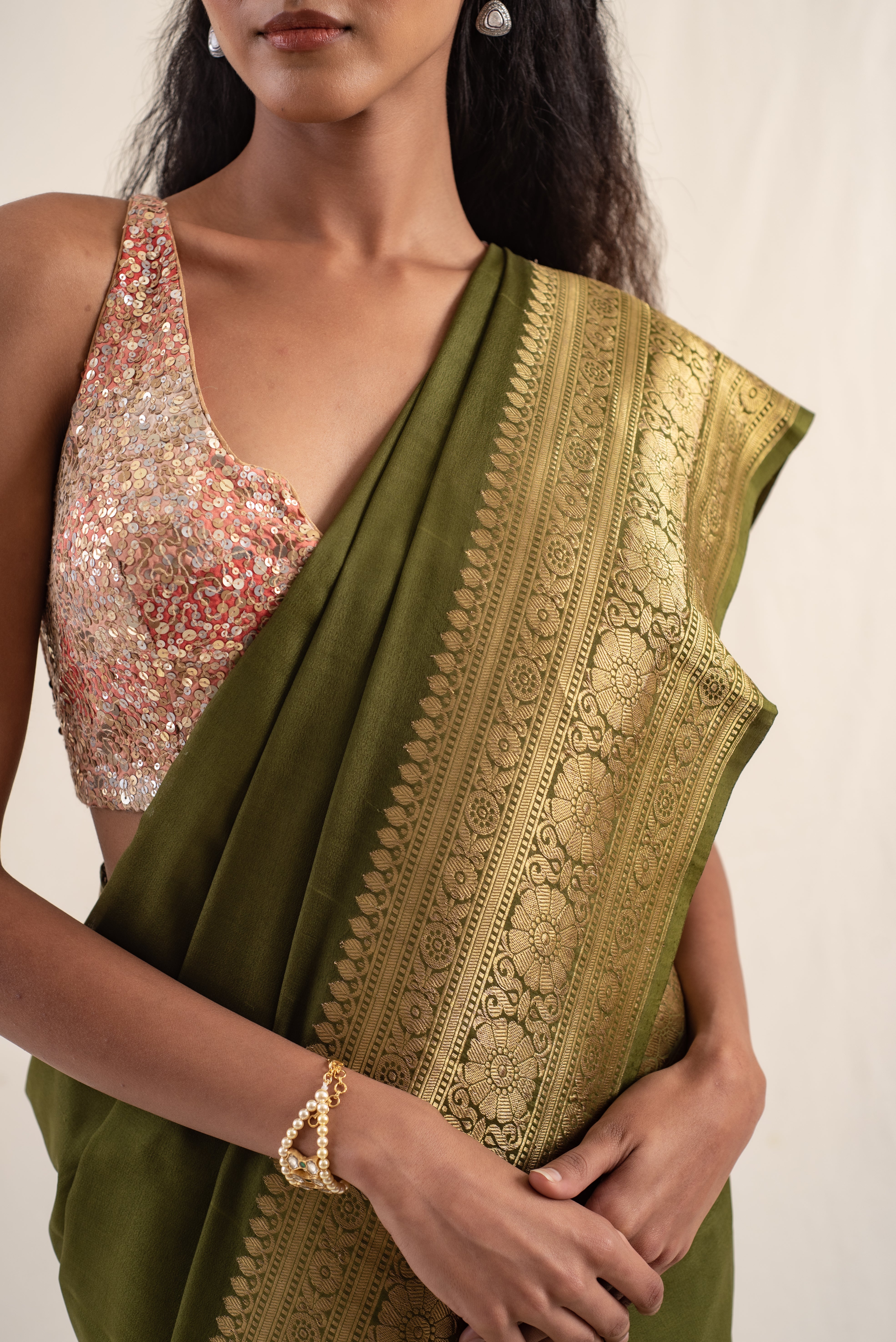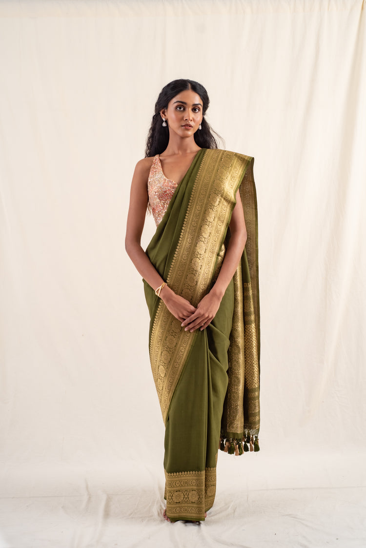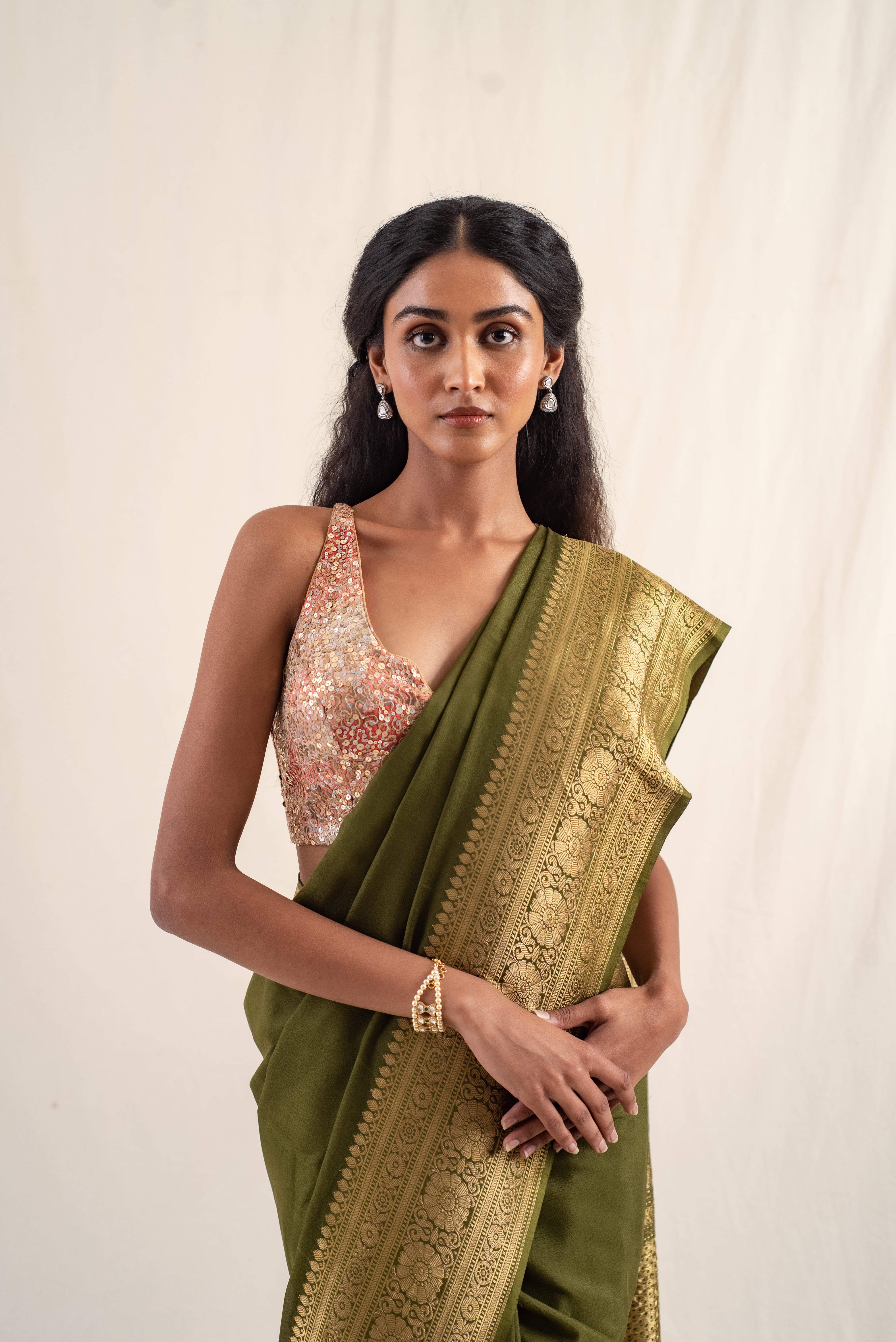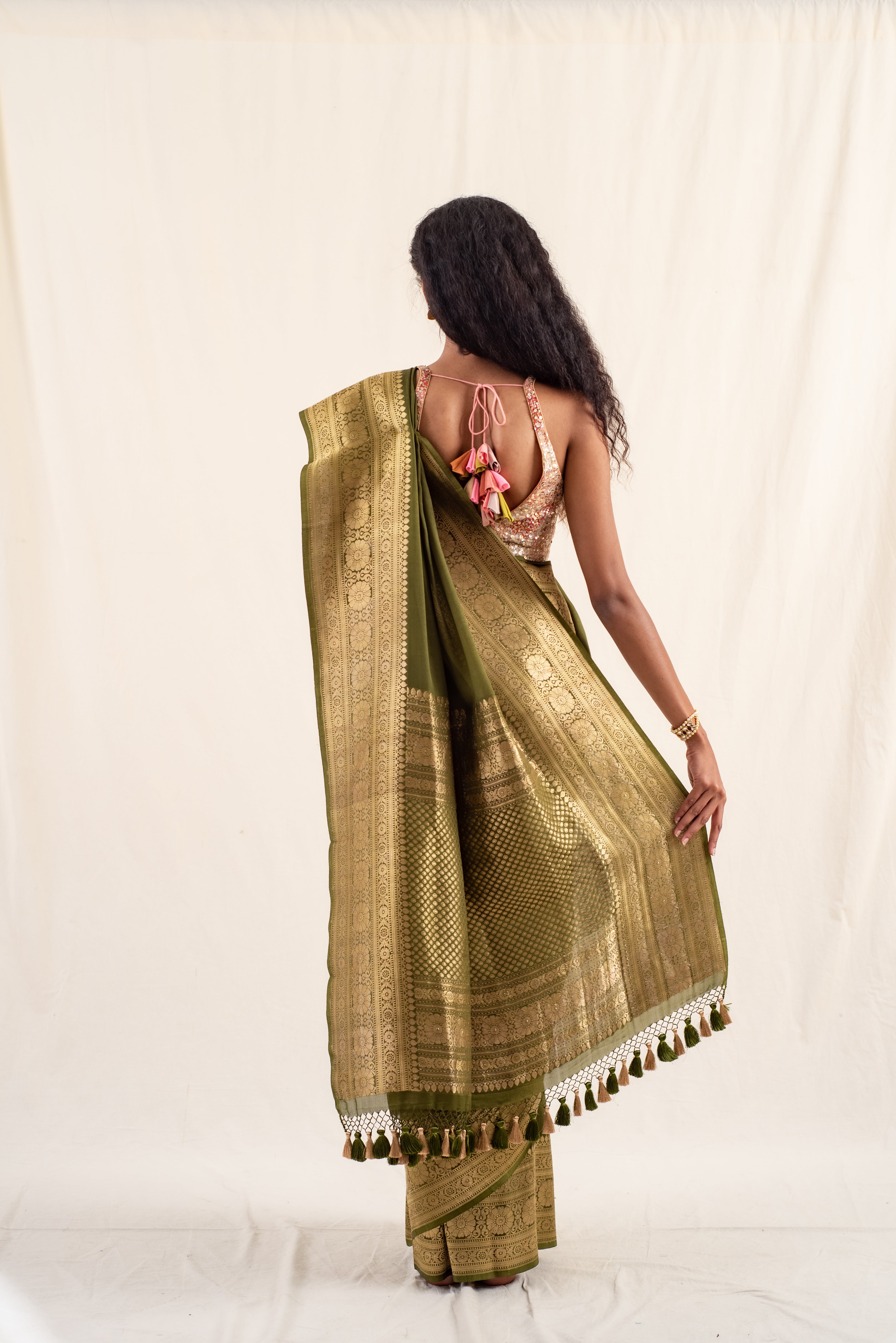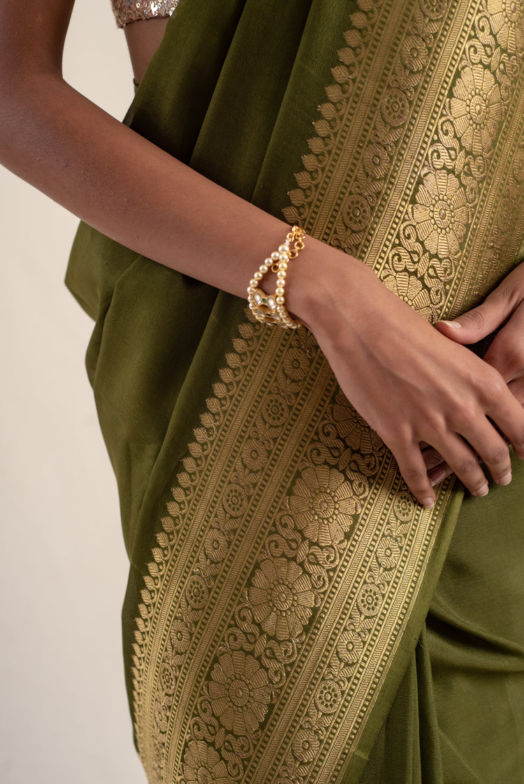 Mehendi green silk georgette banarasi saree featuring gold floral border and palla