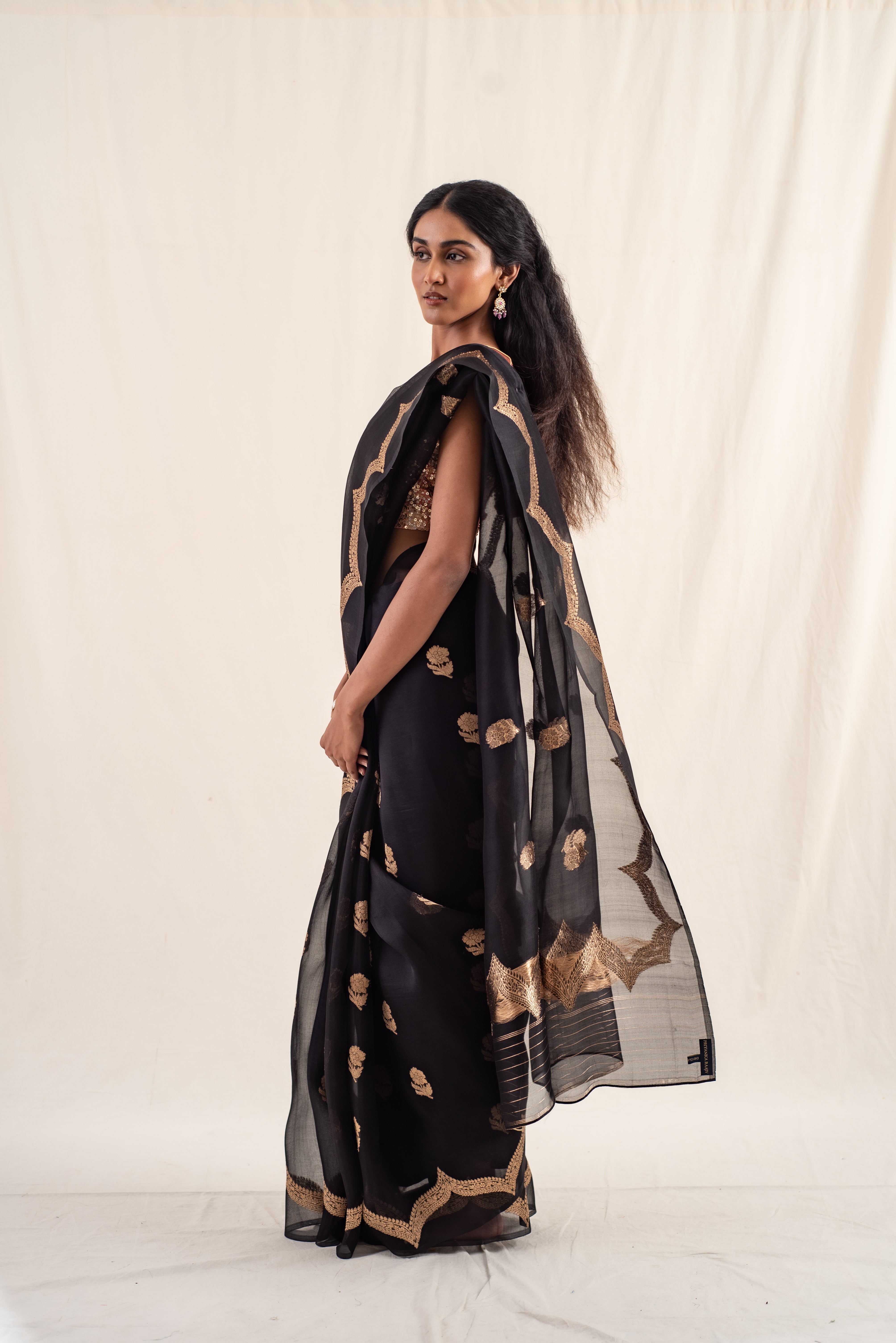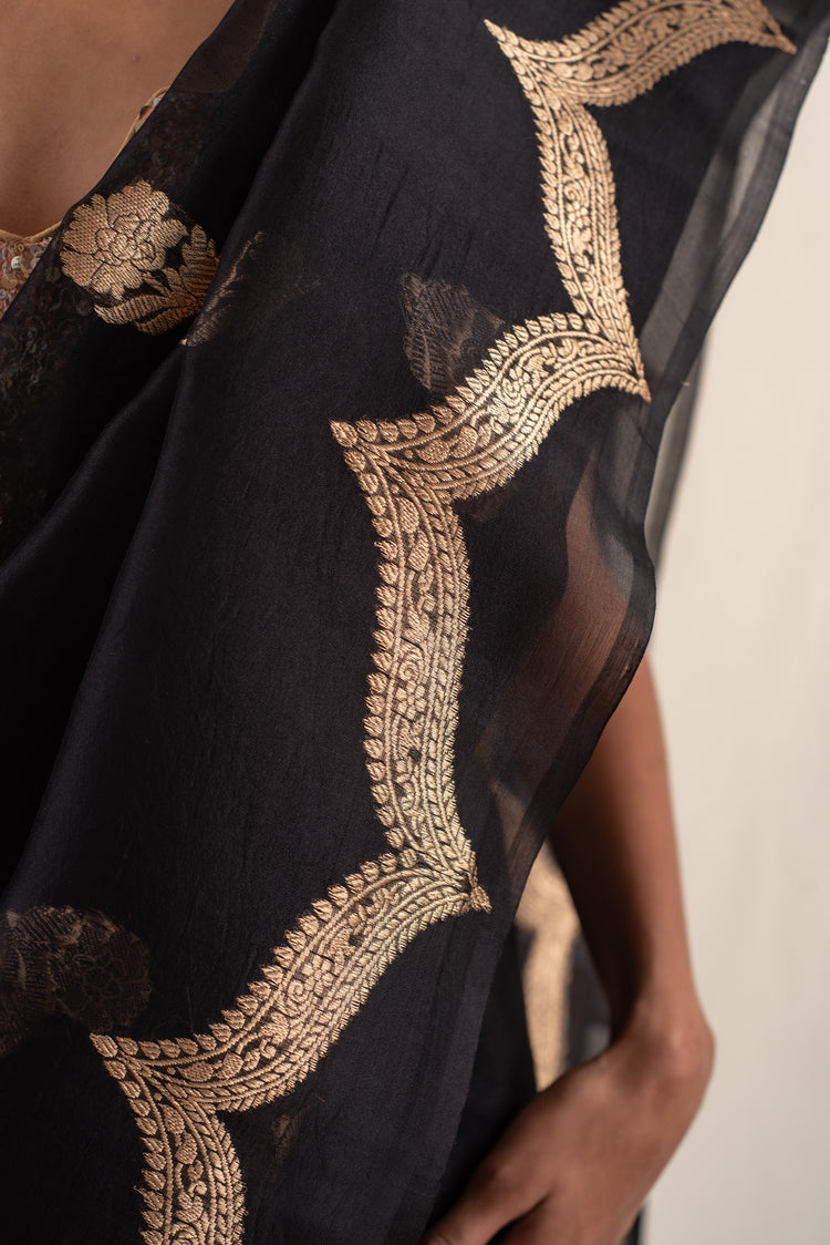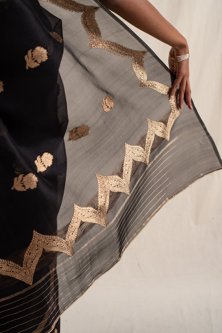 Charcoal black silk organza banarasi saree with gold floral zari buttis and gold arched border