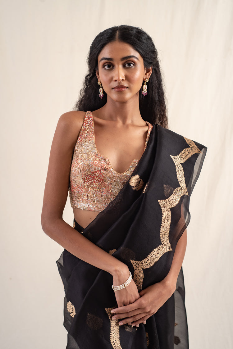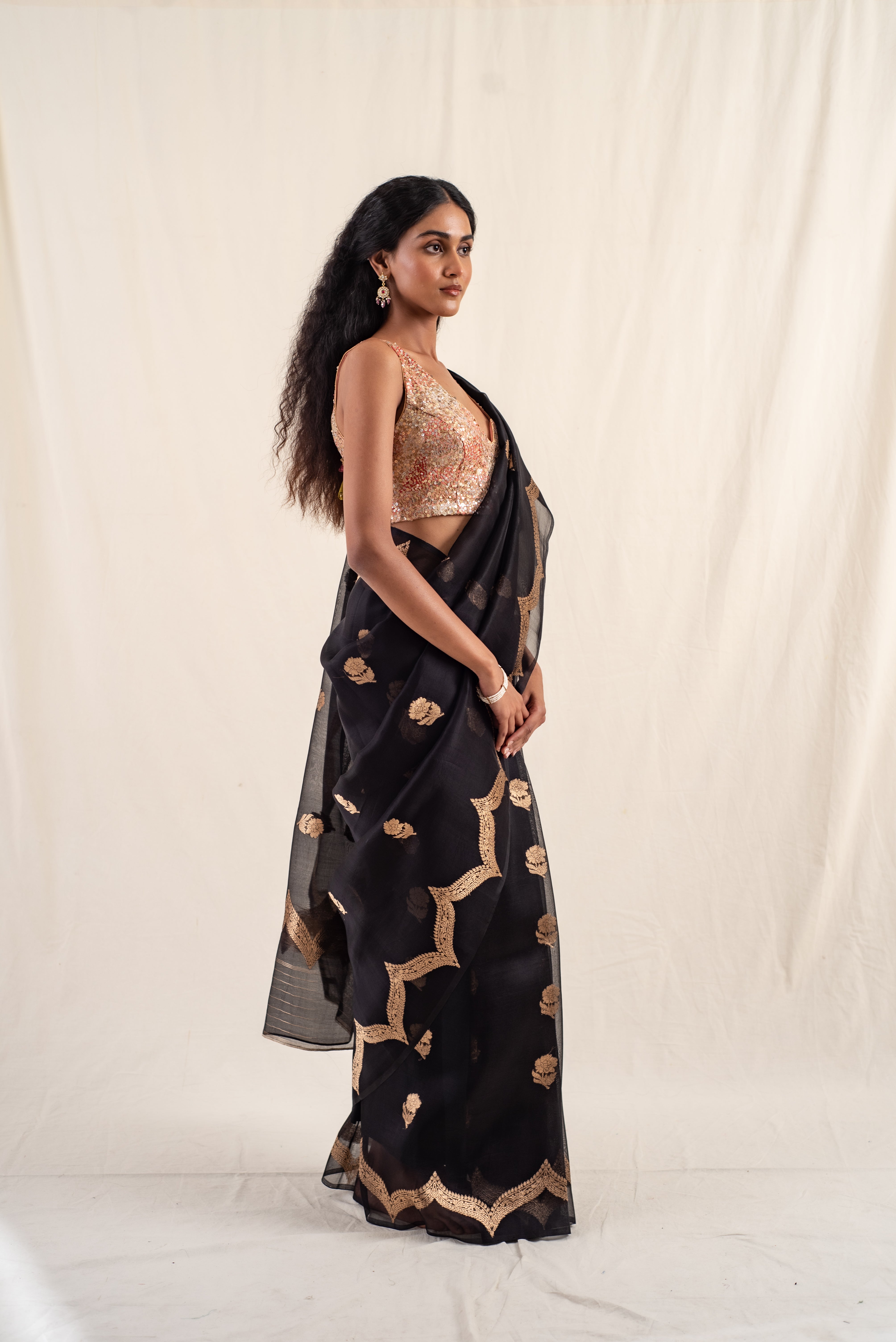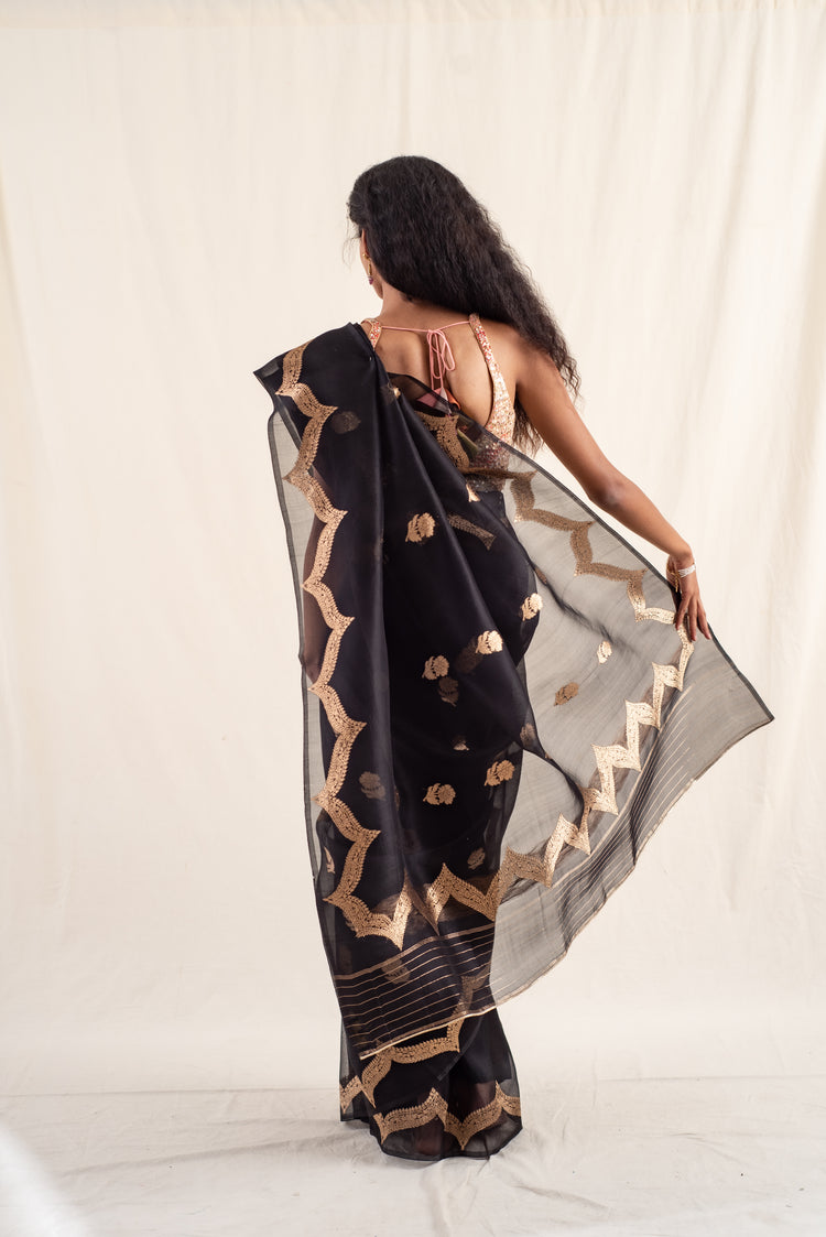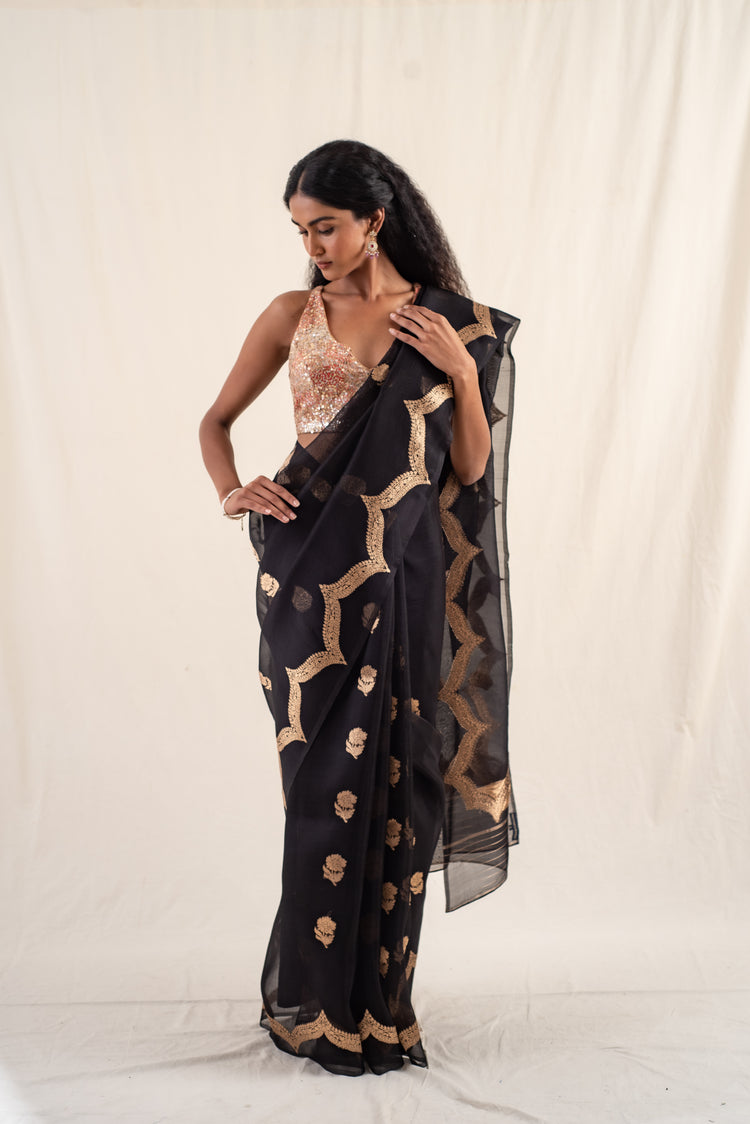 Charcoal black silk organza banarasi saree with gold floral zari buttis and gold arched border