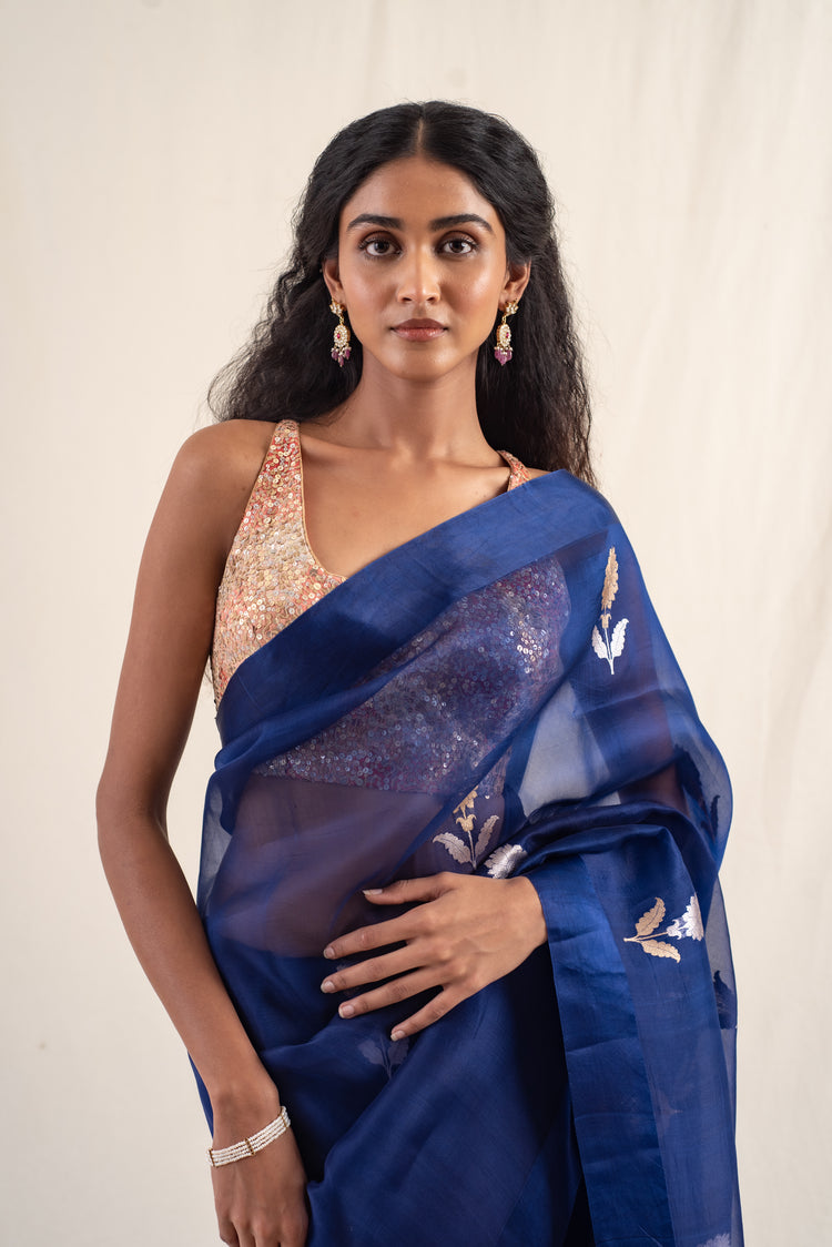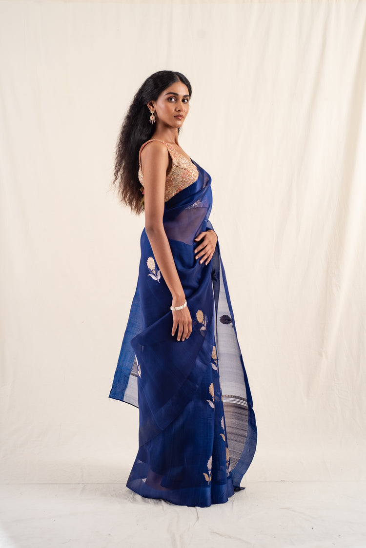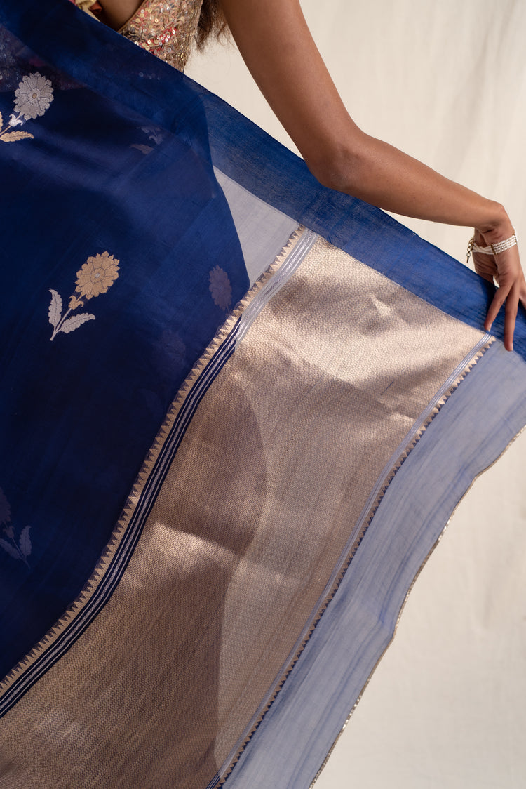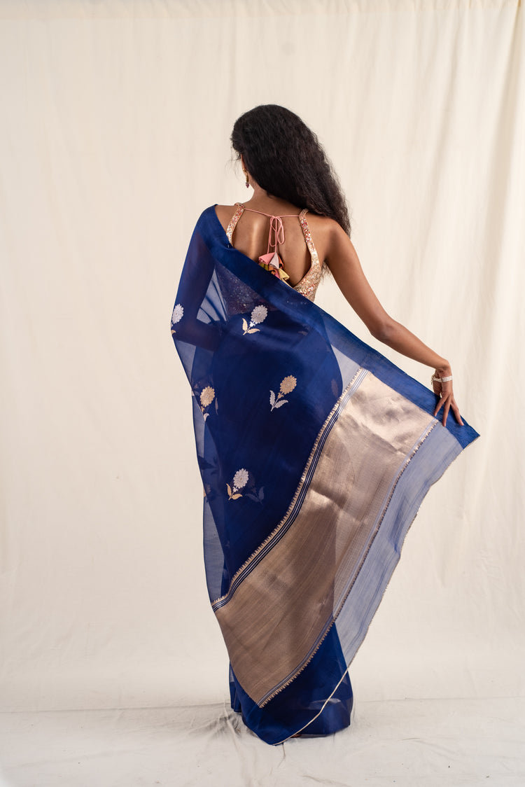 Bonet blue silk organza banarasi saree with gold floral buttis and solid mashroo silk border