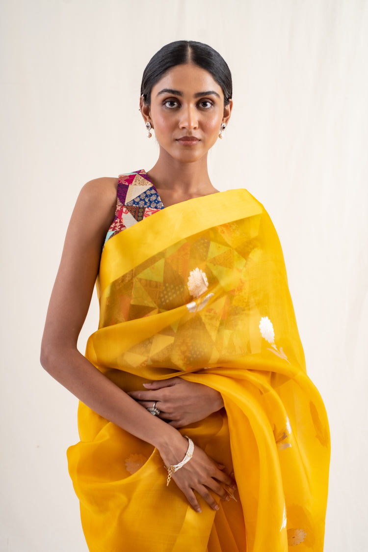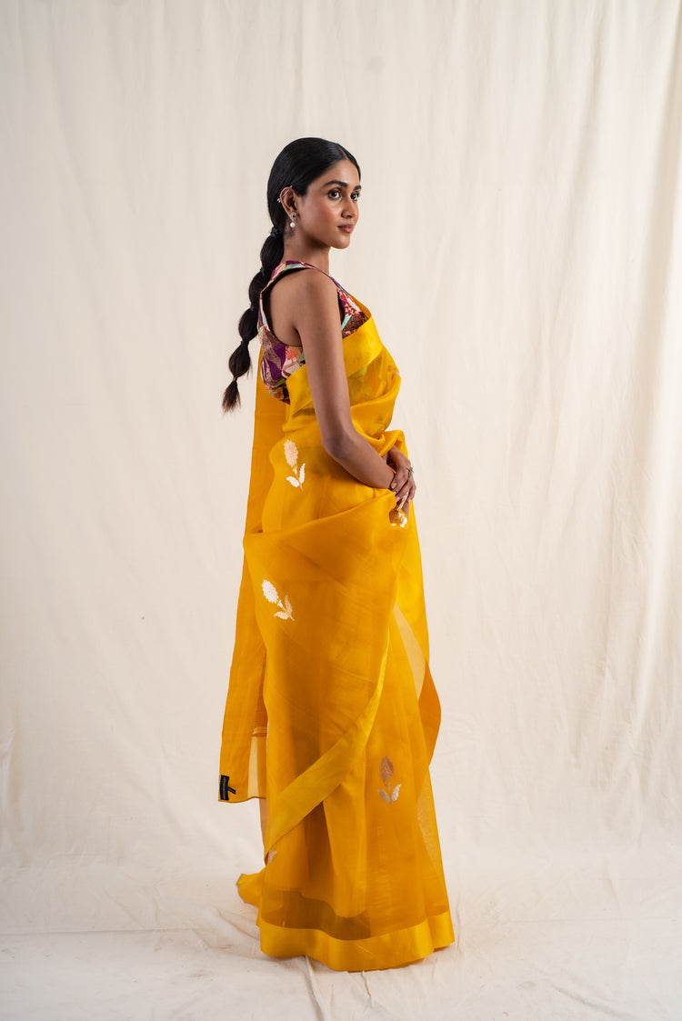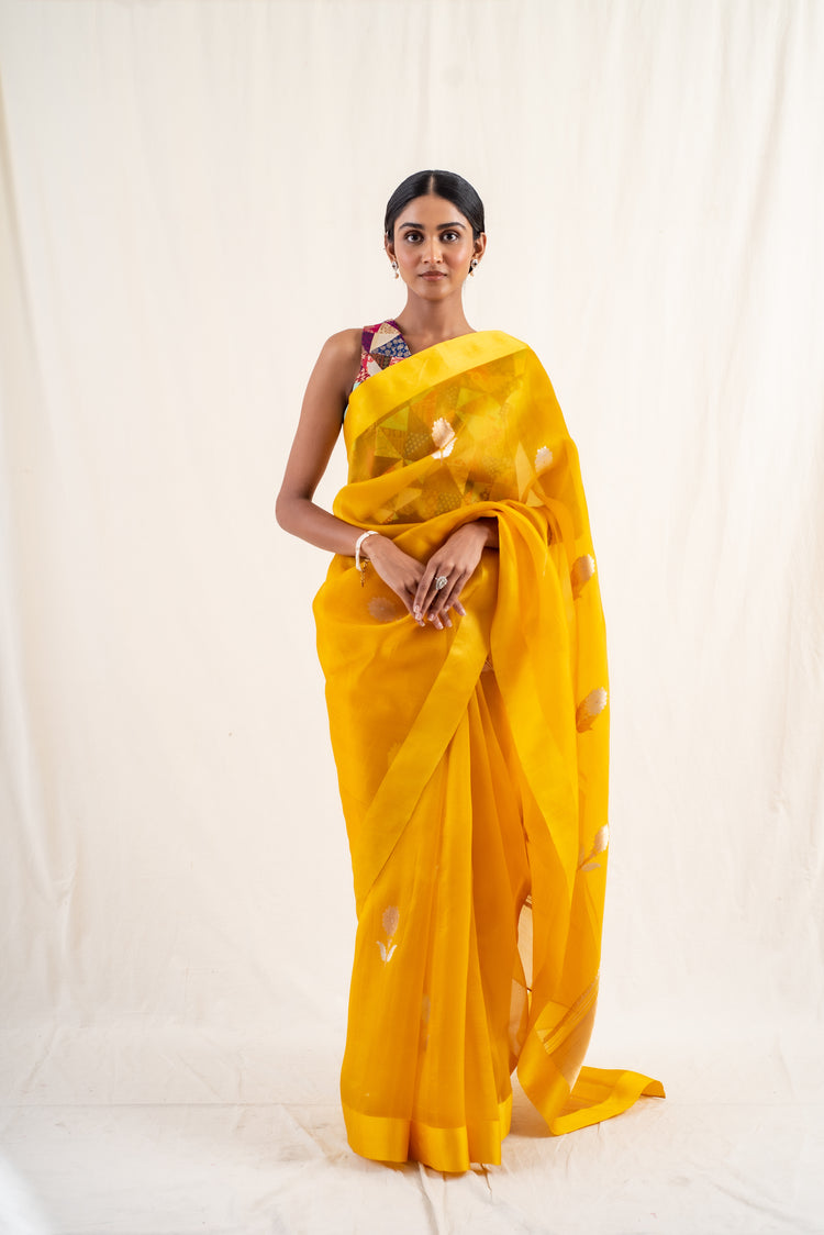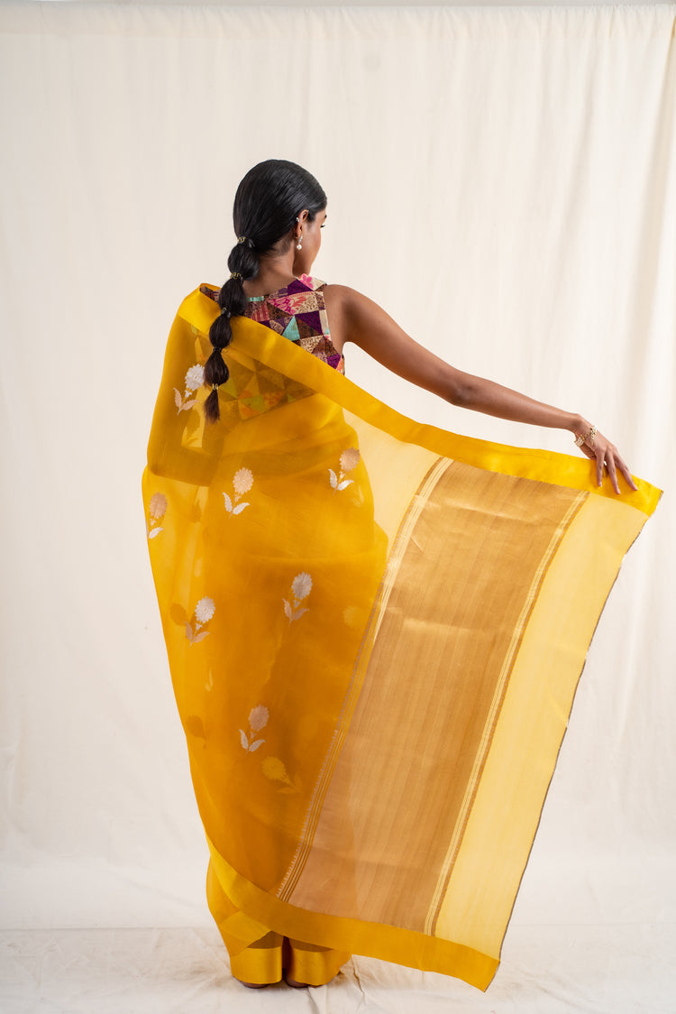 Deep yellow silk organza banarasi saree with gold floral buttis and solid mashroo silk border