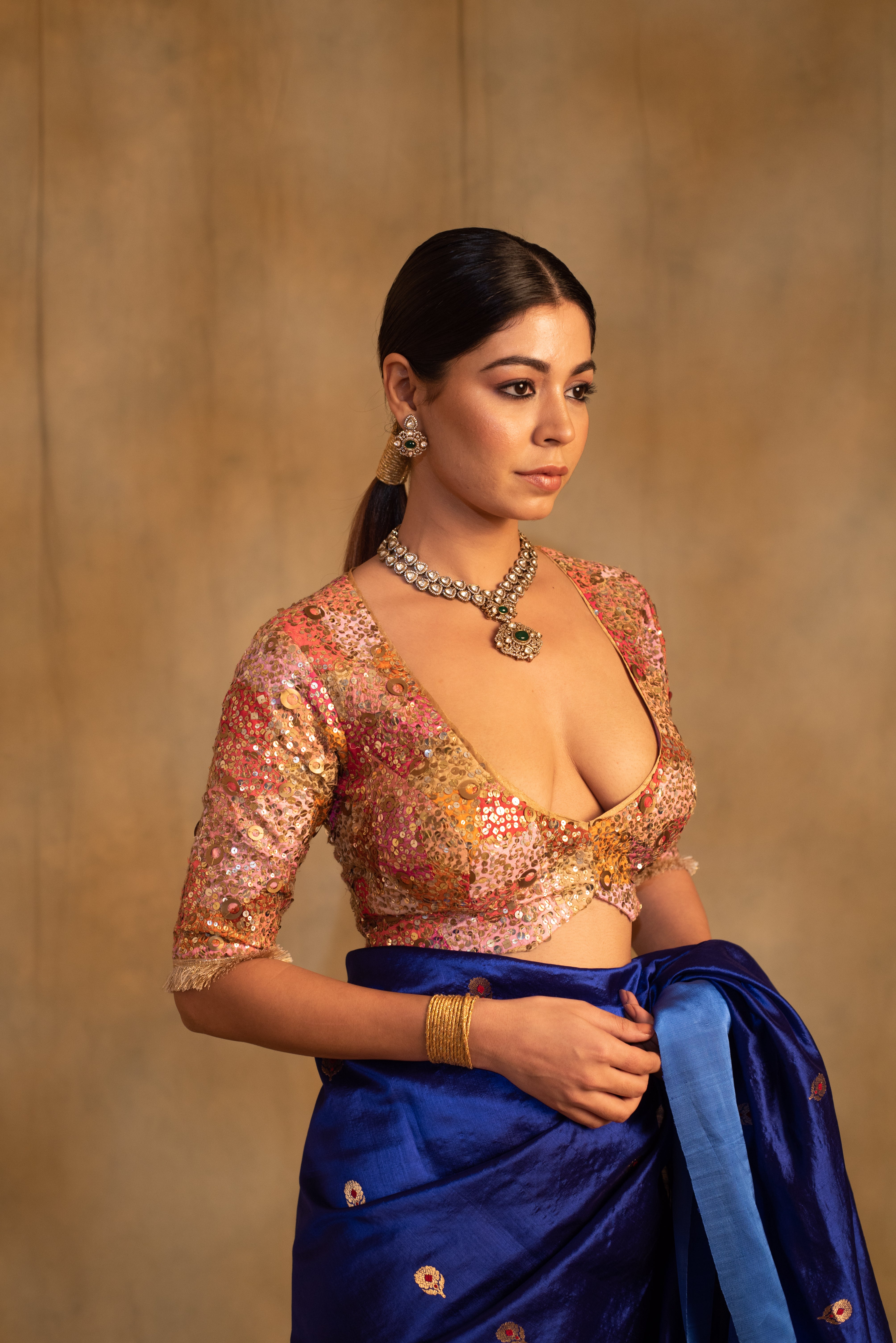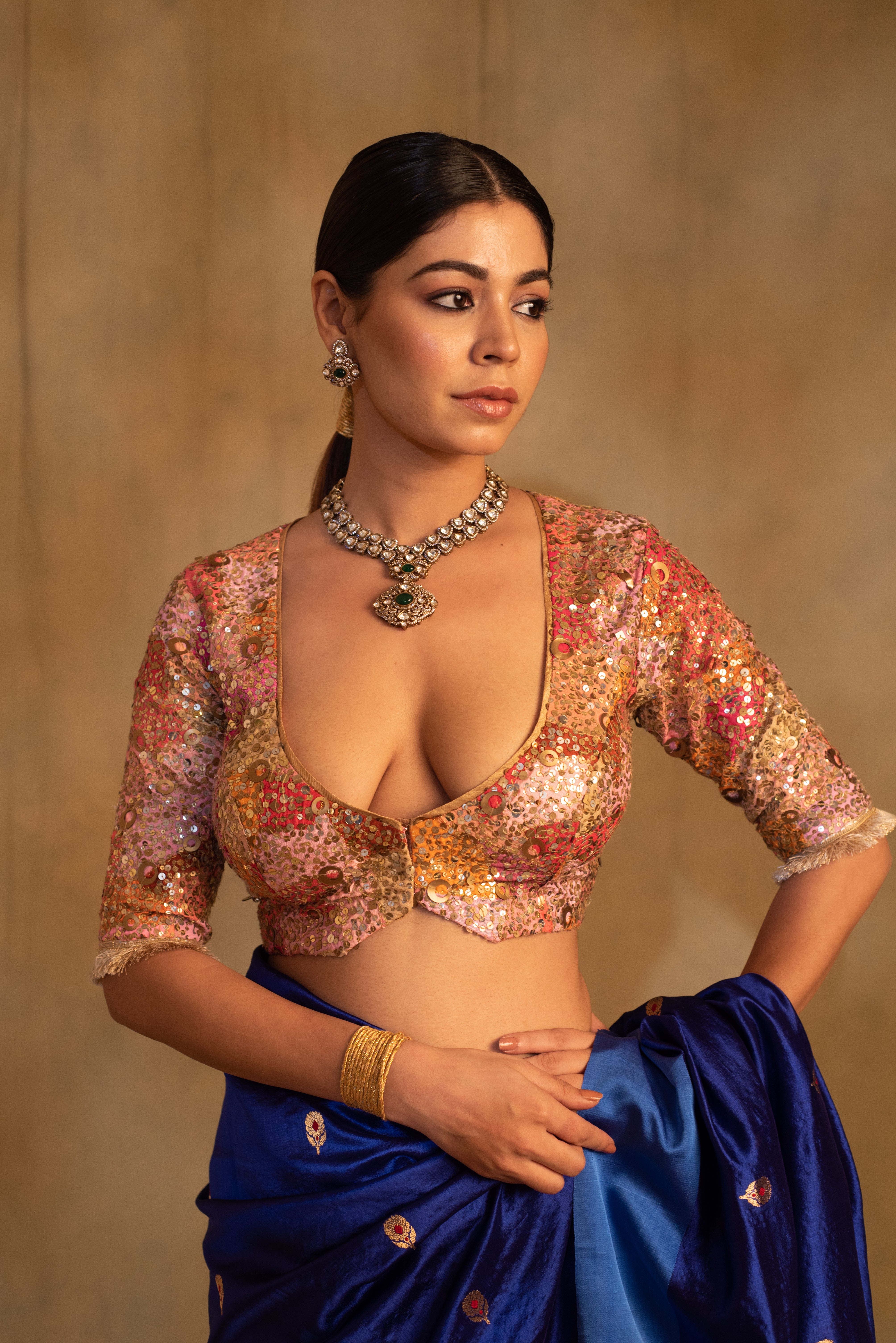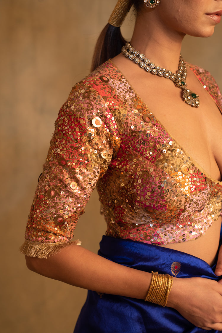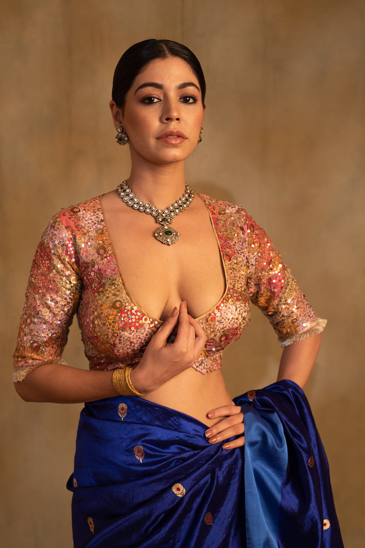 Upcycled scooped neck and three fourth sleeves blouse made with remnants of silk and brocade in variegated shades with hand embroidered sequin clusters all over. The blouse is made with zero waste philosophy.