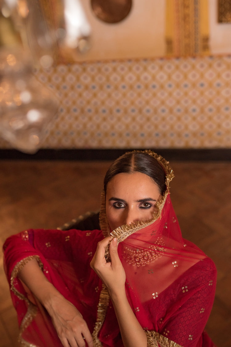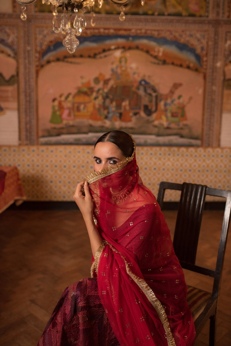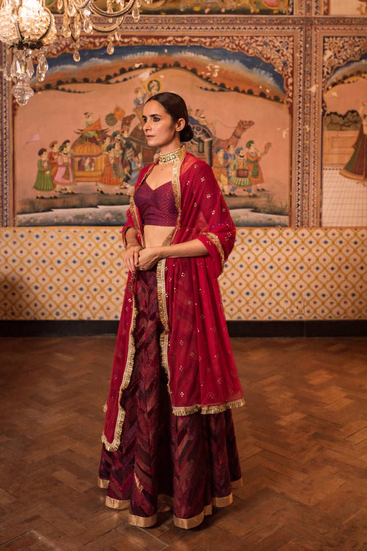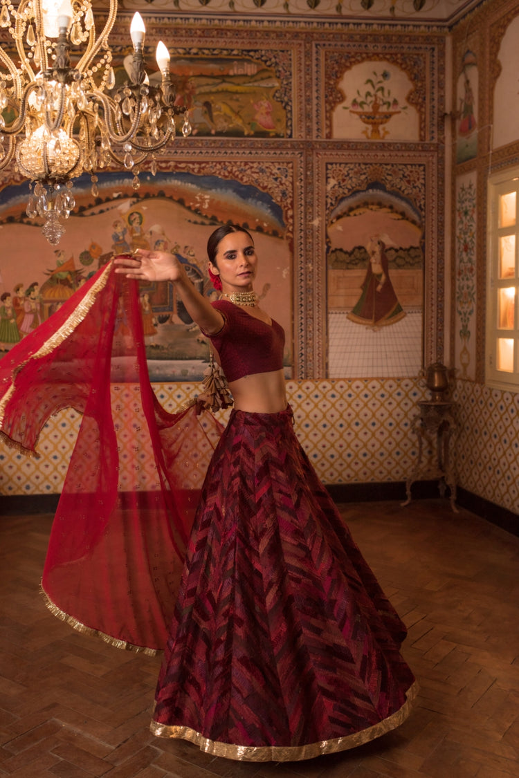 Upcycled patchwork lehenga in shades of burgundy made with remnants of heritage fabrics like silks, cottons, prints, brocades and handwoven tissues. The lehenga is paired with Reecha, red khan blouse and tulle dupatta with hand embroidered makaish and kiran.