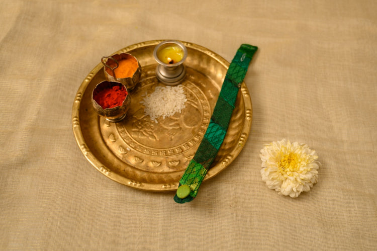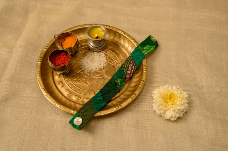 Upcycled patchwork Rakhis made from textile remnants in shades of Green. It features a button and eye closure, allowing for easy size adjustment and ensuring a comfortable fit for any wrist.