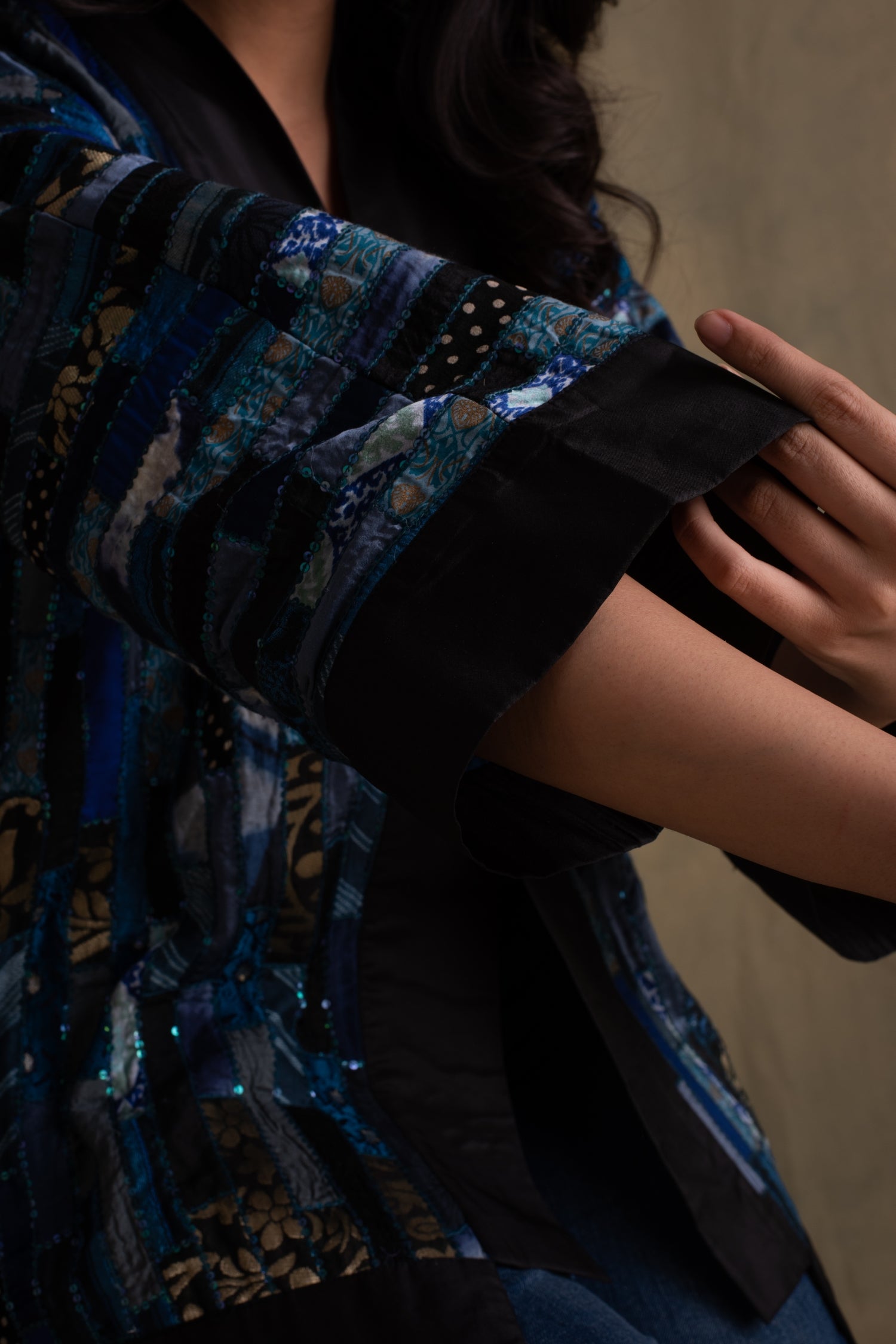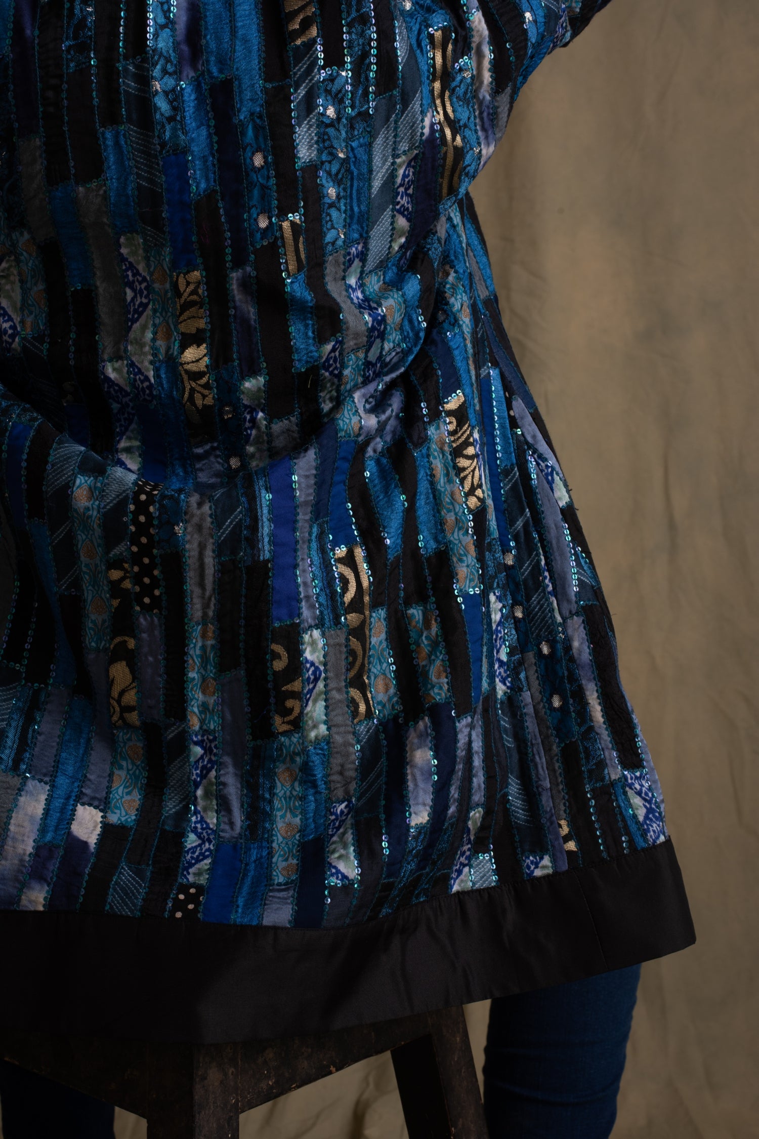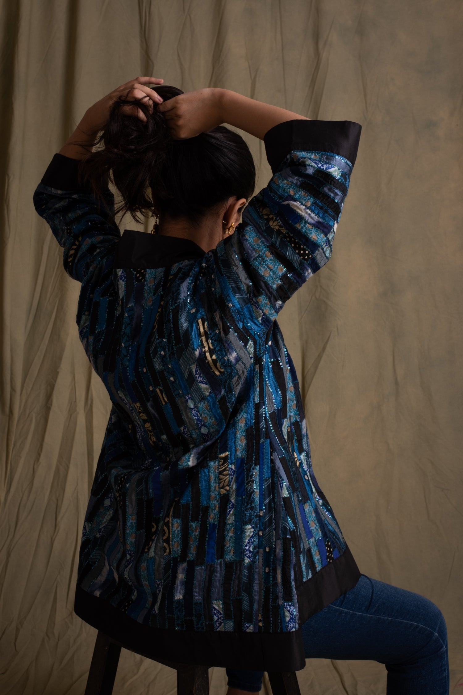 Upcycled patchwork jacket made in shades of blue, with the remnants of heritage fabrics and embroideries like chikankari, brocades, satins, silks, prints and hand weaves in shades of blue .Each unit is further hand embroidered with sequins.