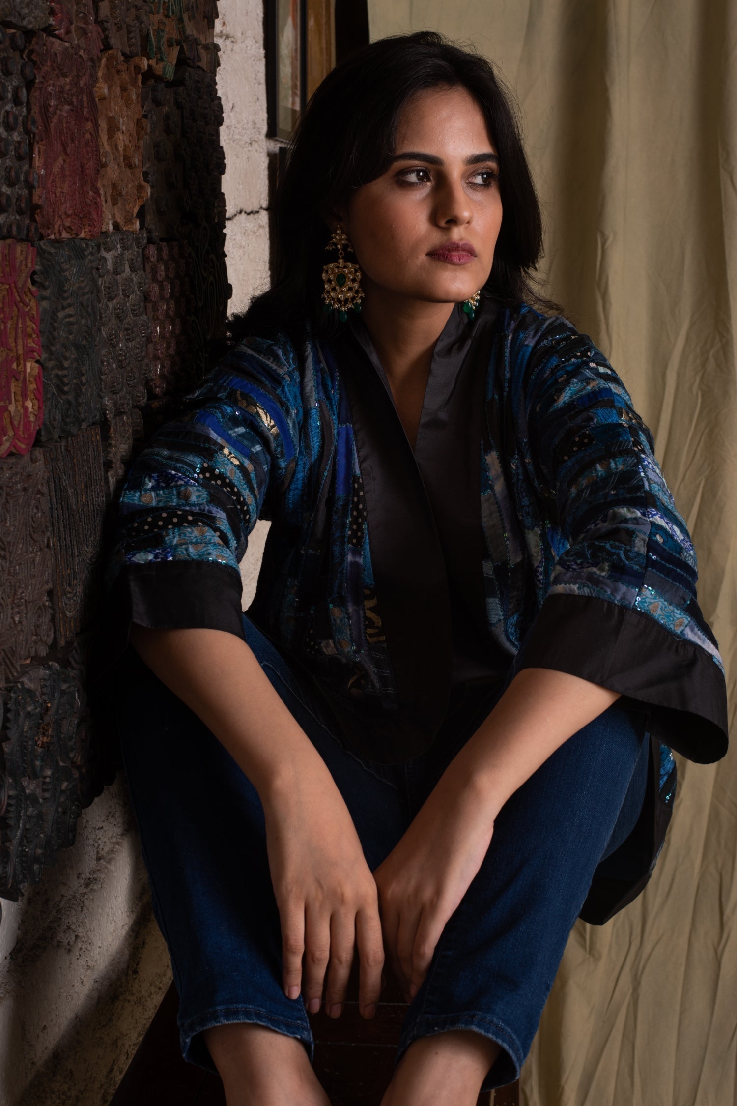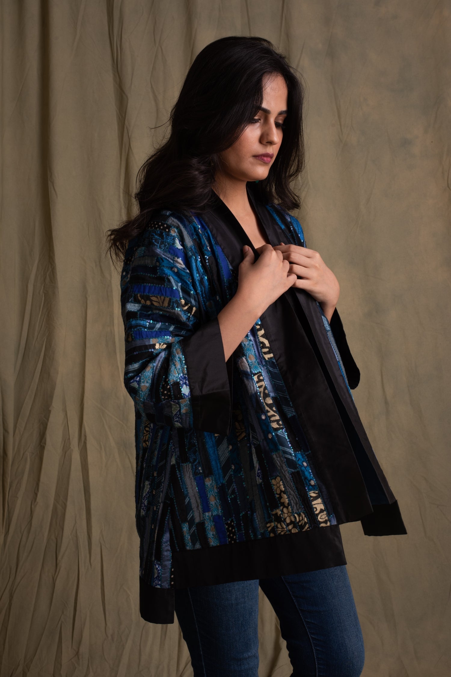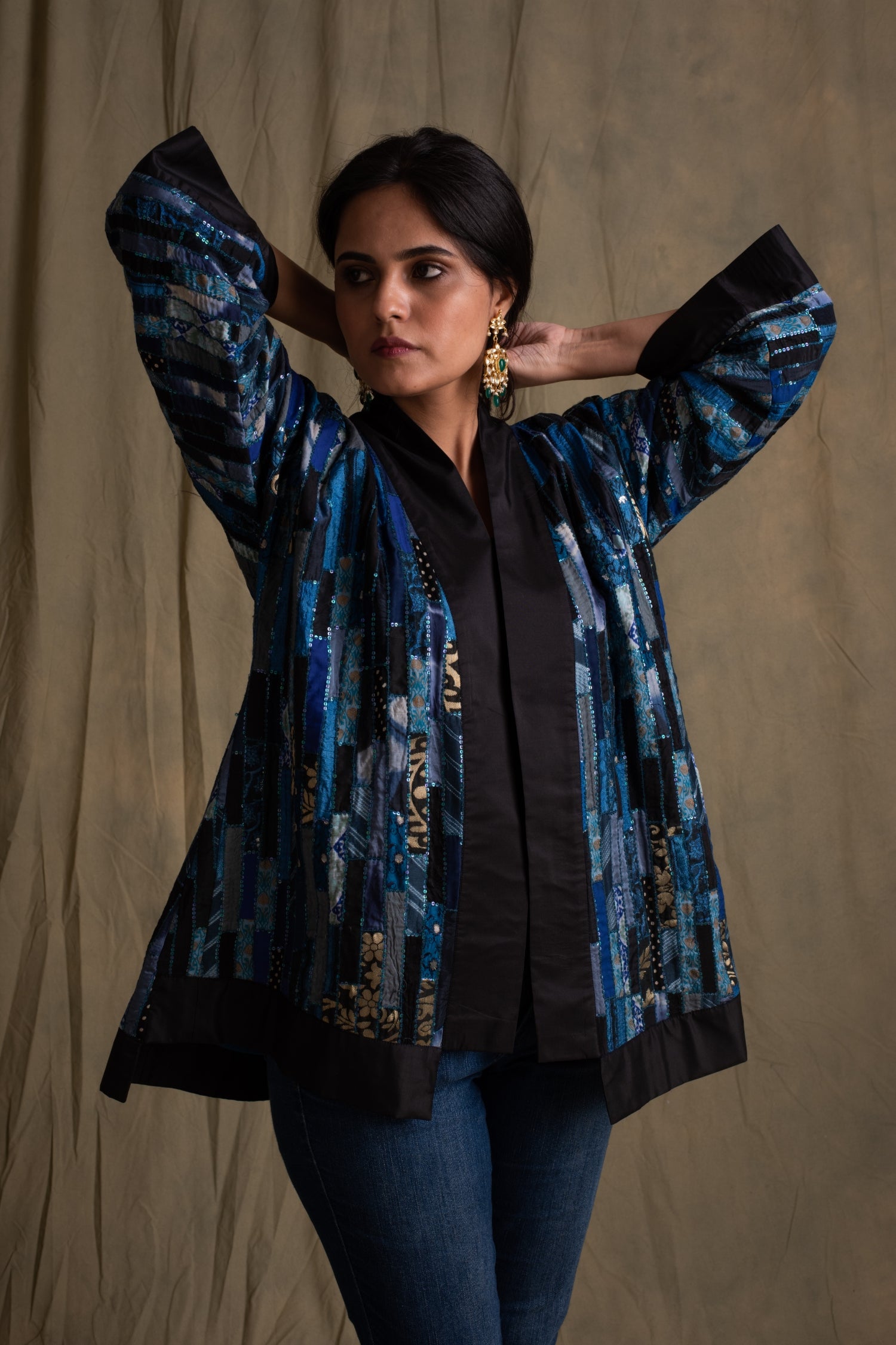 Upcycled patchwork jacket made in shades of blue, with the remnants of heritage fabrics and embroideries like chikankari, brocades, satins, silks, prints and hand weaves in shades of blue .Each unit is further hand embroidered with sequins.