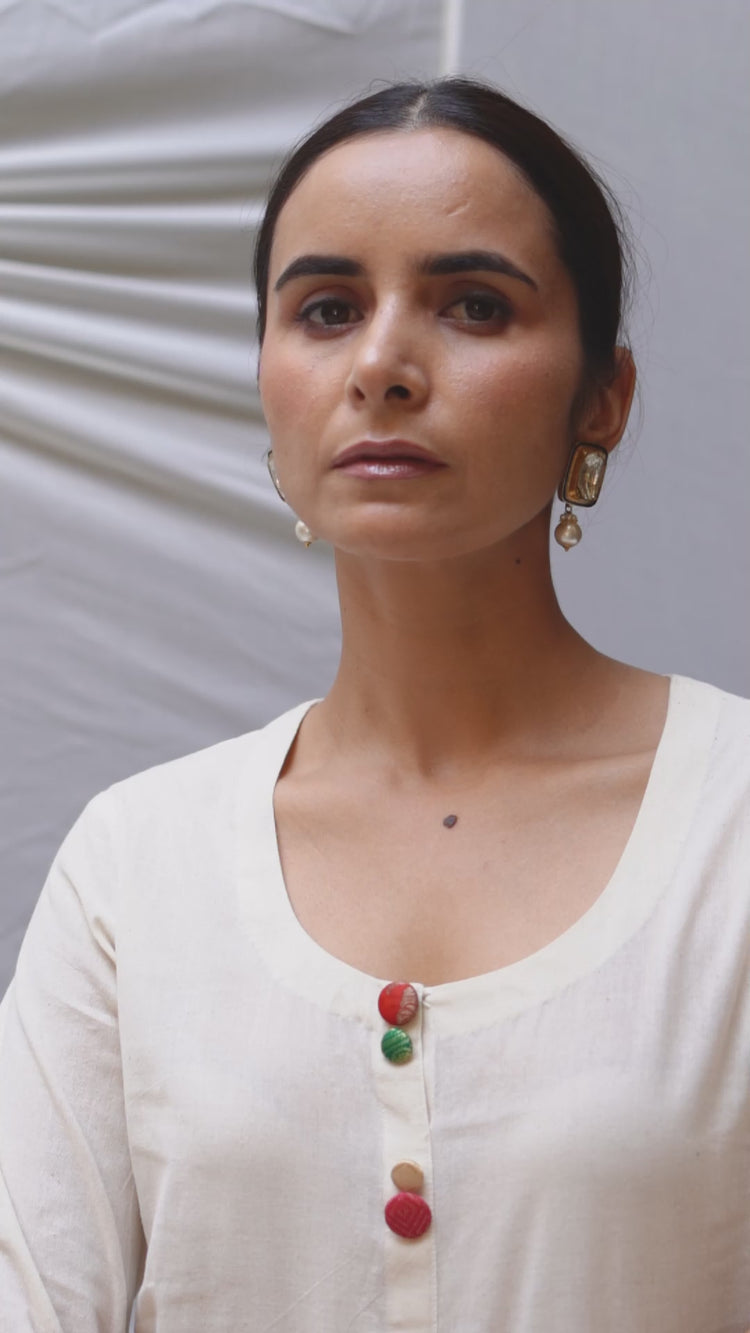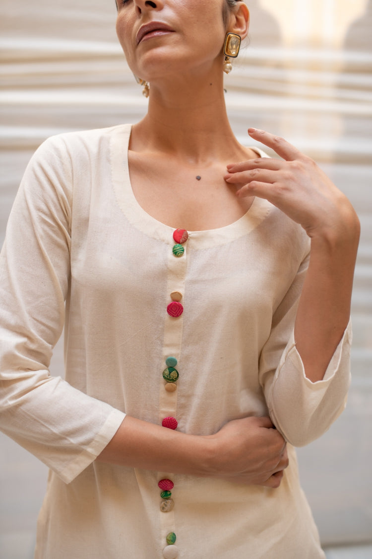 Ivory khadi cotton kurta and pant with hand crafted brocade buttons made with zero waste philosophy.