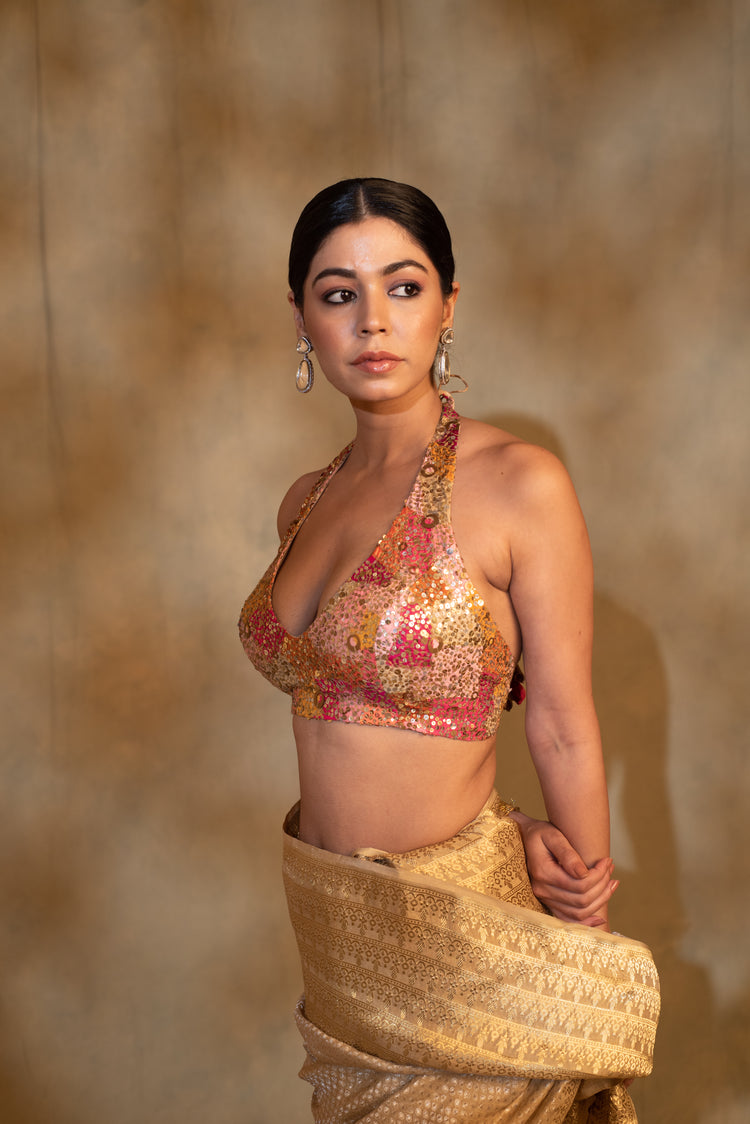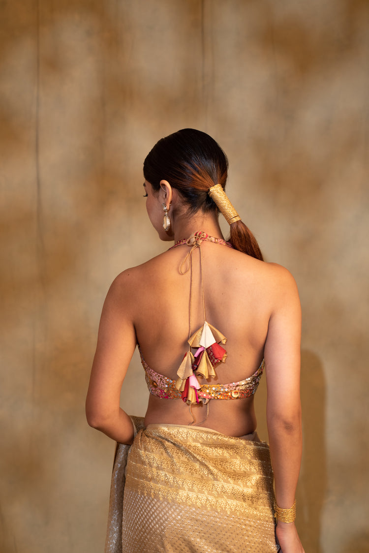 Upcycled bikini blouse made with remnants of silk and brocade in variegated shades with hand embroidered sequin clusters all over. The blouse is adorned with hand crafted tassels made with zero waste philosophy.