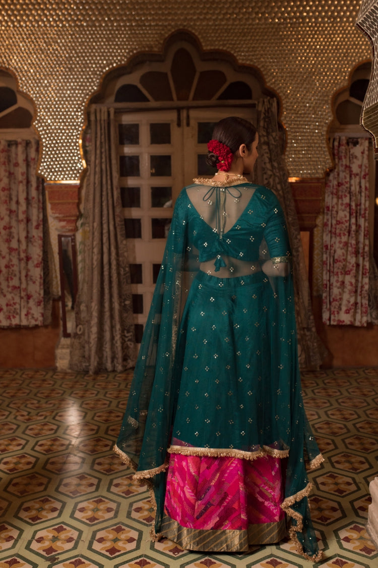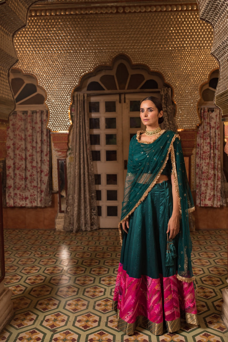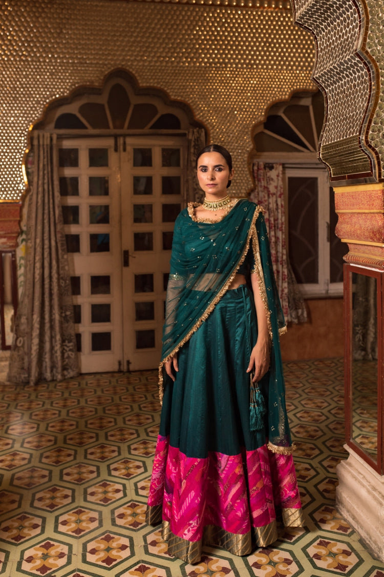 Teal chanderi silk lehanga with upcycled patchwork detail in shades of pink made with remnants of heritage fabrics like silks, cottons, prints, brocades and handwoven tissues.The lehanga is paired with teal blouse and tulle dupatta with hand embroidered makaish and kiran.